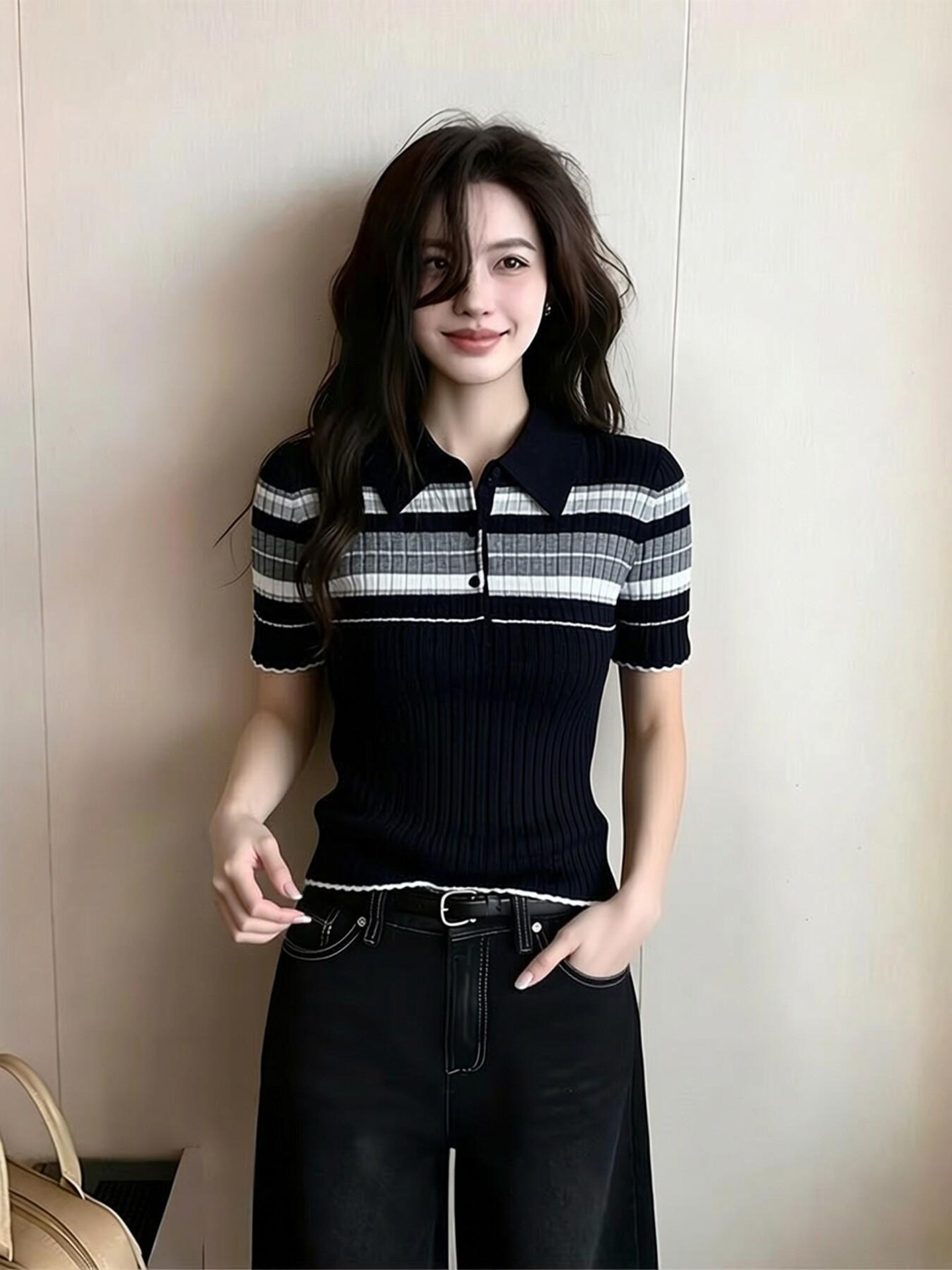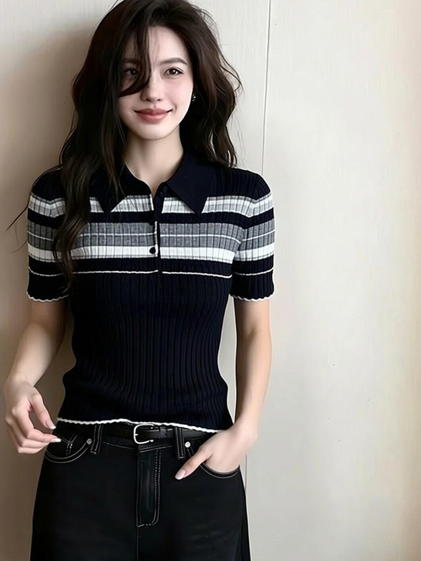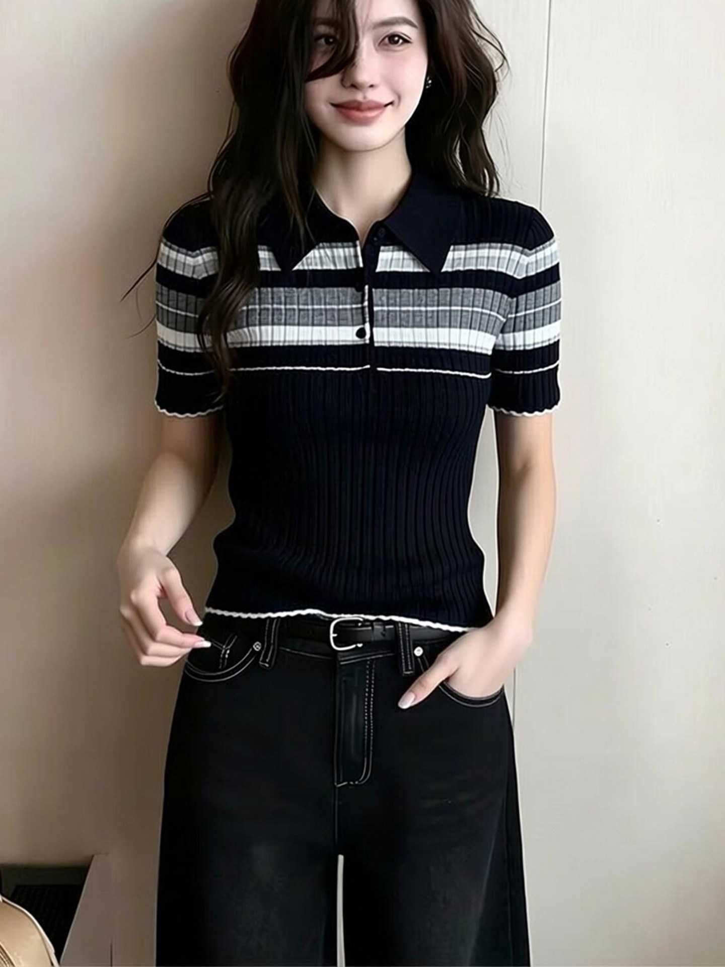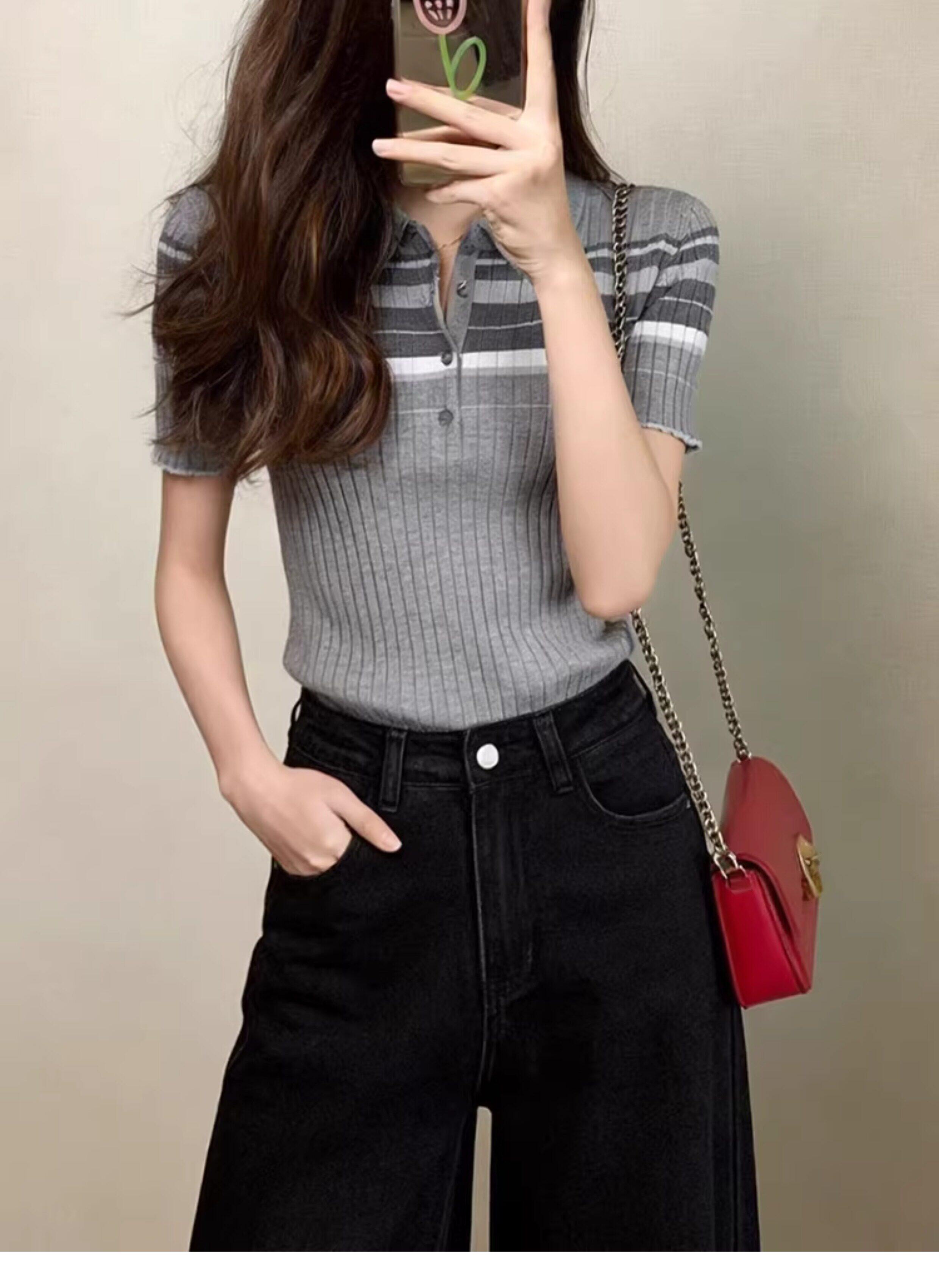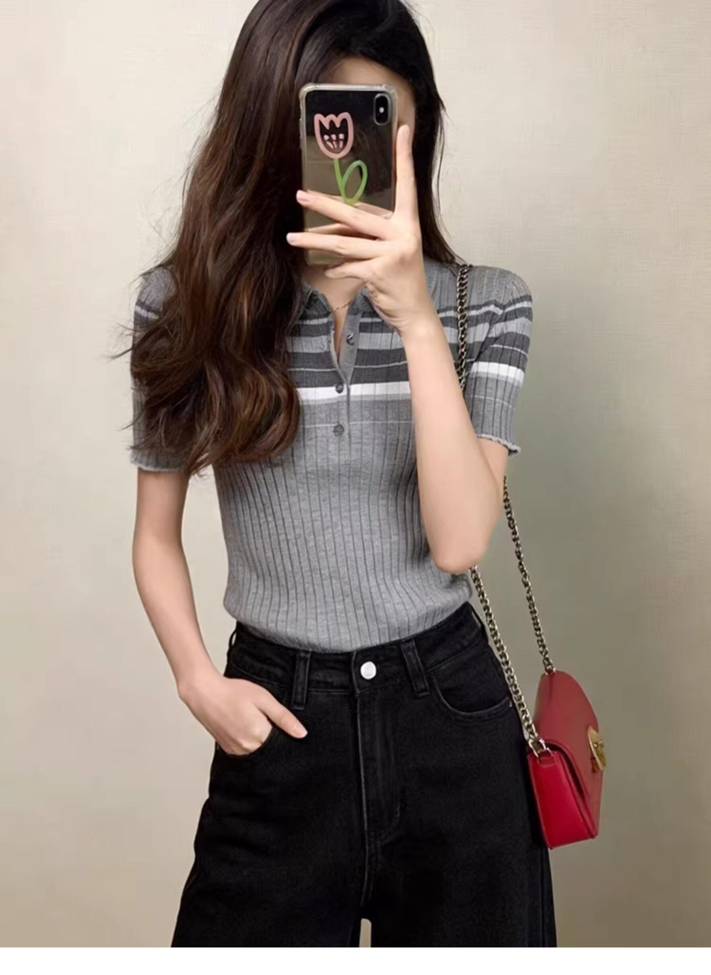 学院风条纹翻领短袖针织衫女2026夏季新款上衣撞色polo领气质显瘦