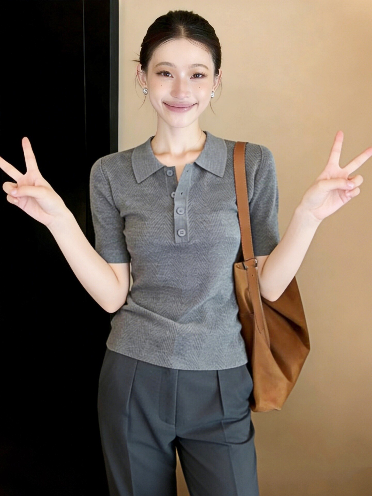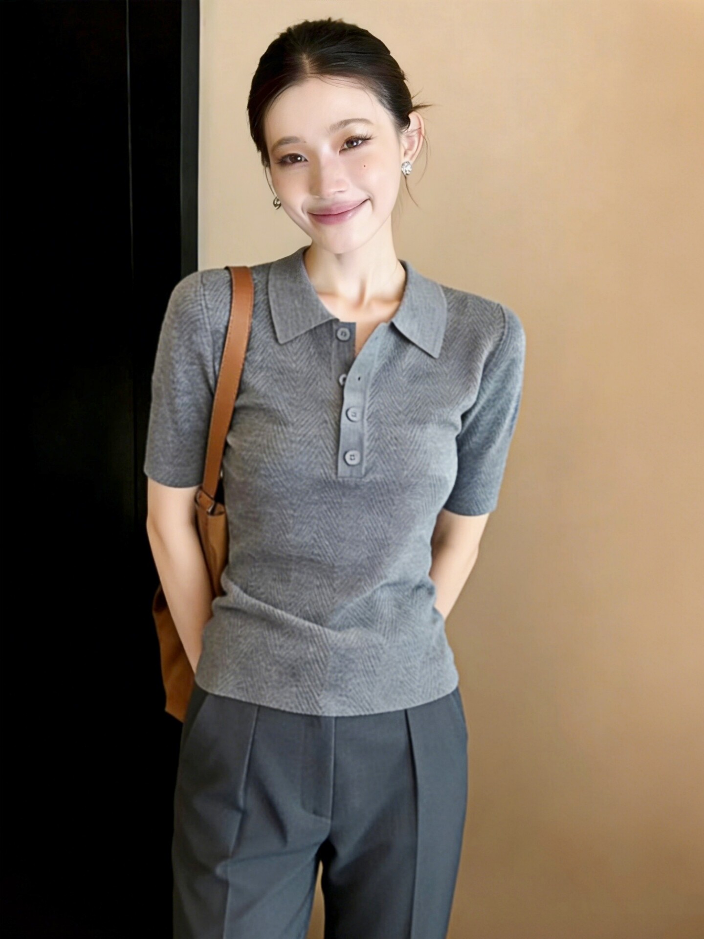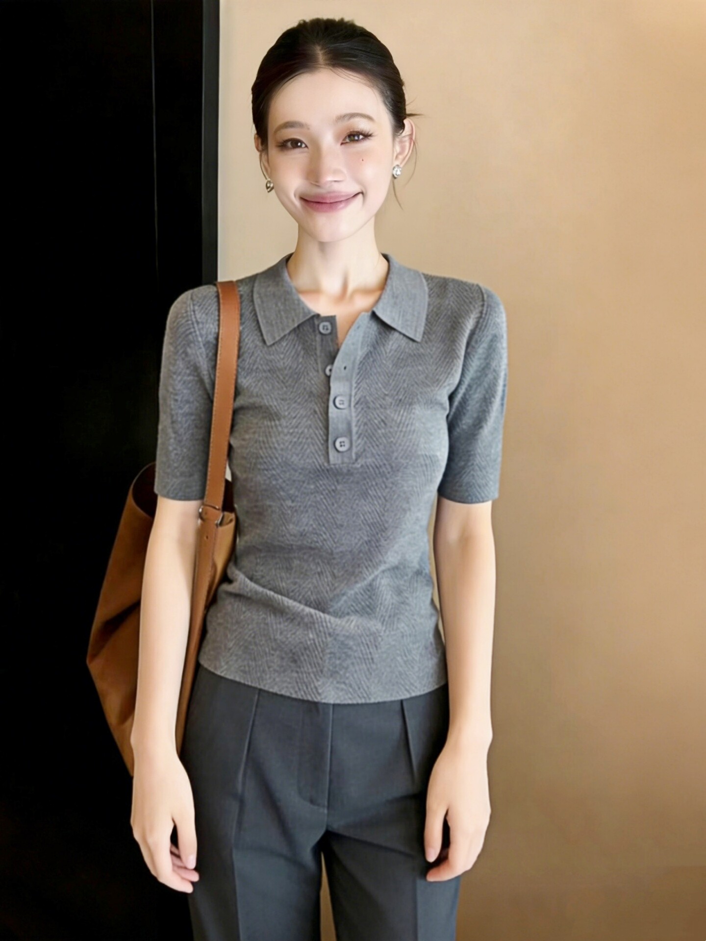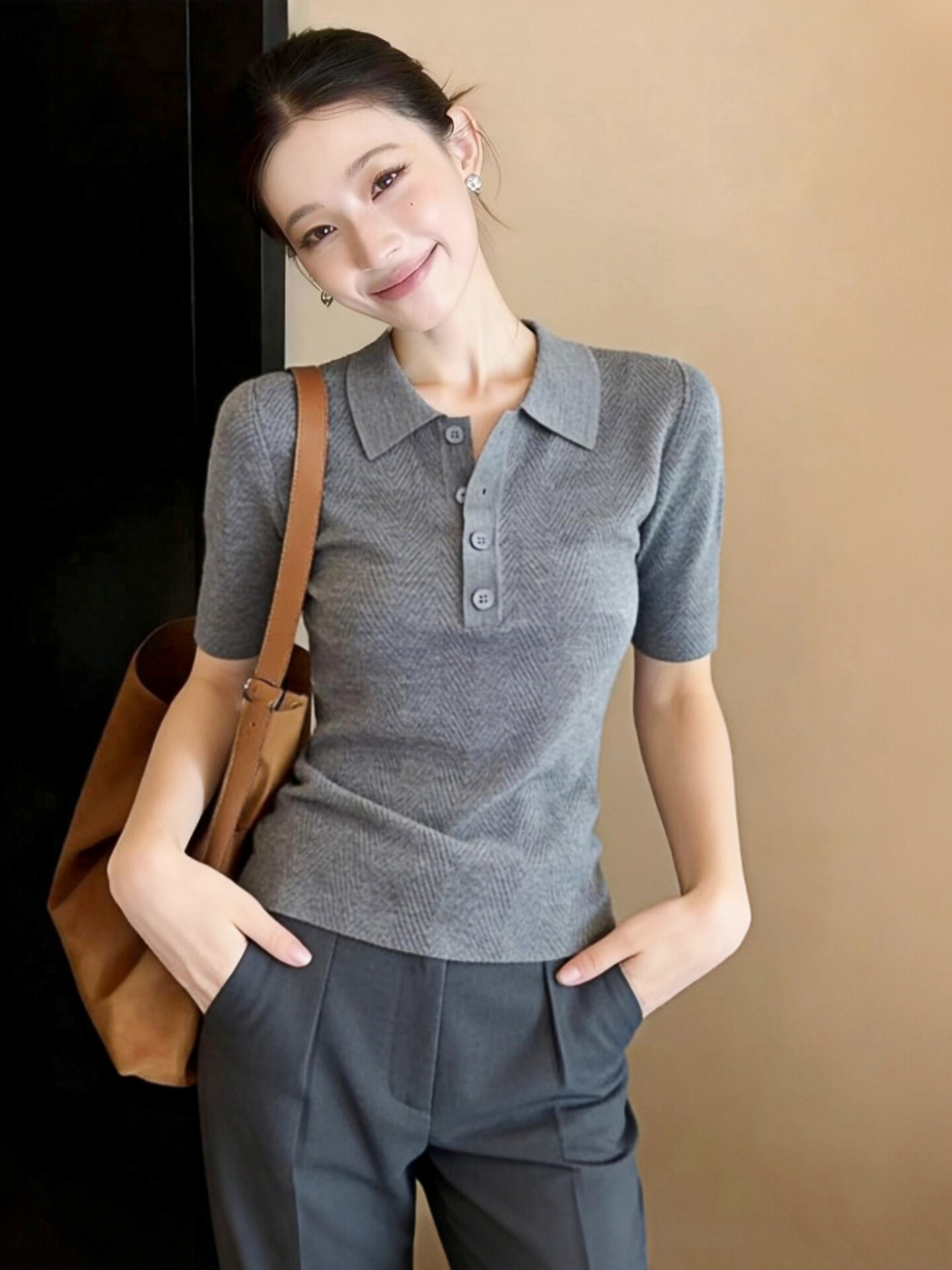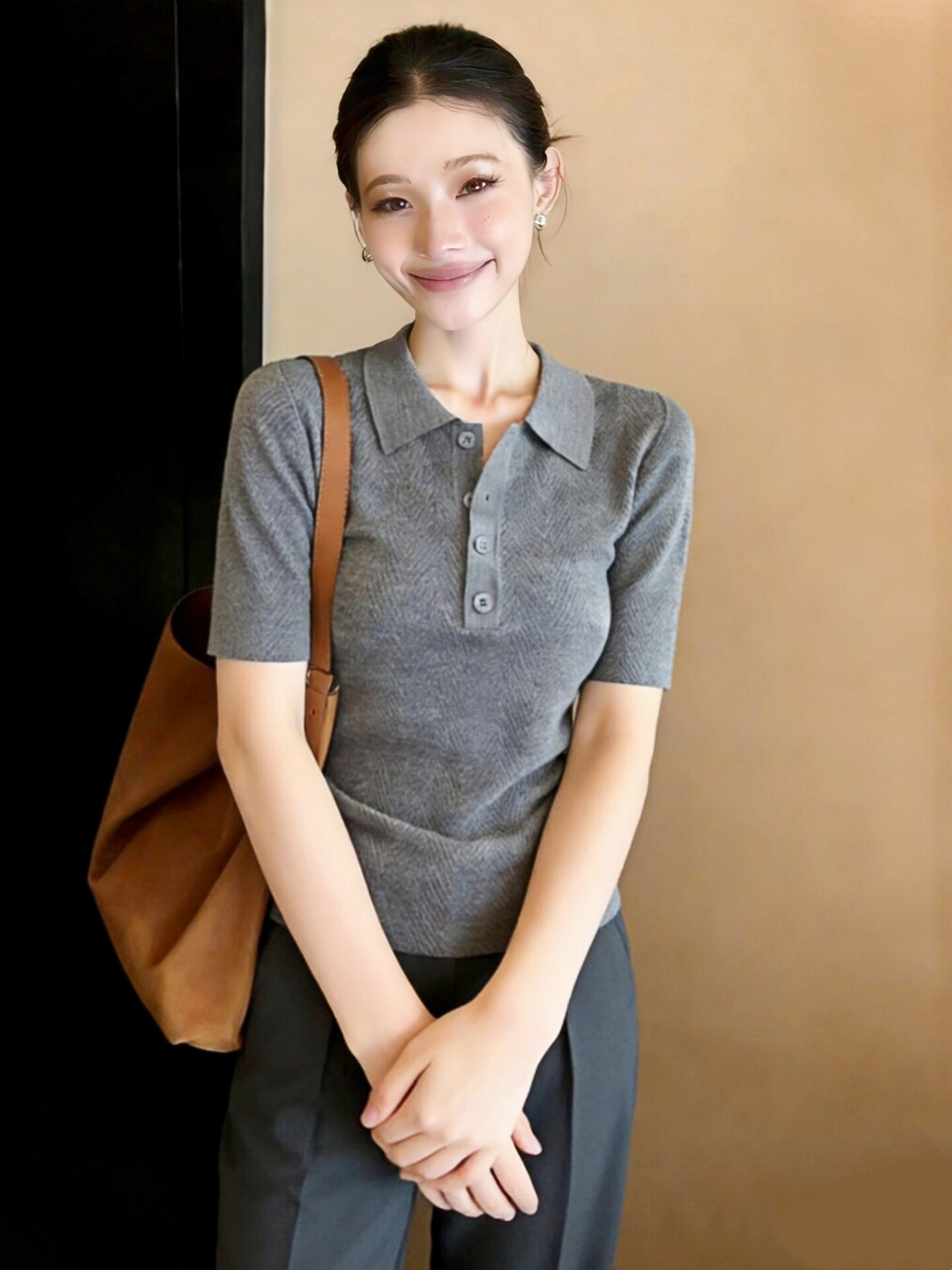 灰色翻领短袖针织衫女装春装2026新款韩系高级感气质女士上衣毛衣