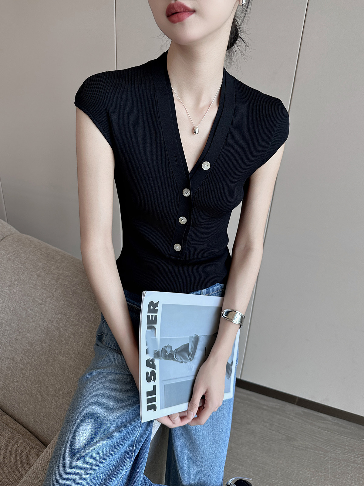 PINKEEN黑色V领针织短袖T恤女夏季2026新款修身时尚简约气质上衣