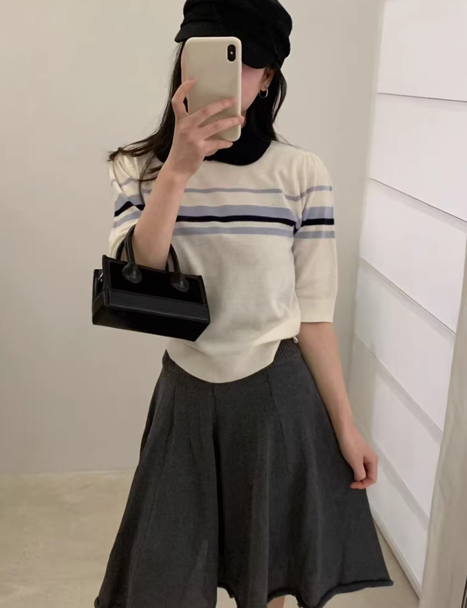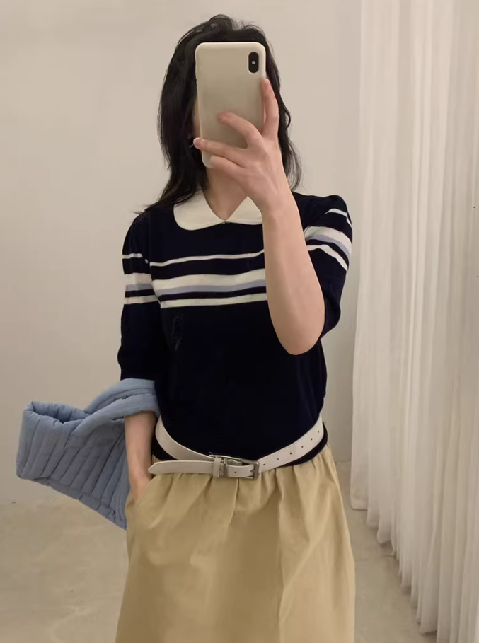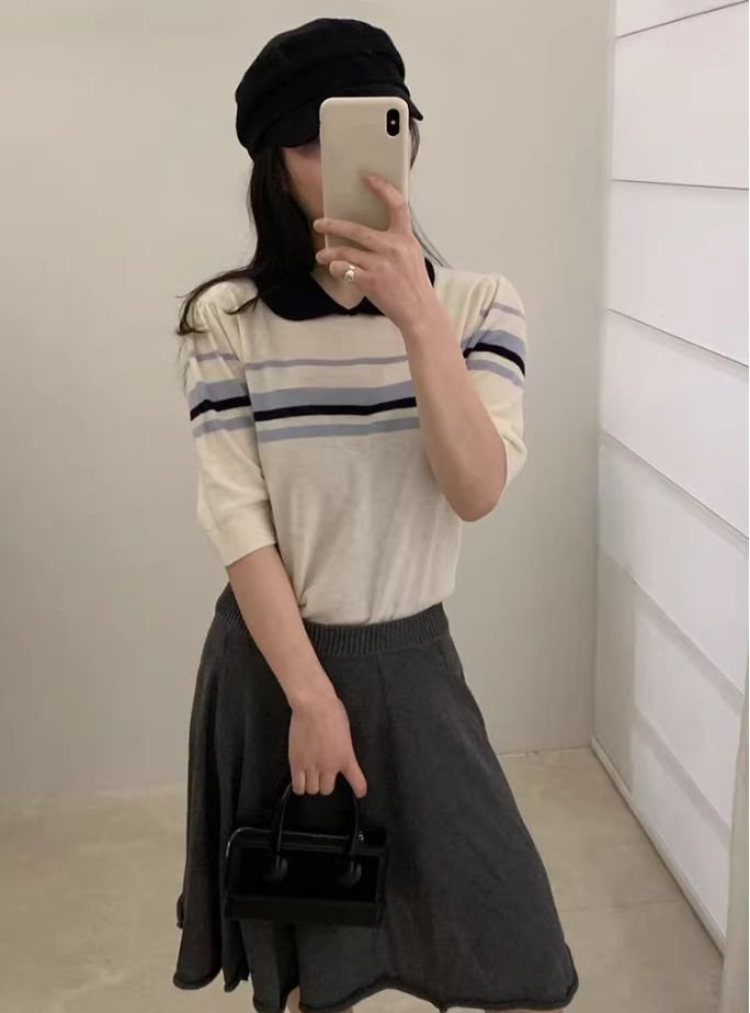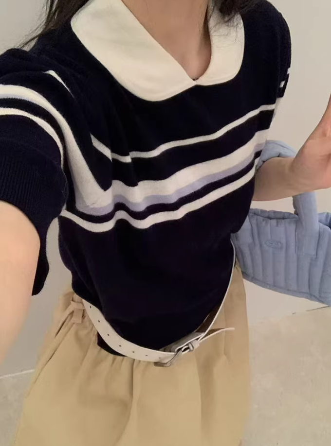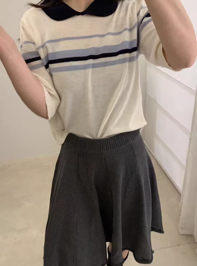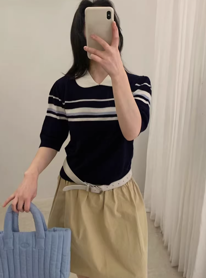 已出货 miu系条纹撞色polo翻领套头短袖针织衫女2026夏季短袖上衣