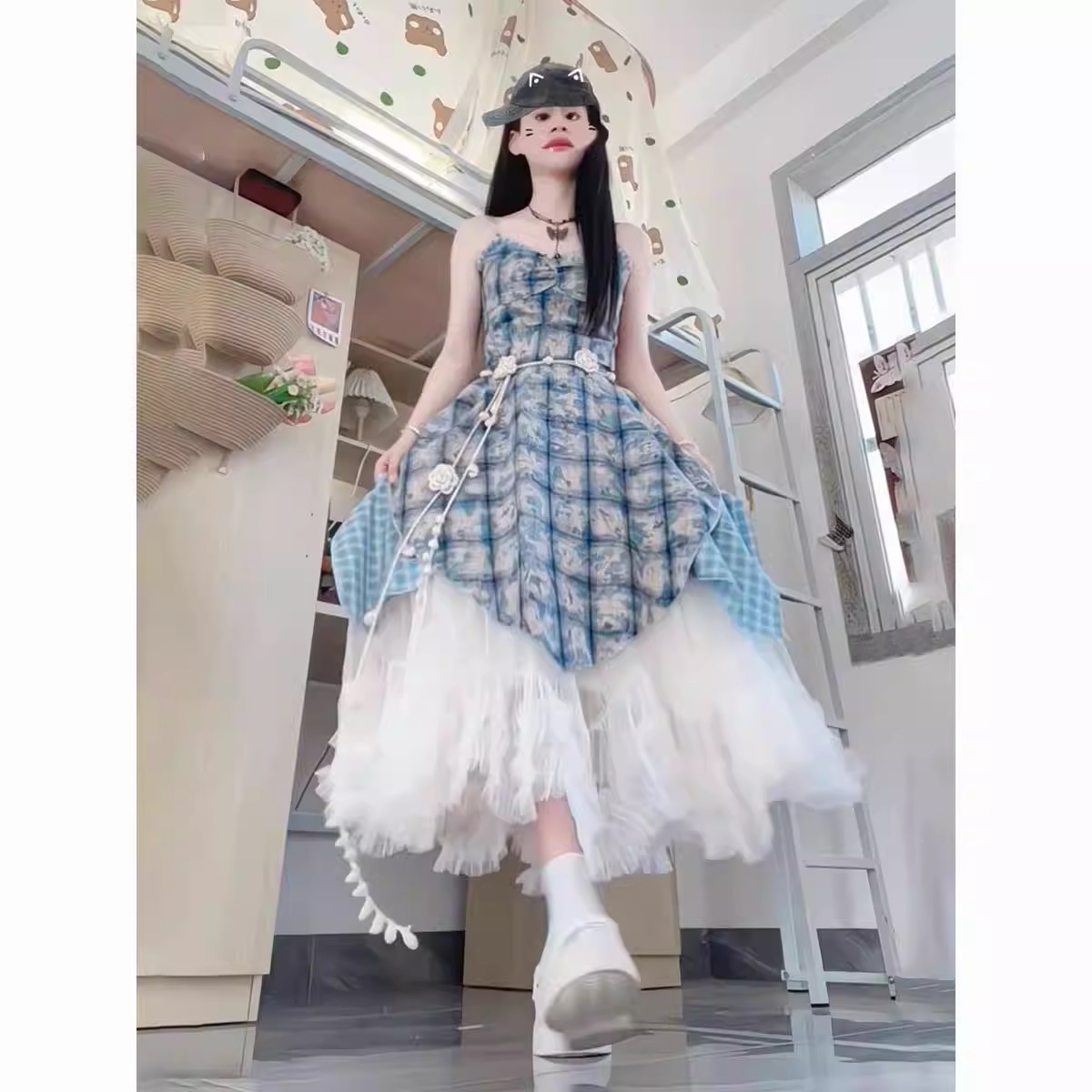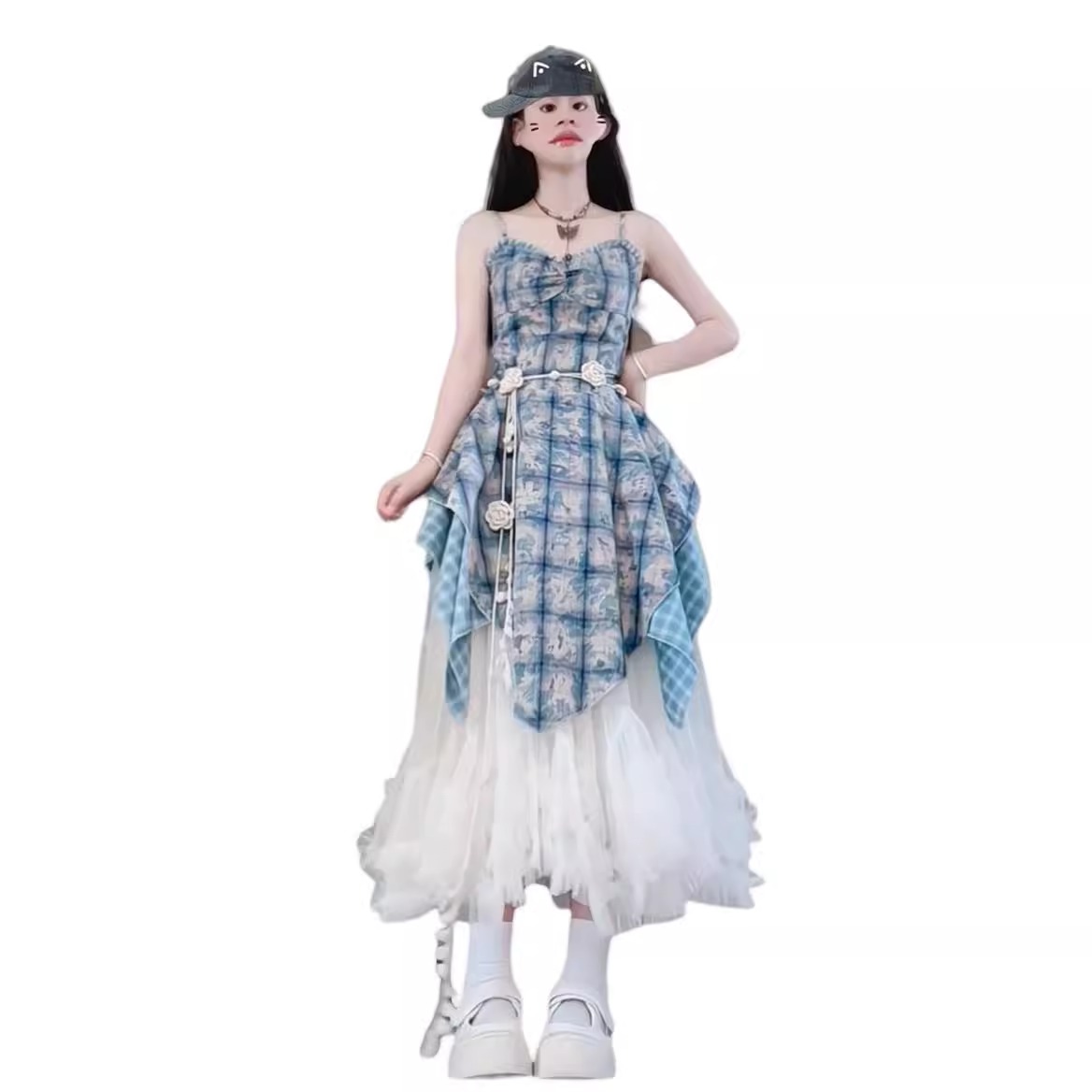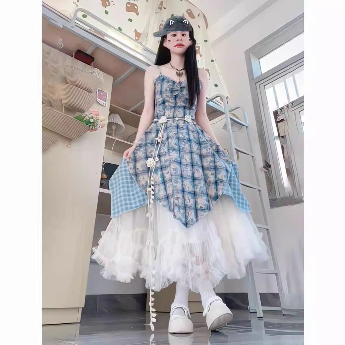 日系复古高级感不规则设计吊带连衣裙搭配蕾丝拼接半身裙两件套装