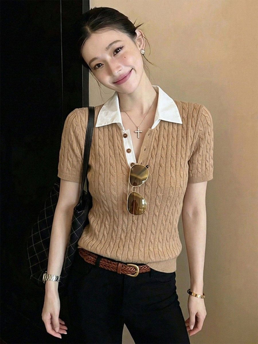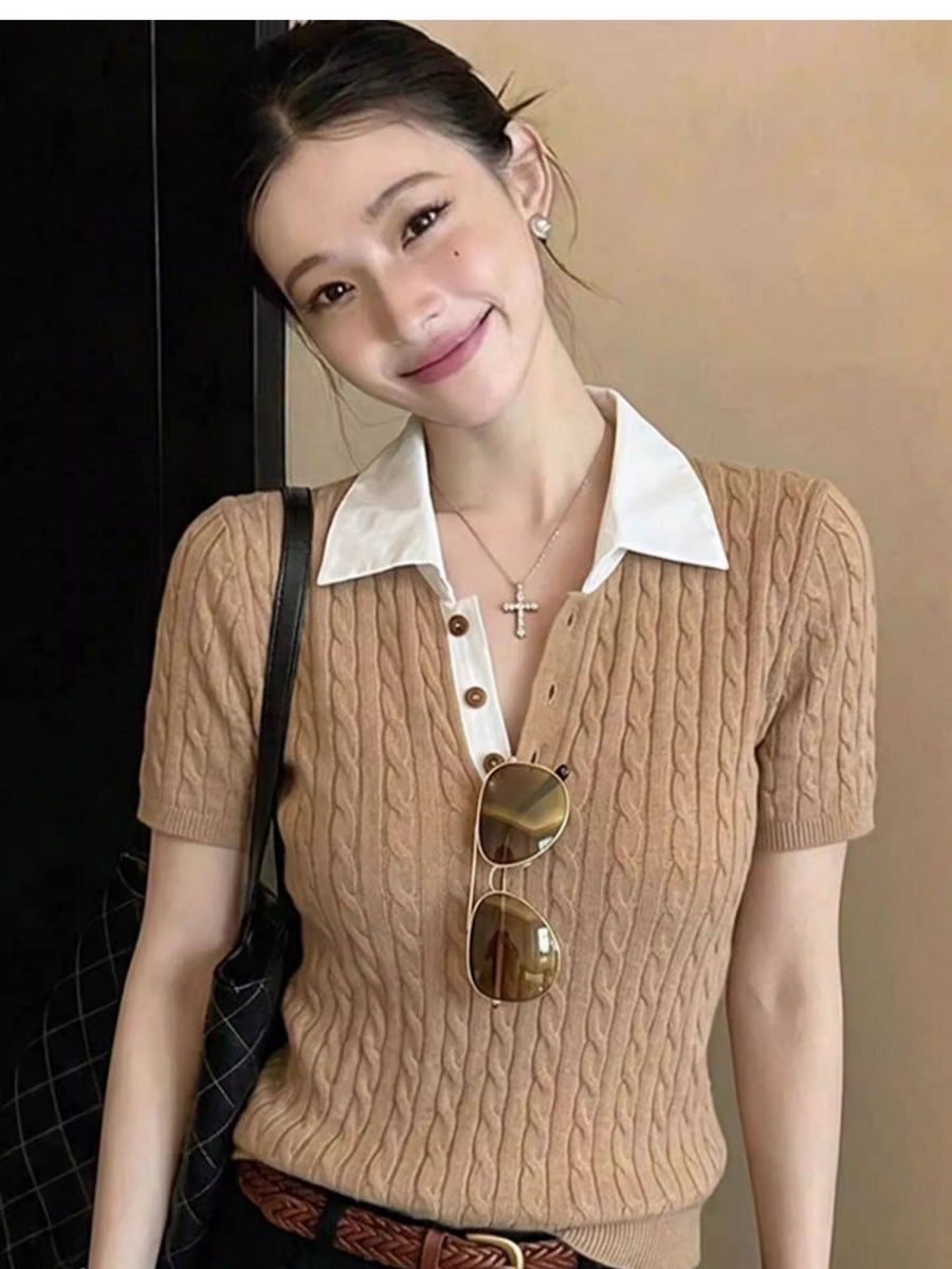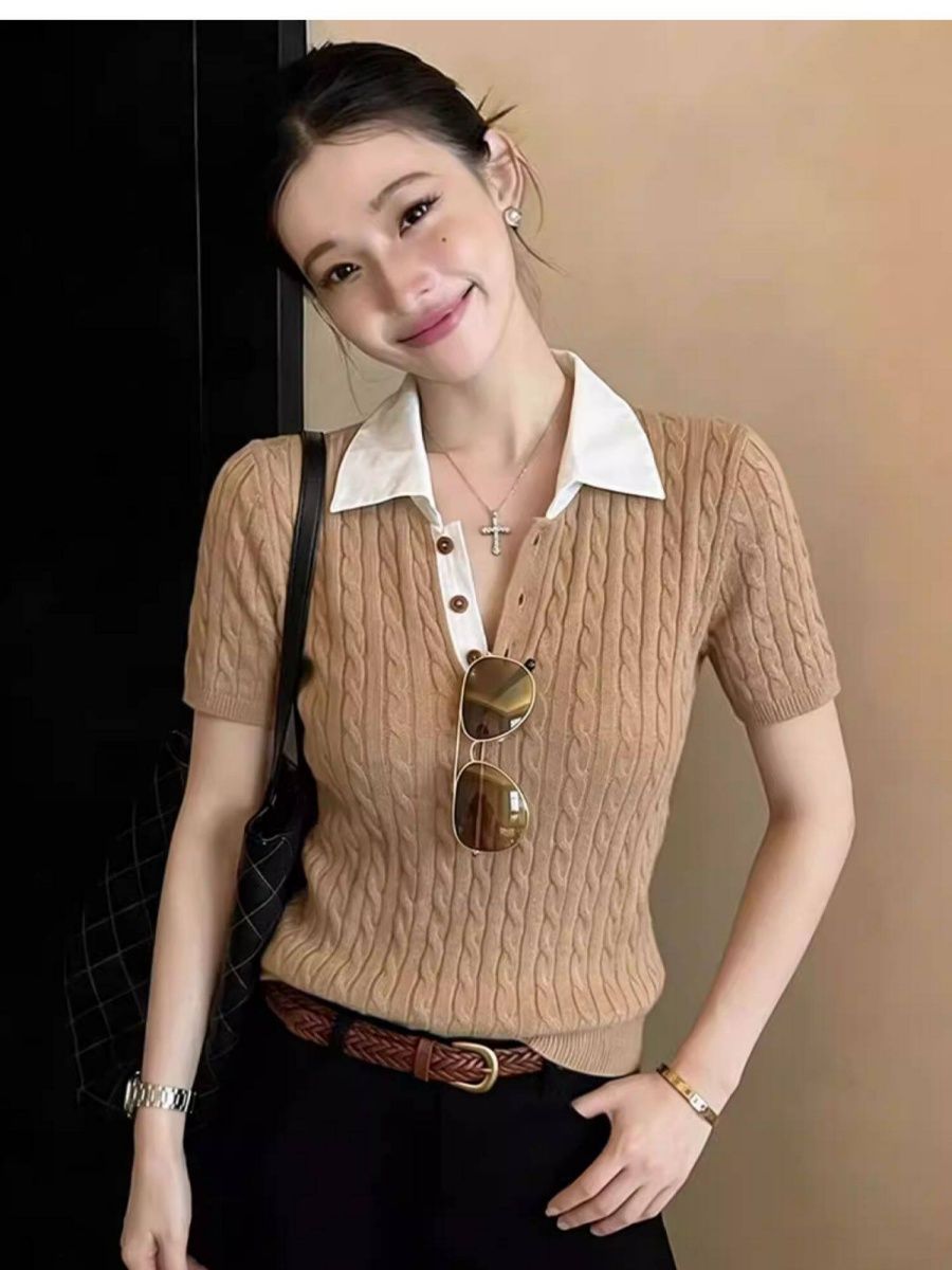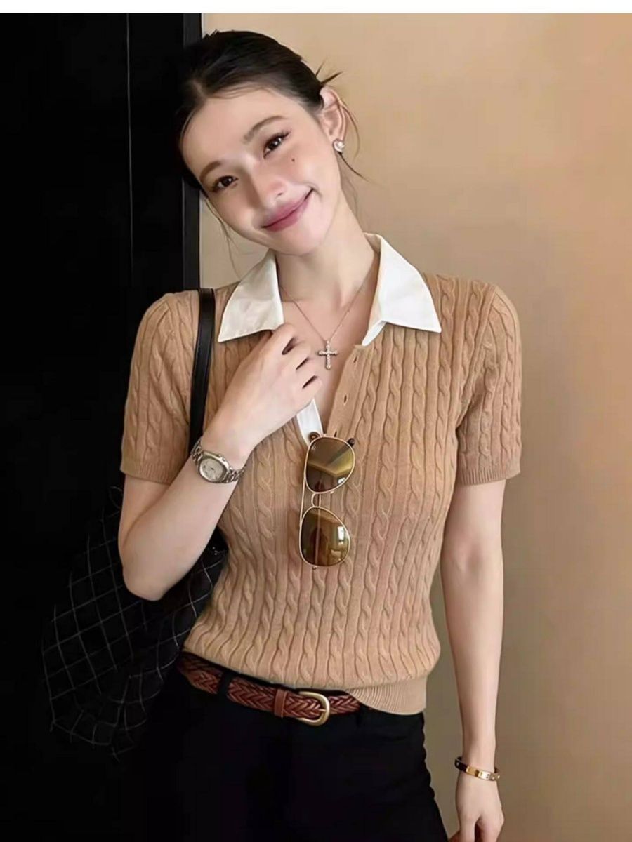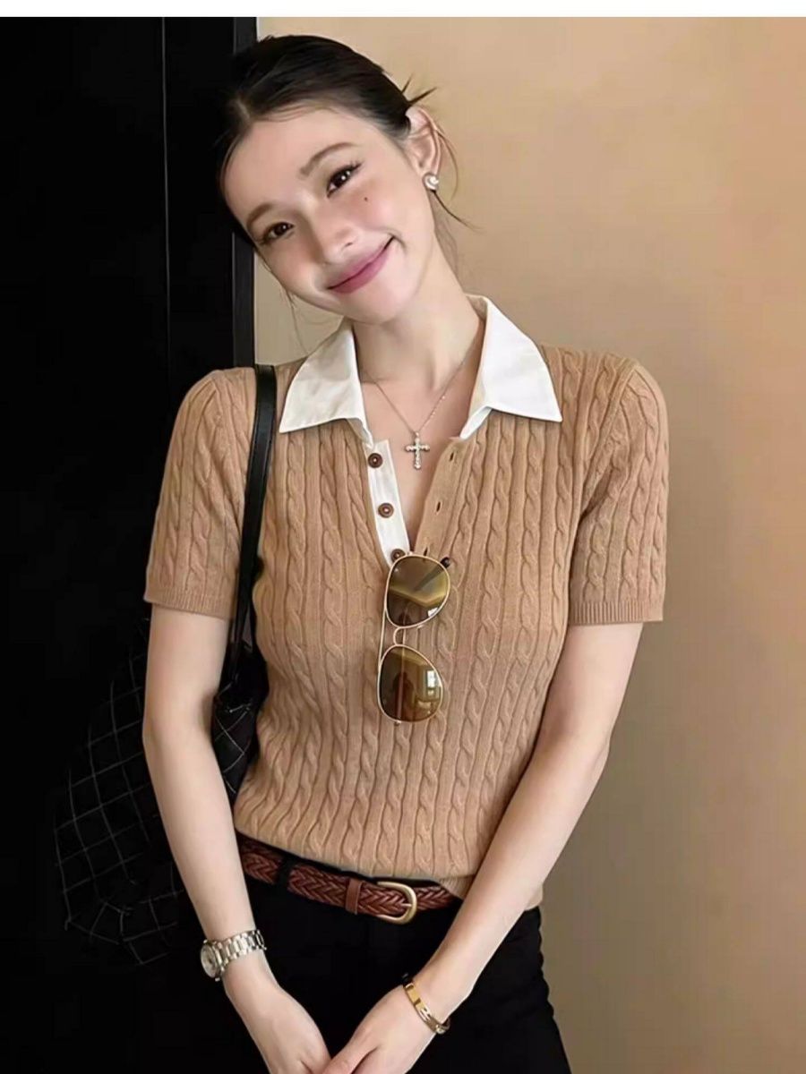 法式Polo领卡其色麻花针织短袖T恤女气质正肩上衣夏