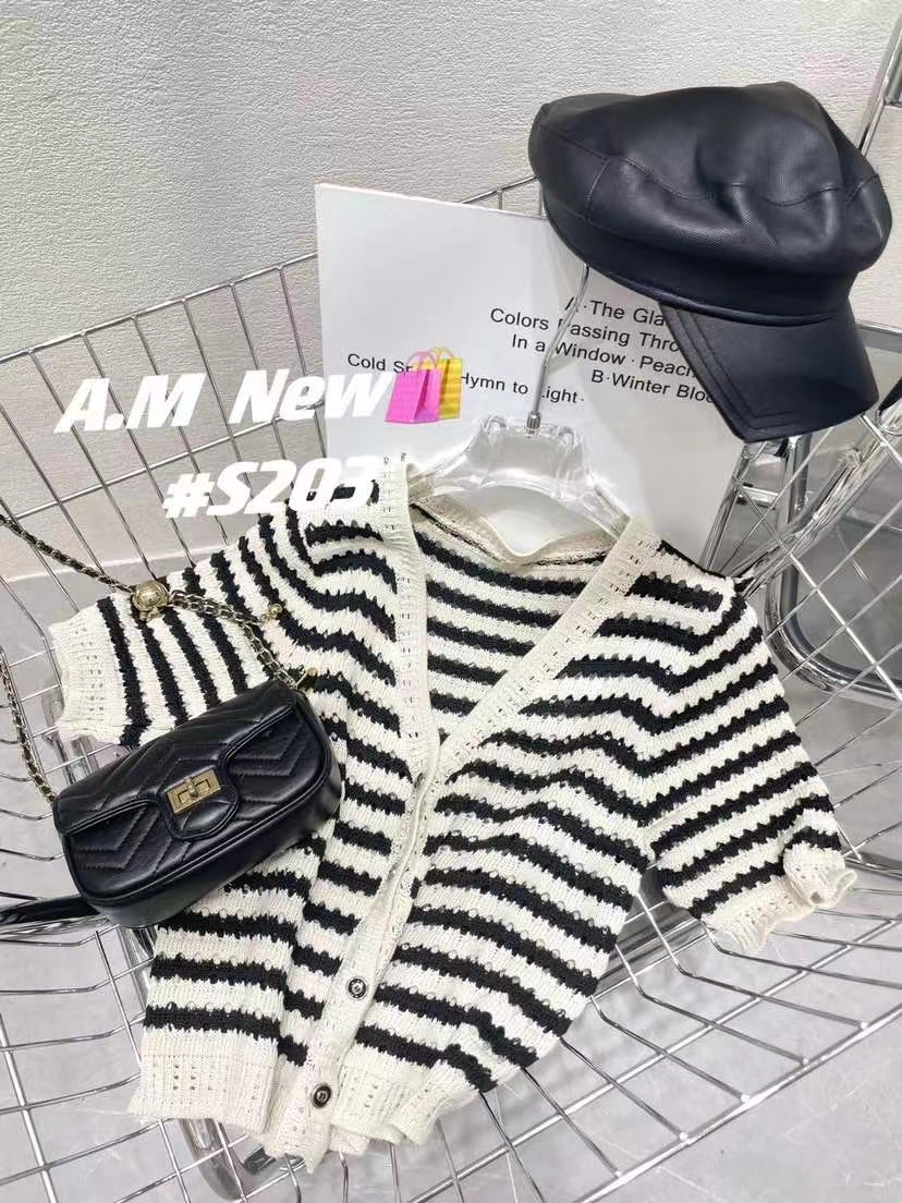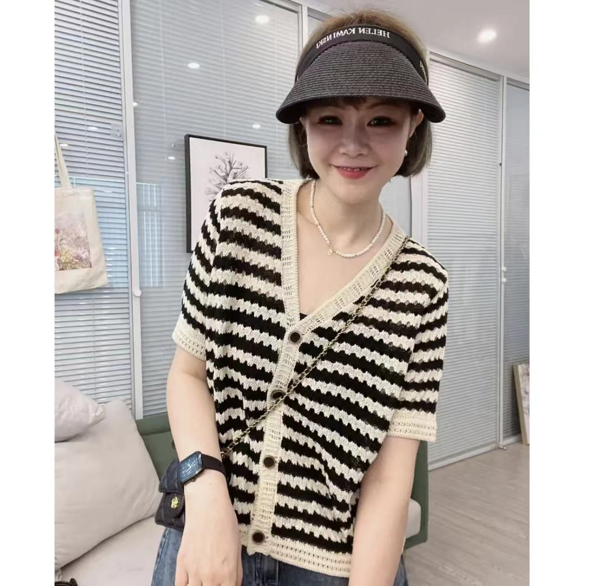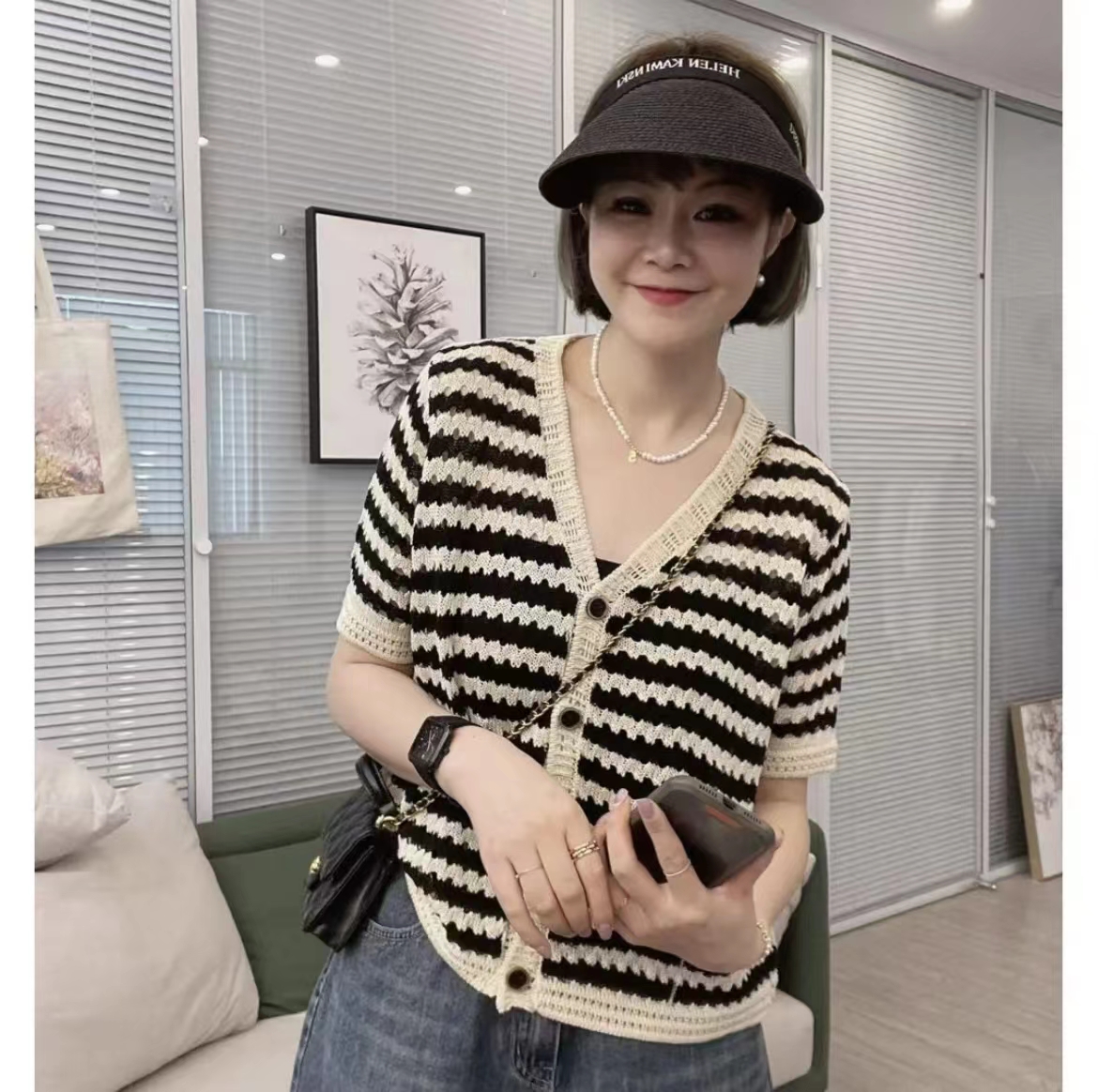 韩系简约条纹冰丝镂空针织开衫女夏季薄款设计感百搭显瘦短款上衣