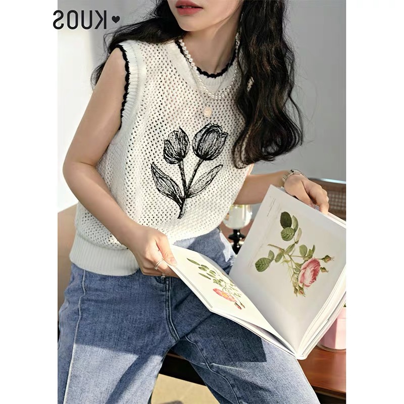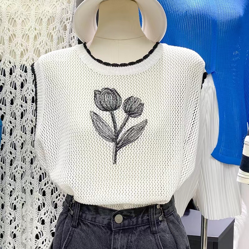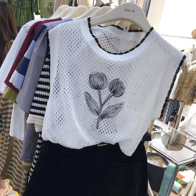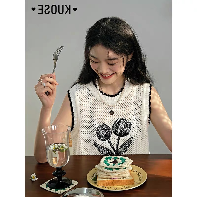 设计感小众透视镂空针织背心女复古花朵短款马甲上衣