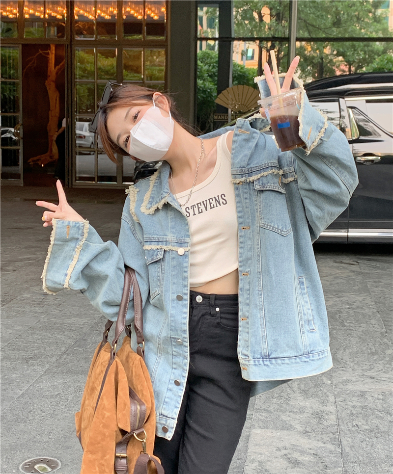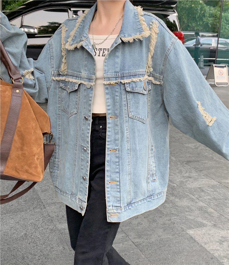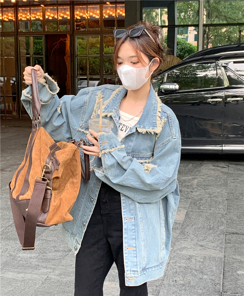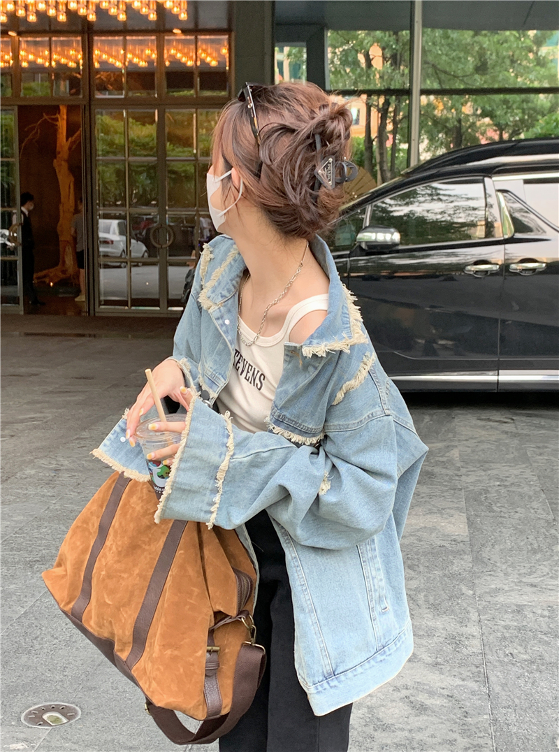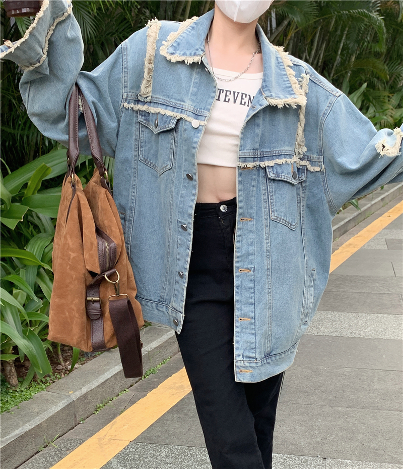 实拍实价 做旧炸街宽松休闲设计感流苏破洞牛仔外套
