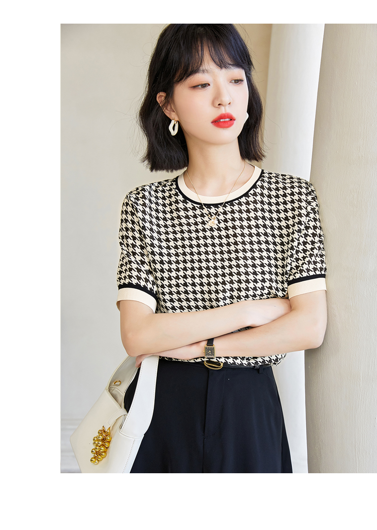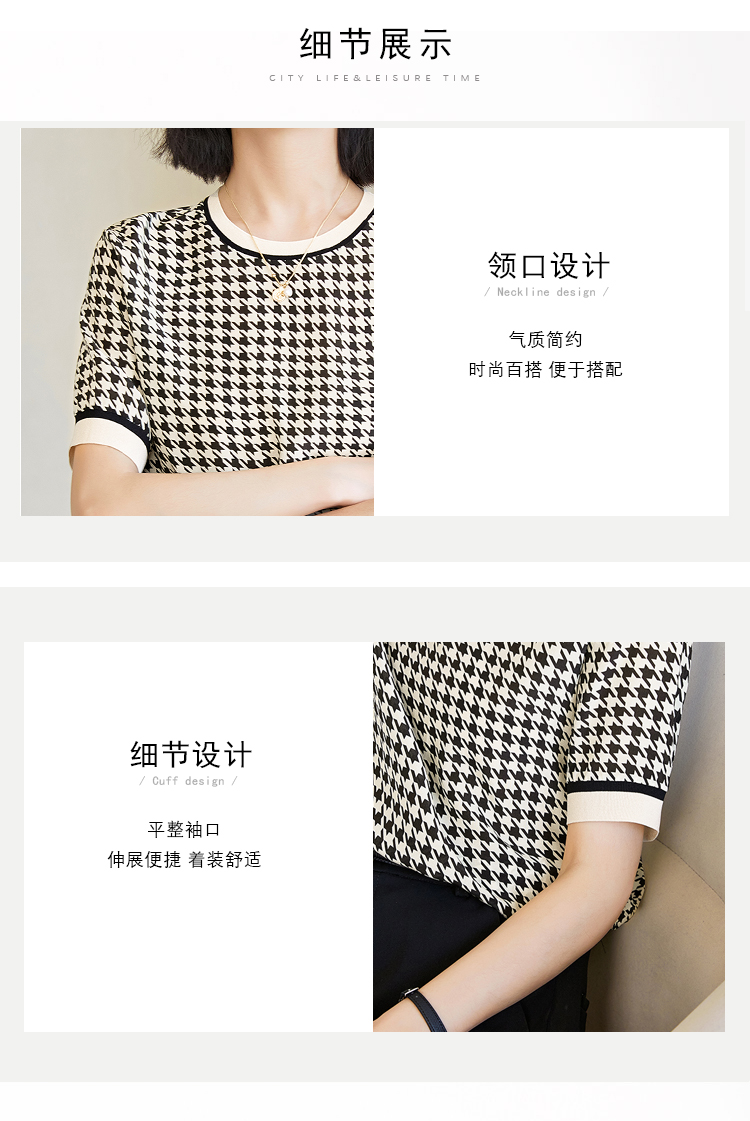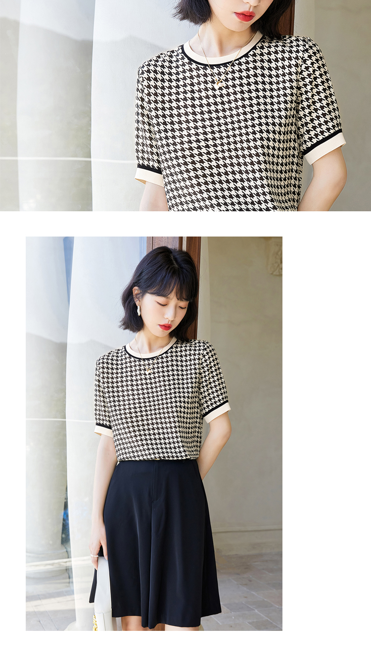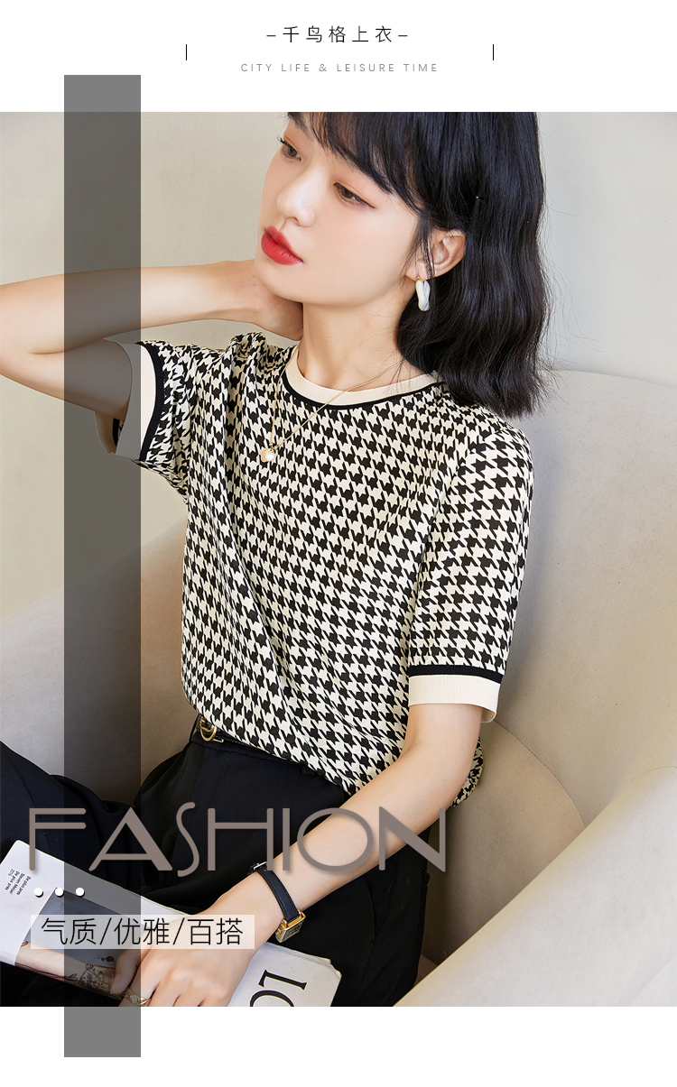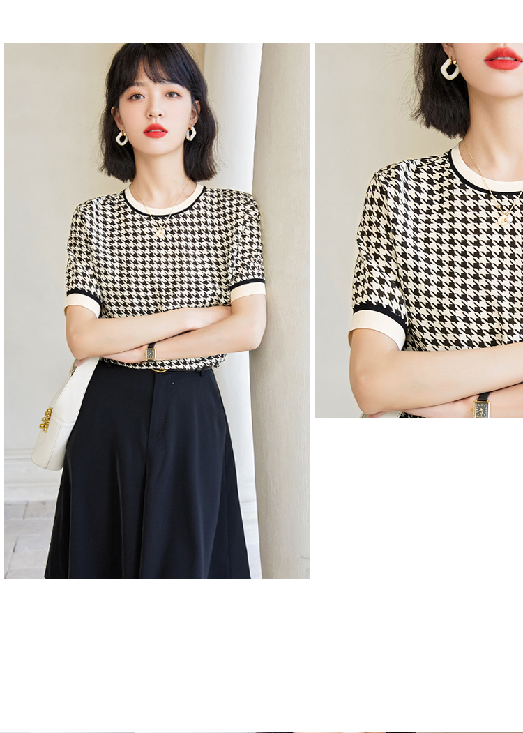 实拍真丝上衣女短袖千鸟格印花小衫2023夏季气质桑蚕丝T恤