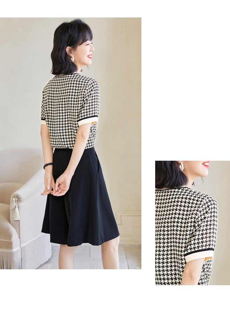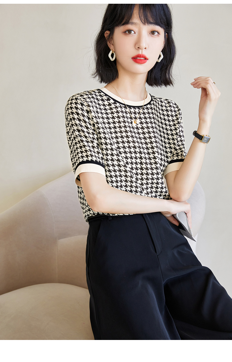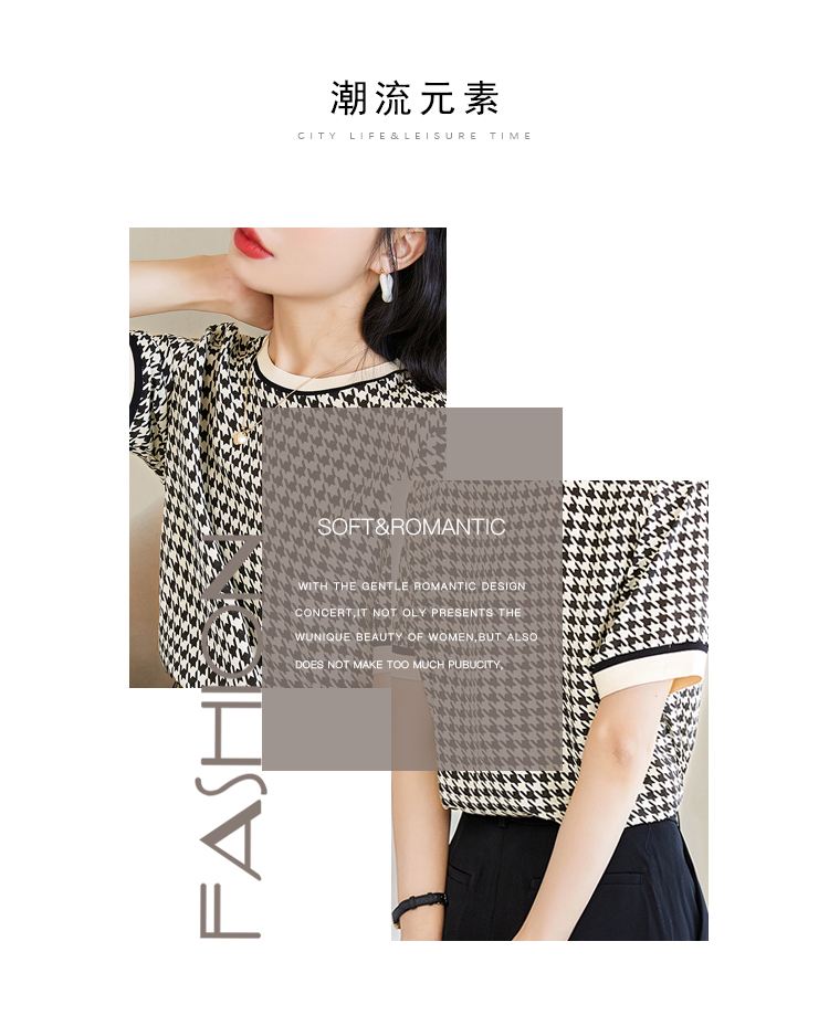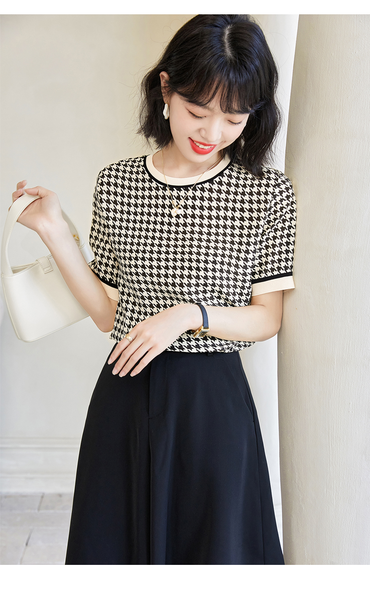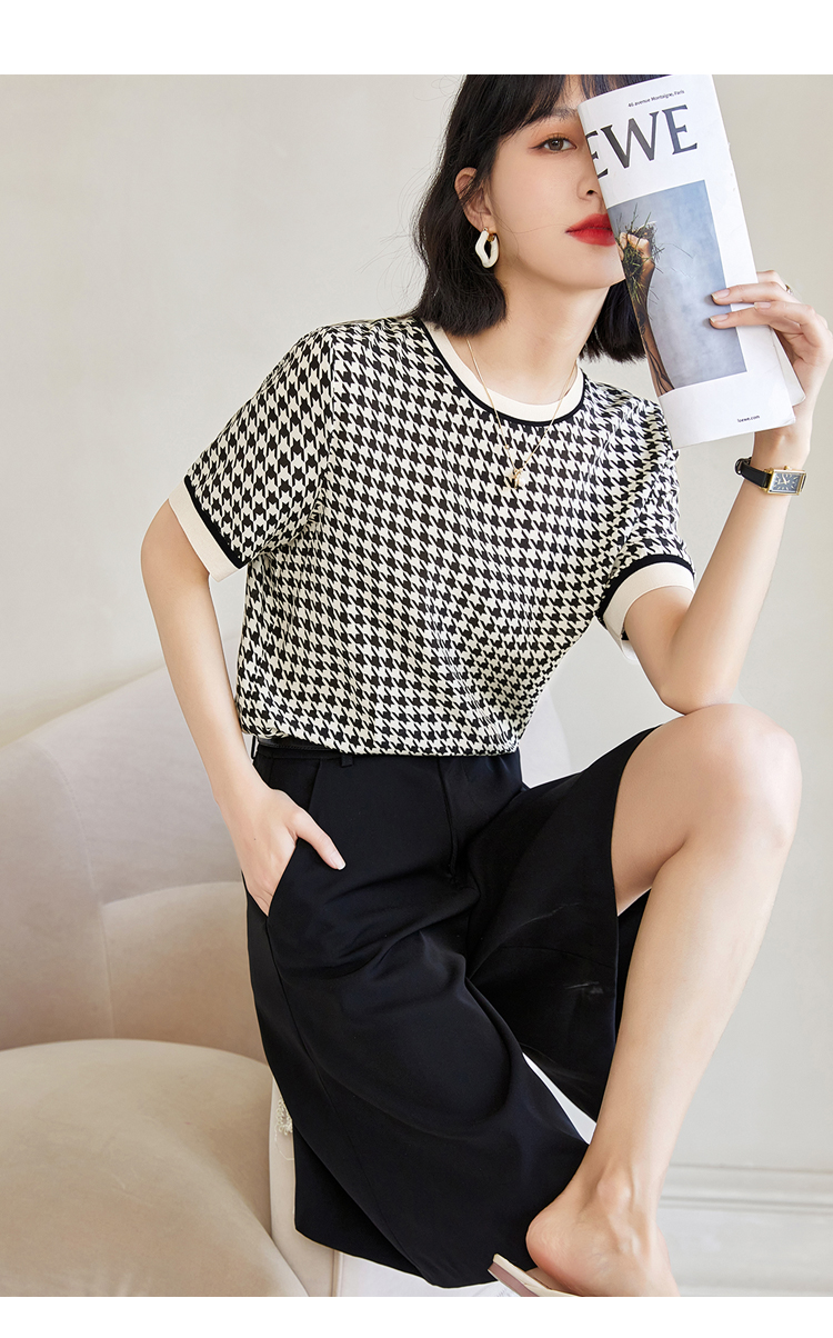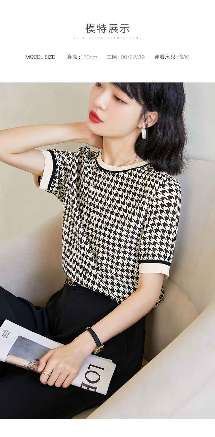 实拍真丝上衣女短袖千鸟格印花小衫2023夏季气质桑蚕丝T恤
