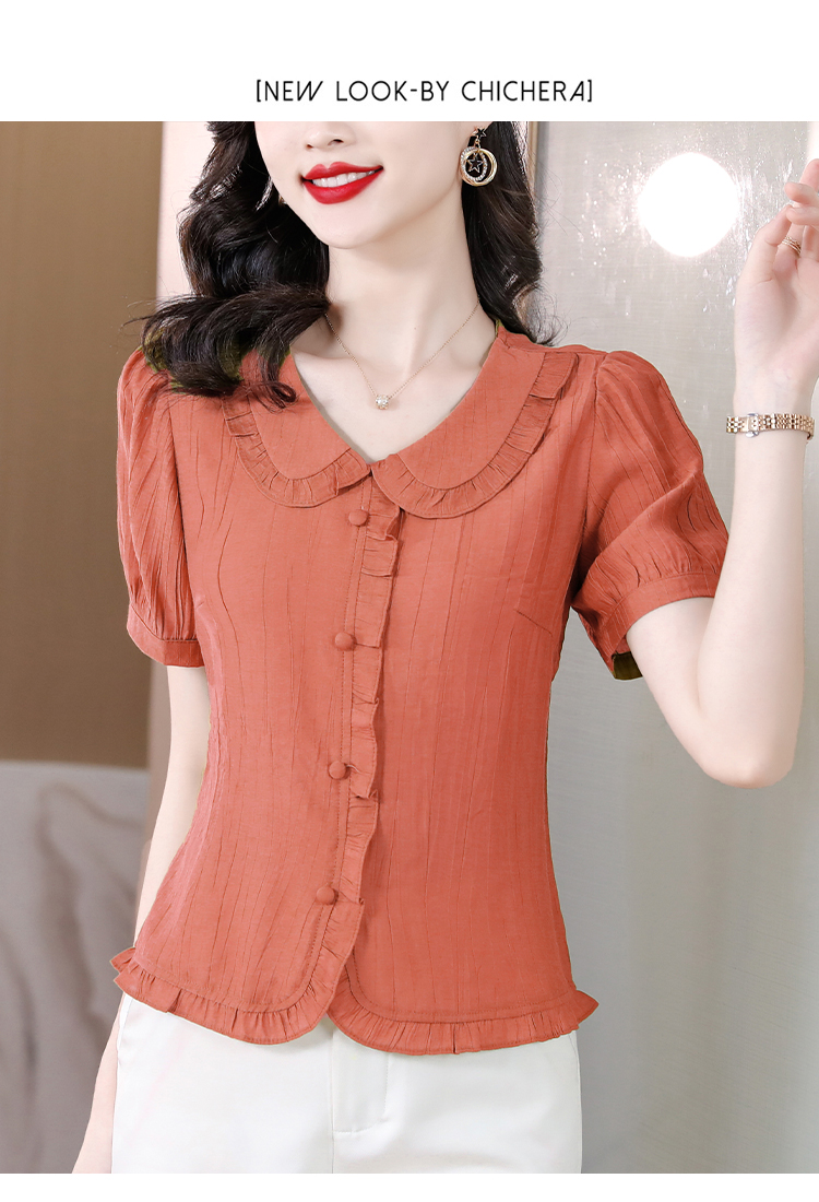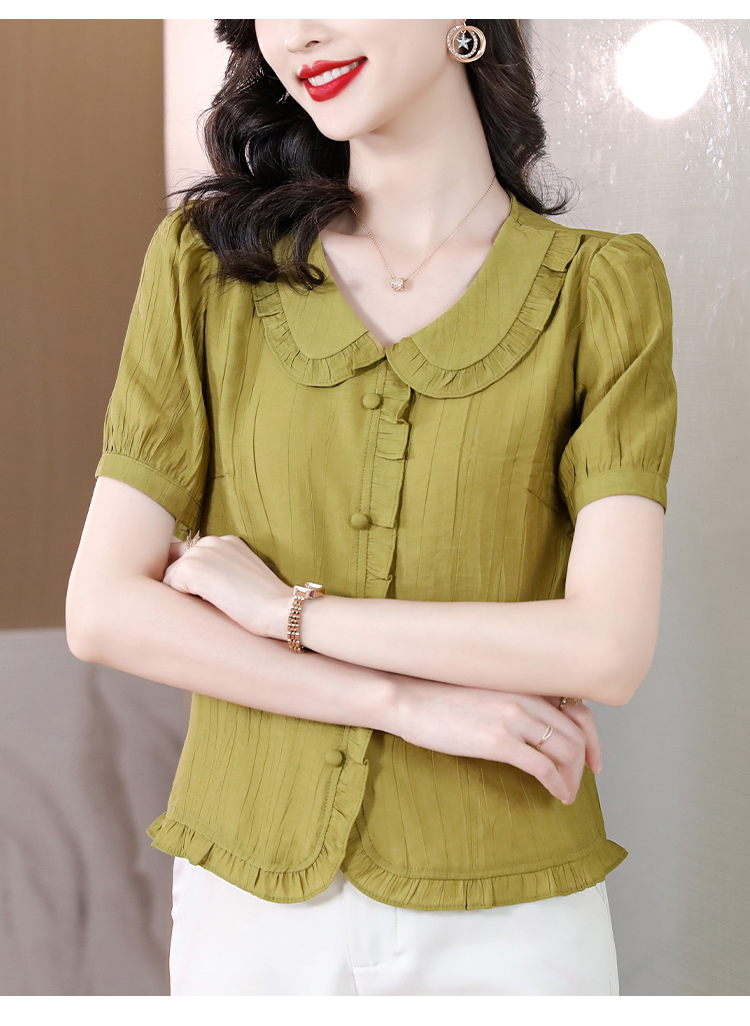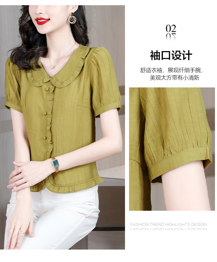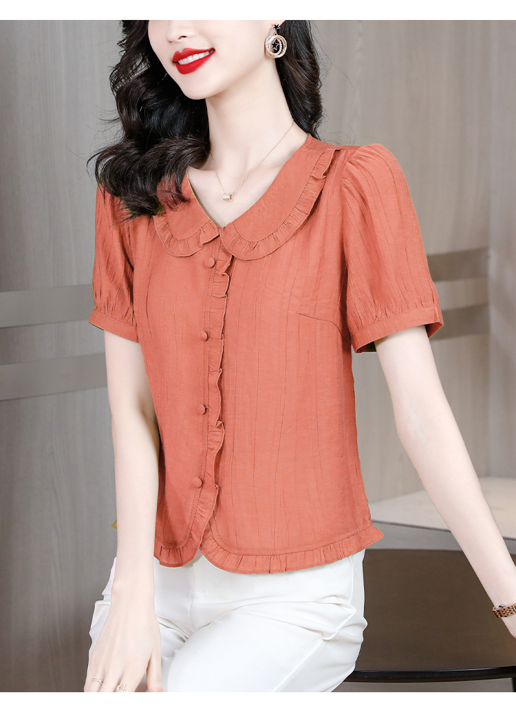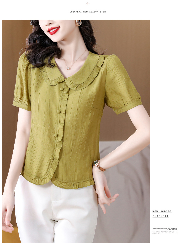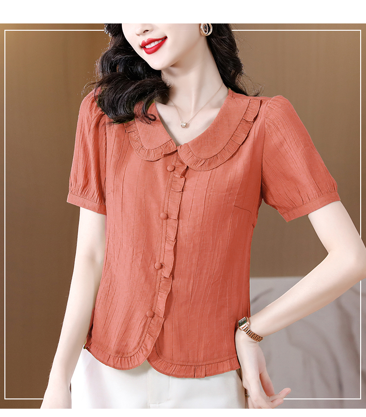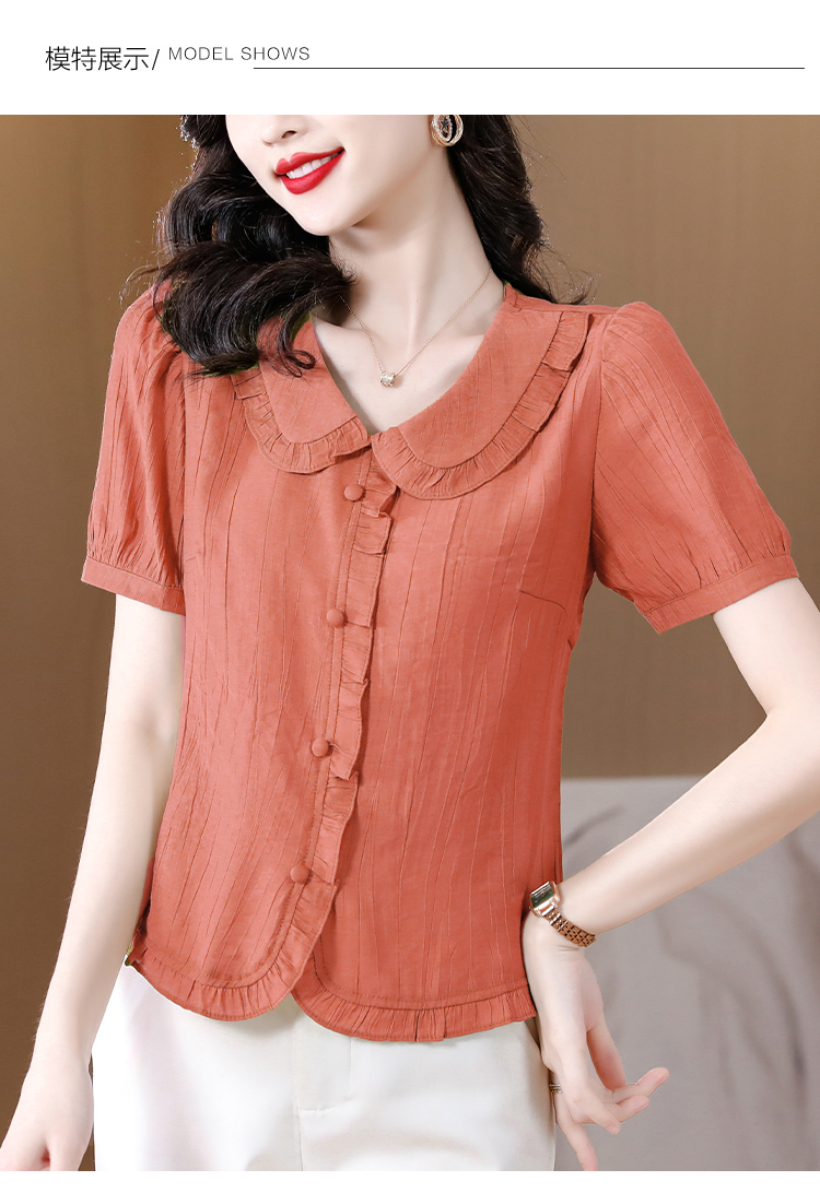 스팟 실제 샷 2023 새로운 여름 인형 칼라 반팔 여성 면 및 리넨 상의 아름답고 세련된 슬림 셔츠