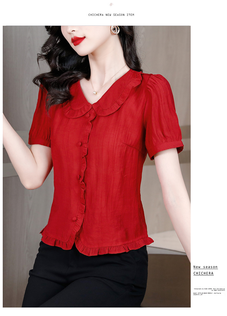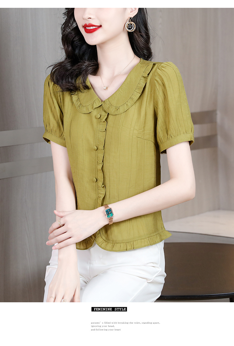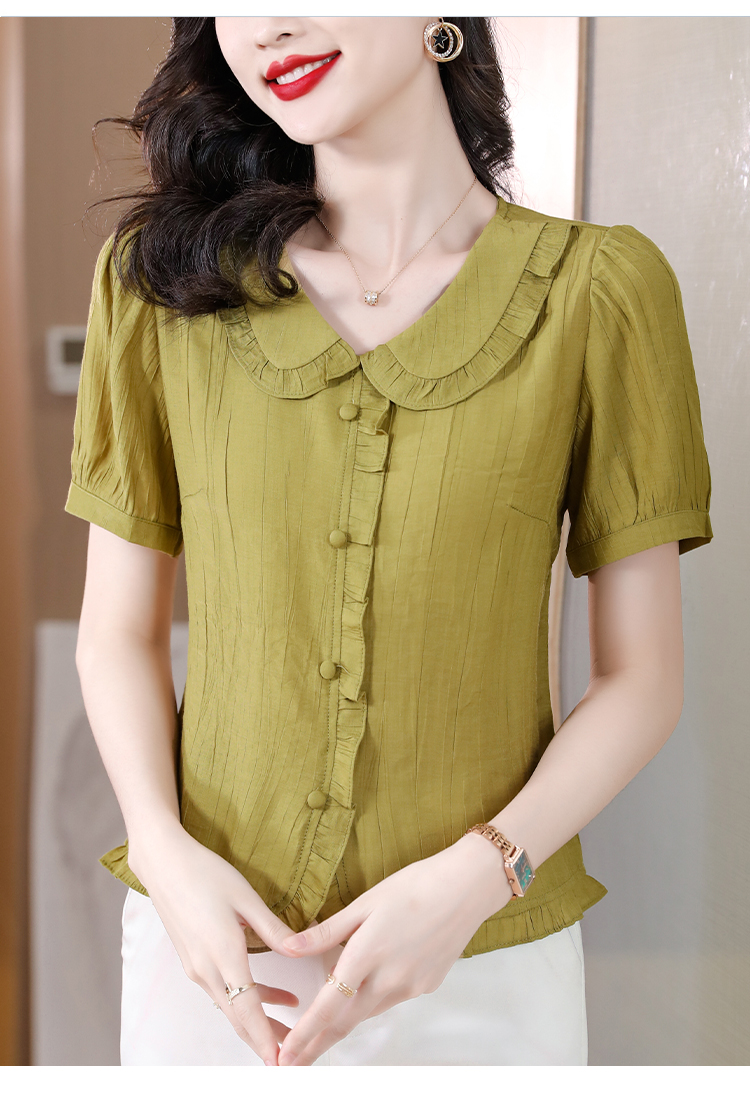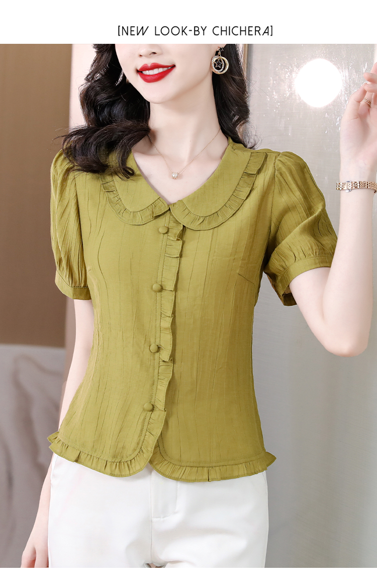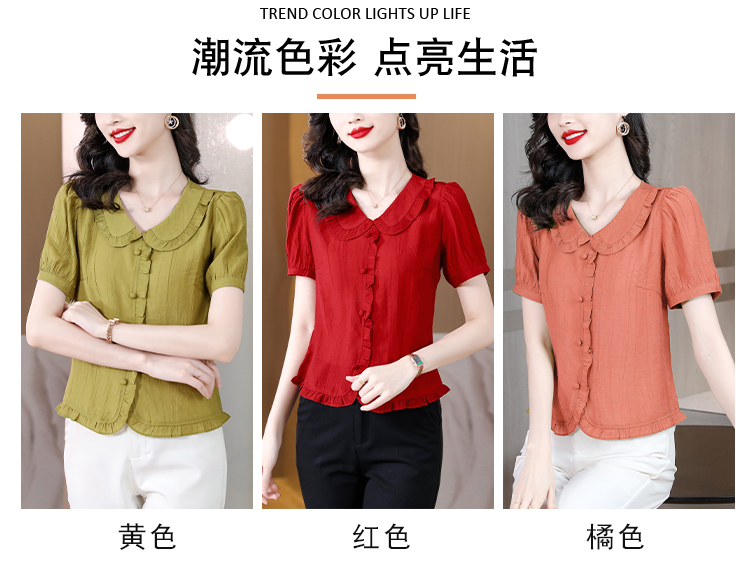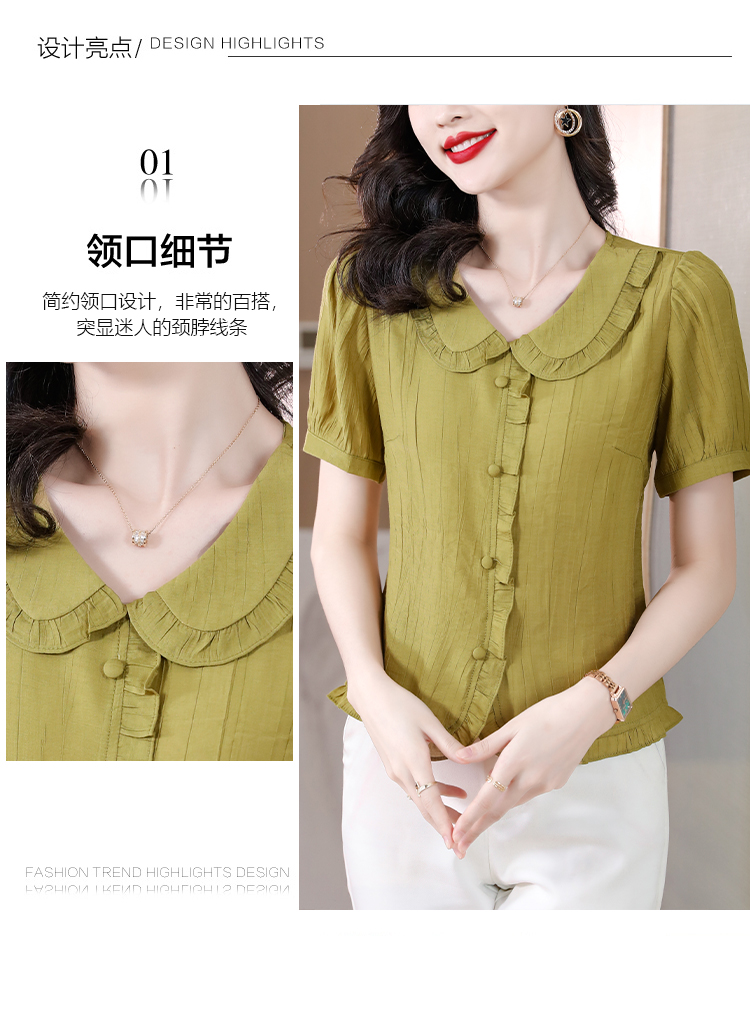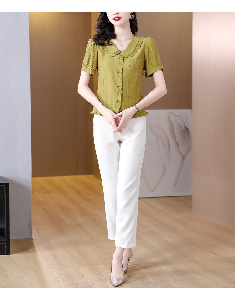 스팟 실제 샷 2023 새로운 여름 인형 칼라 반팔 여성 면 및 리넨 상의 아름답고 세련된 슬림 셔츠