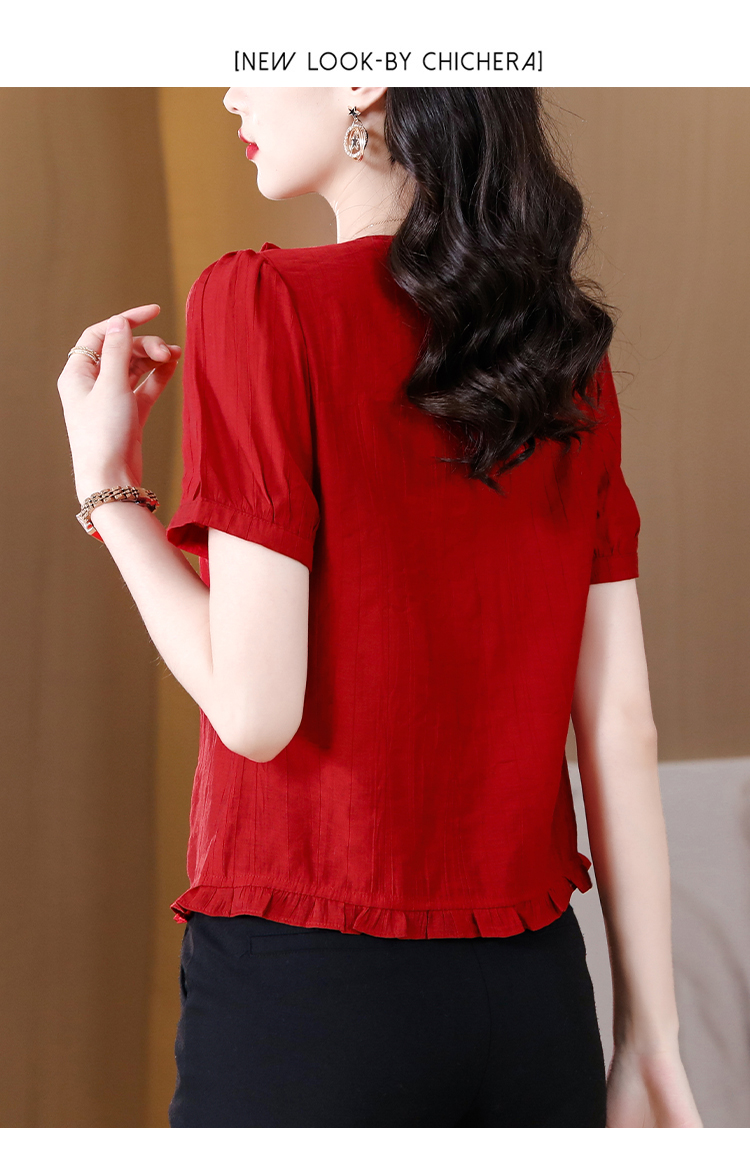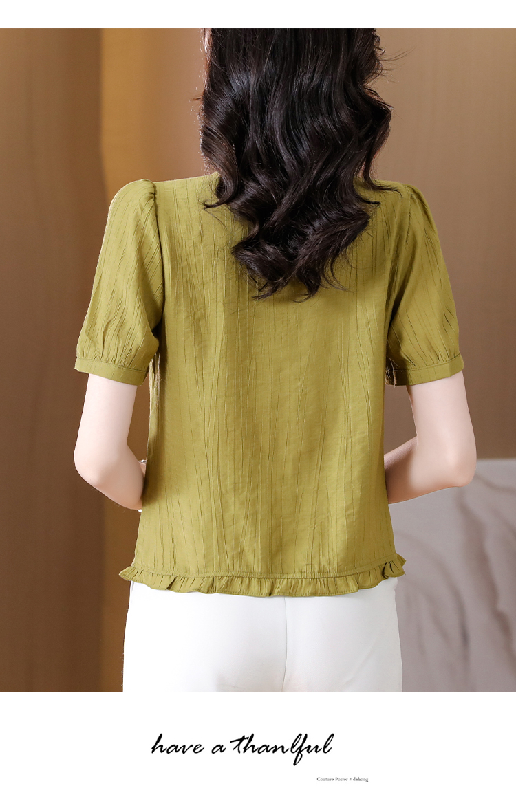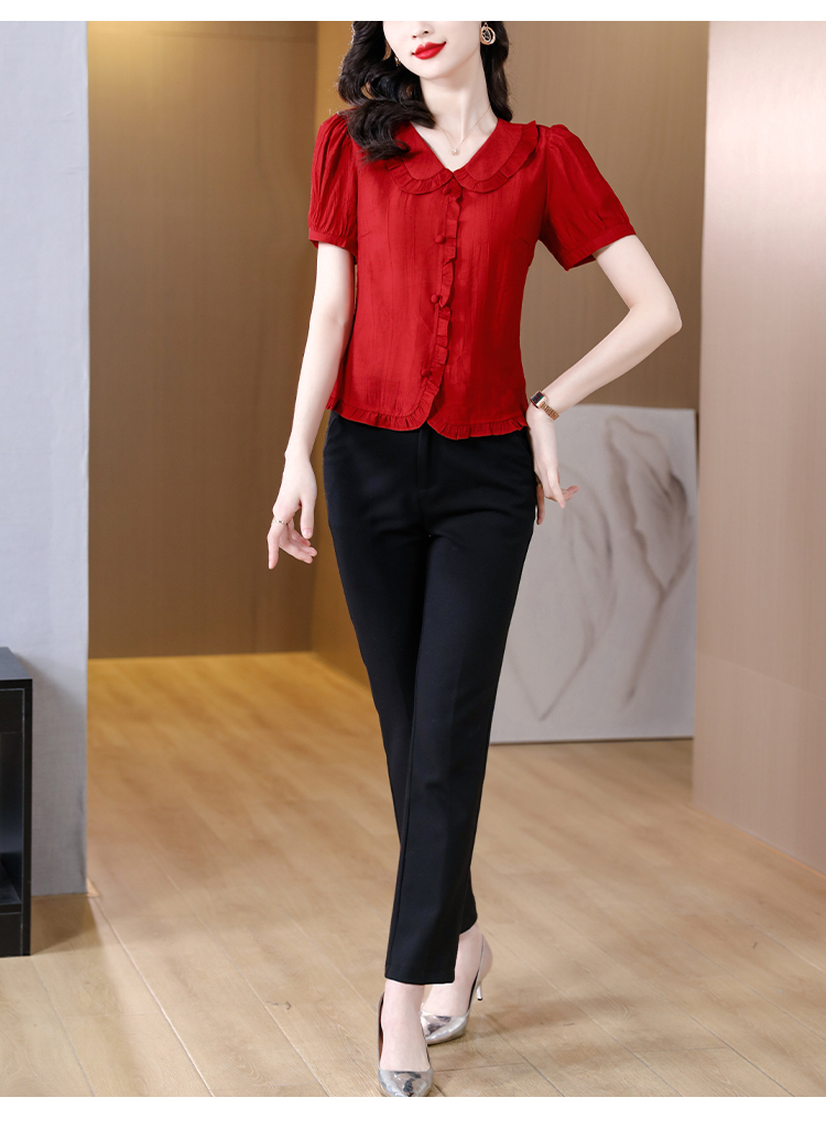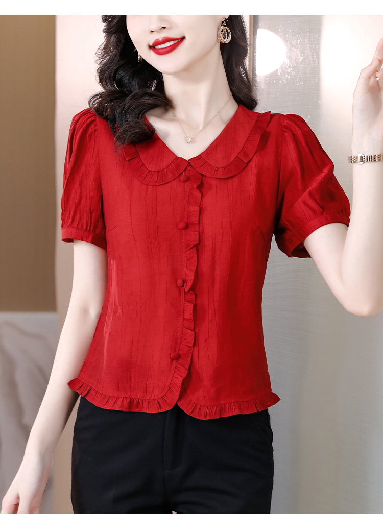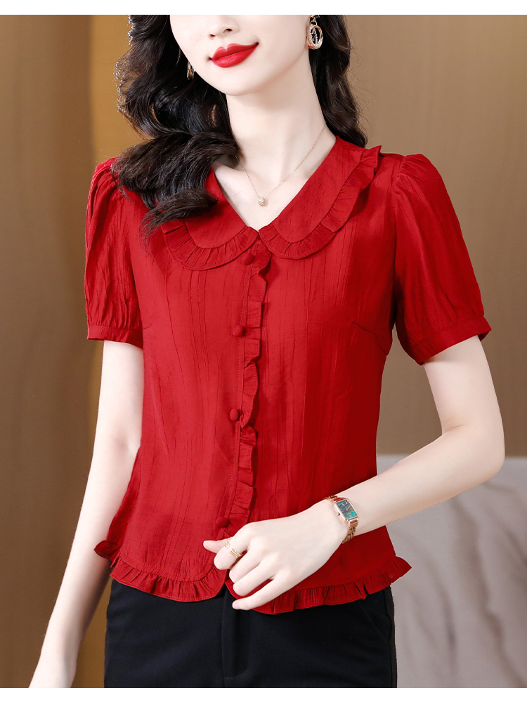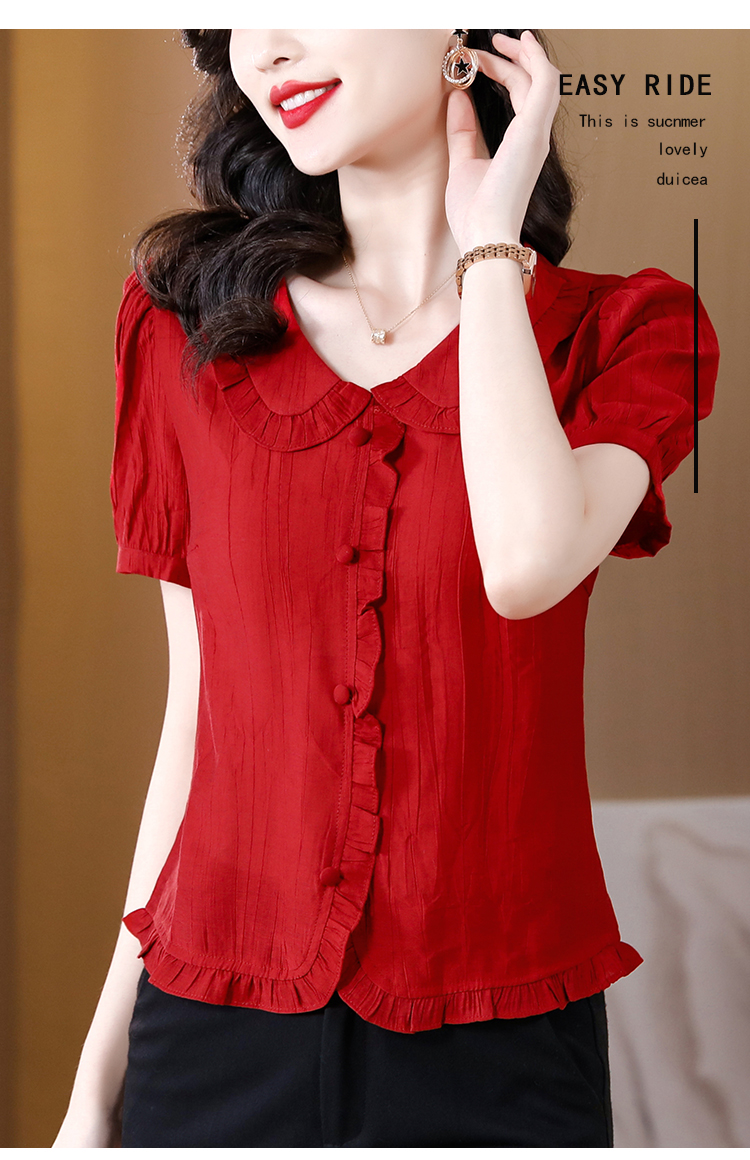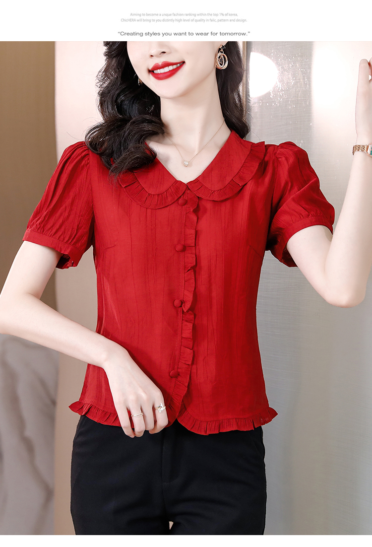 스팟 실제 샷 2023 새로운 여름 인형 칼라 반팔 여성 면 및 리넨 상의 아름답고 세련된 슬림 셔츠