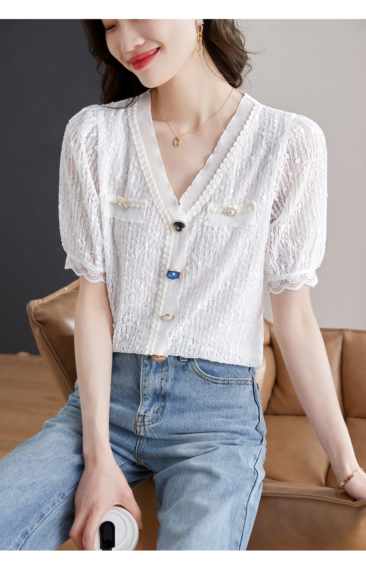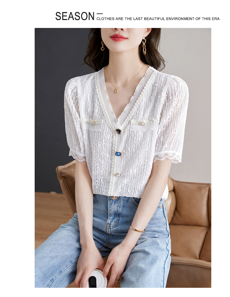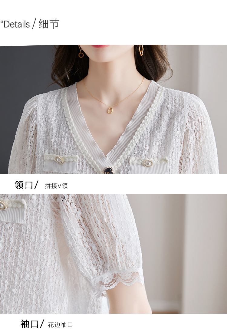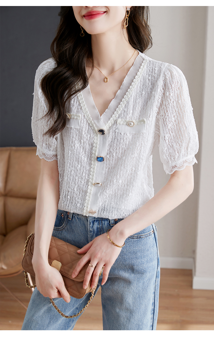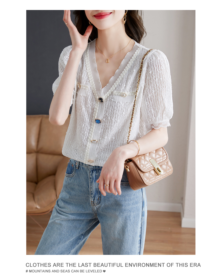 实拍◆◆夏季新款2023短袖V领法式百搭宽松显瘦蕾丝衬衣上衣