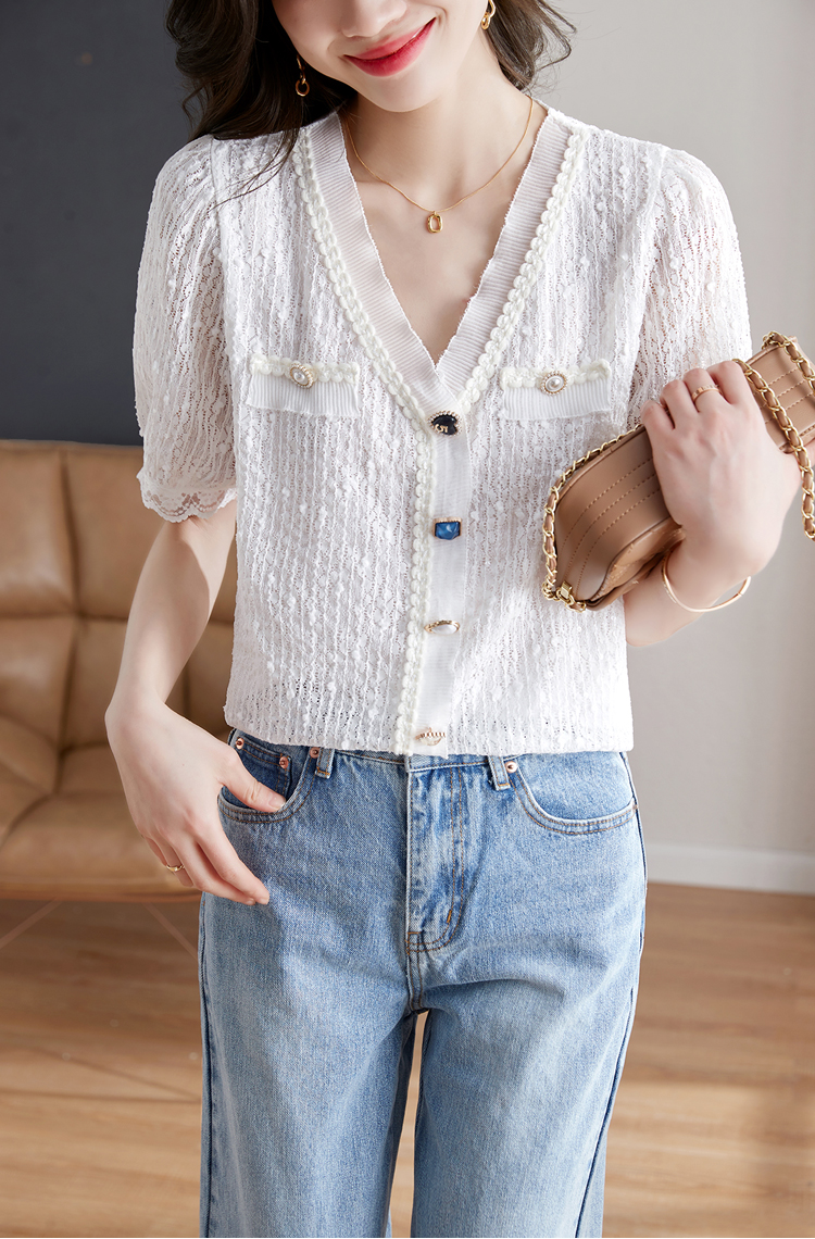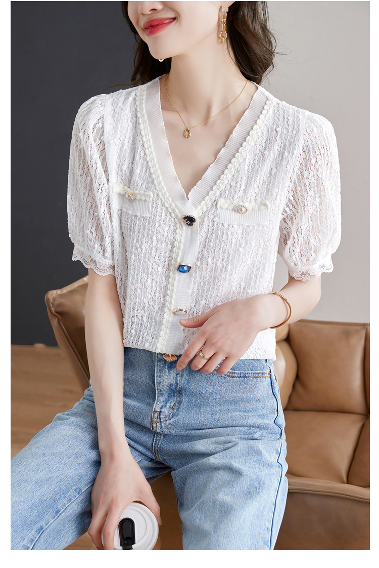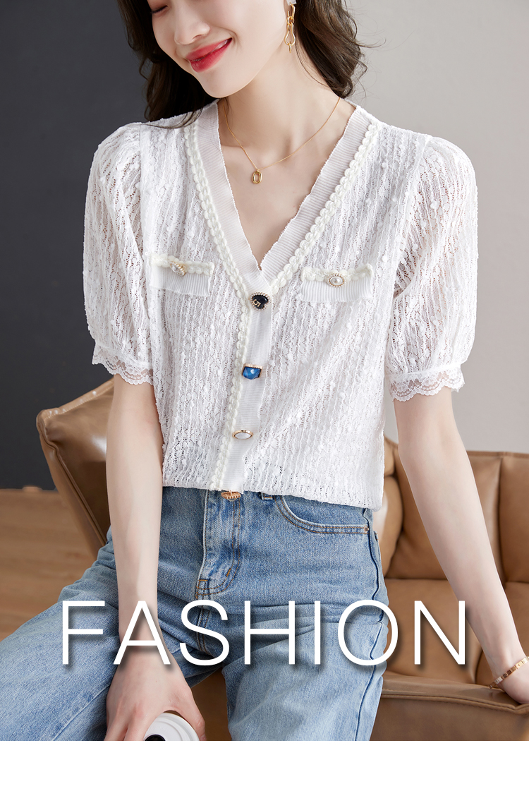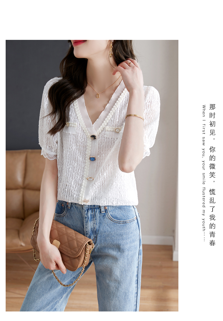 实拍◆◆夏季新款2023短袖V领法式百搭宽松显瘦蕾丝衬衣上衣