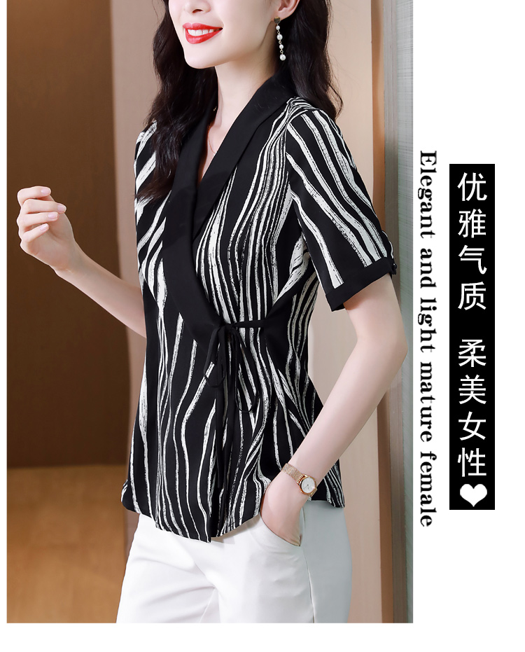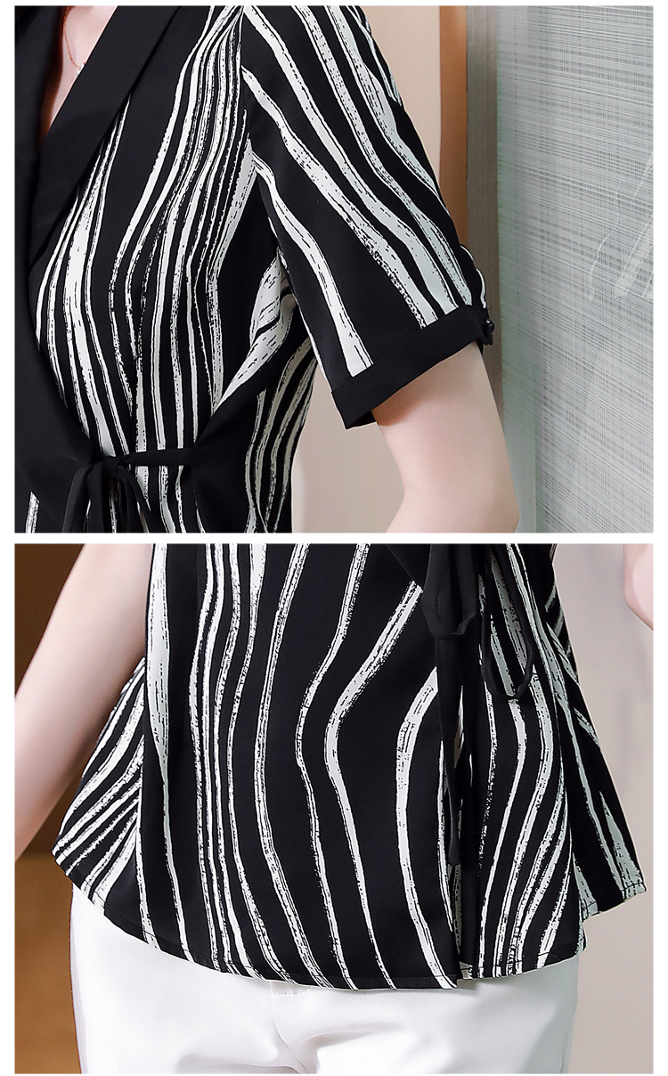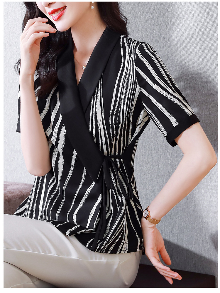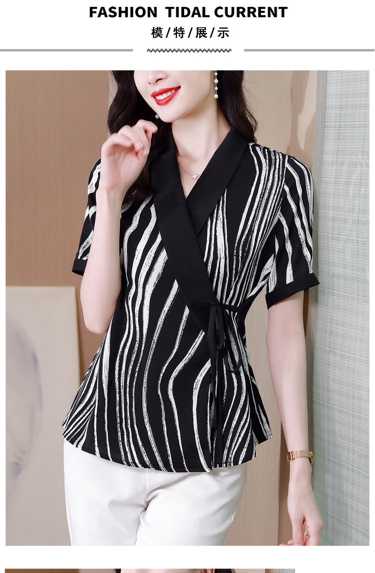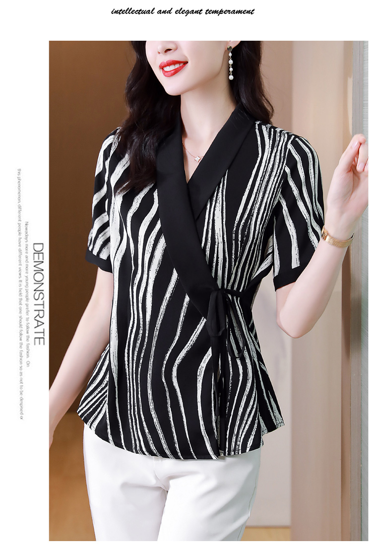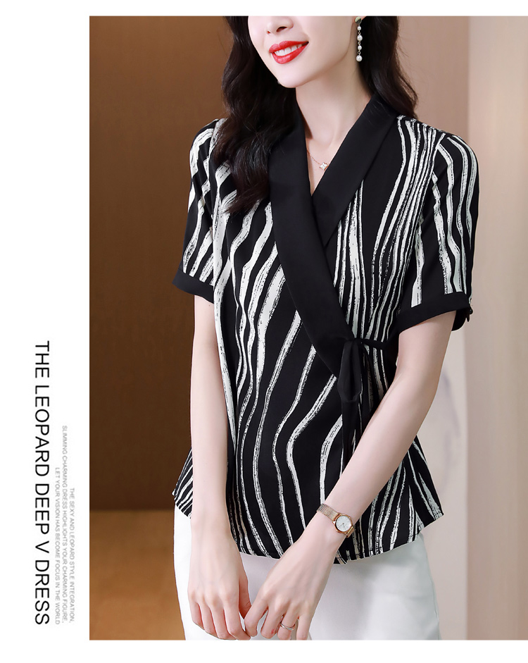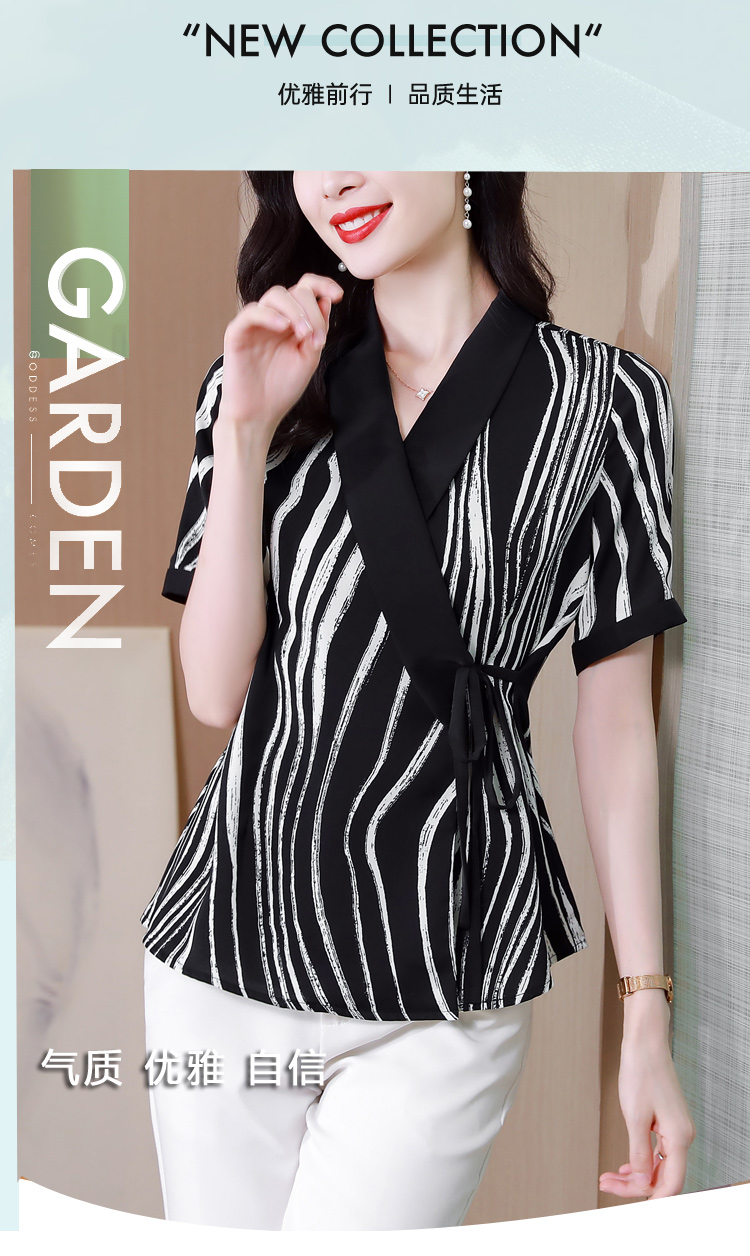 유럽 스테이션 2023 여름 반팔 디자이너 셔츠 상의 여성용 V넥 스타일리시 바텀 셔츠 시크 셔츠 실제 촬영