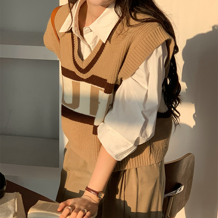 초가을 한국 동대문 스타일 컬러 블록 슬림핏 젊어 보이는 한국풍 여성용 브이넥 루즈핏 스웨터 베스트