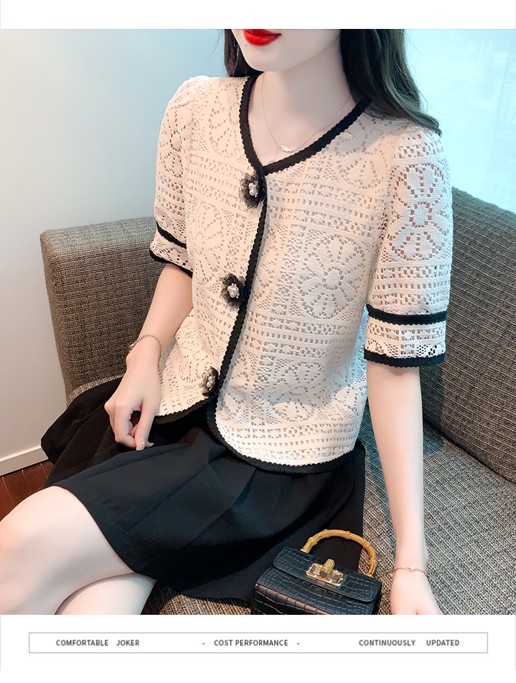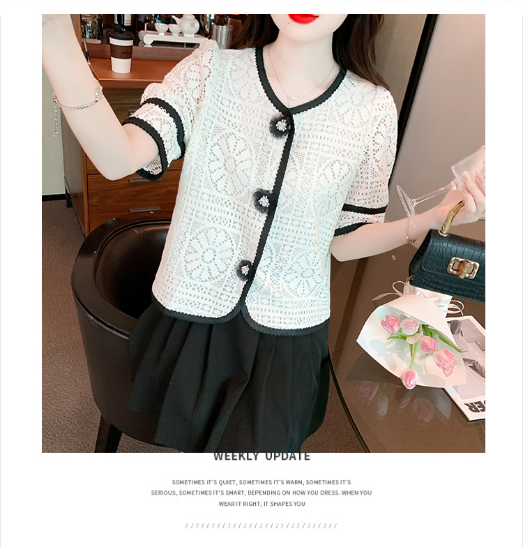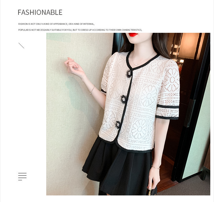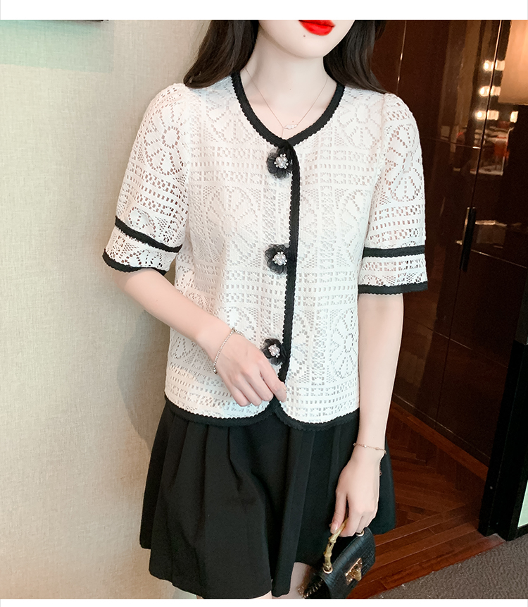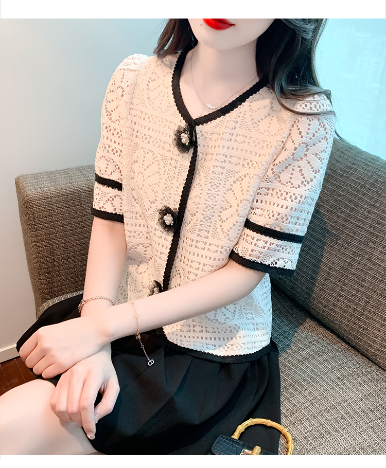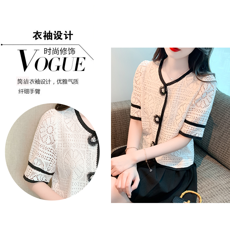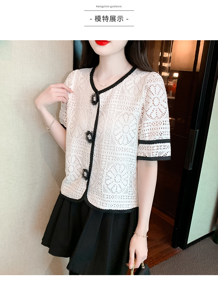 实拍2025夏季新款蕾丝刺绣镂空黑白撞色花纱珠扣优雅上衣