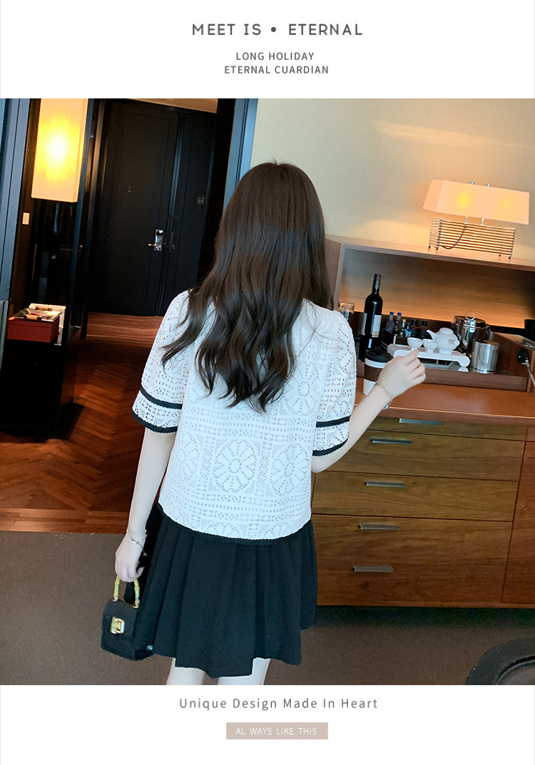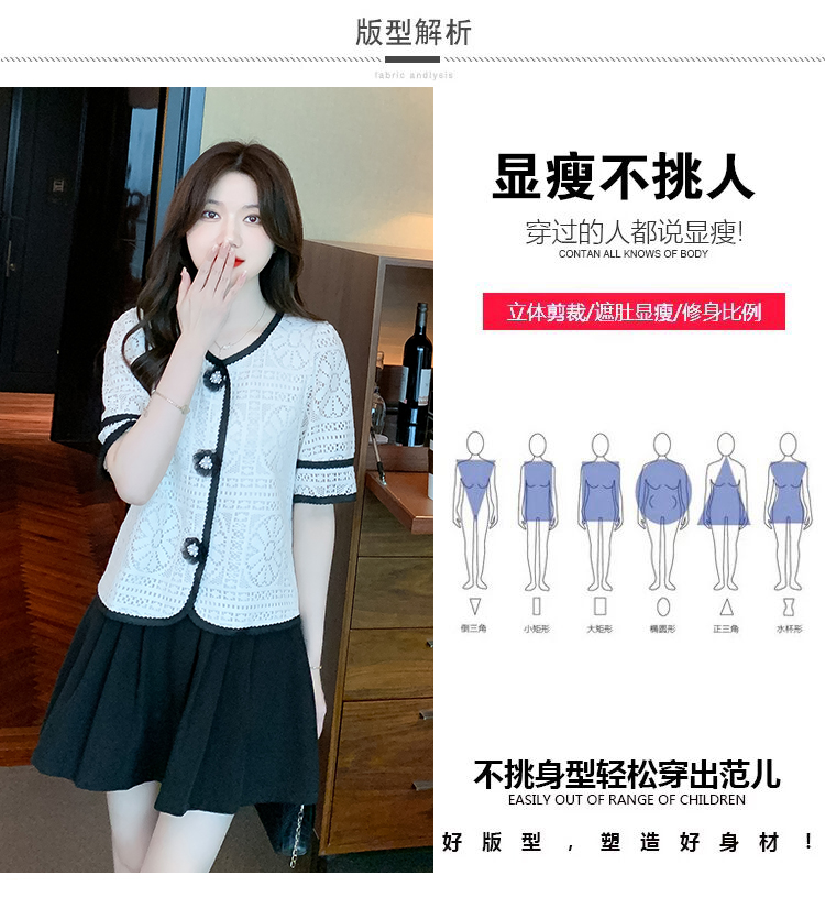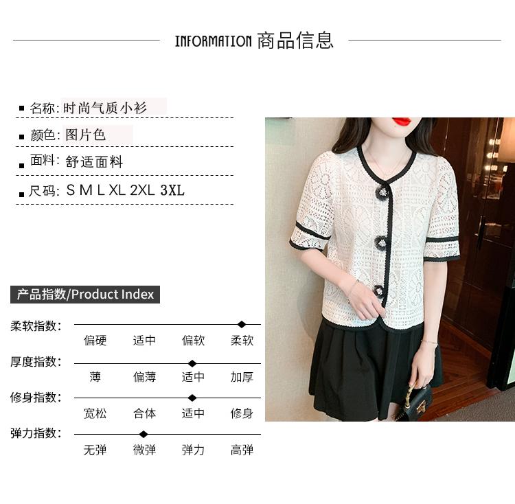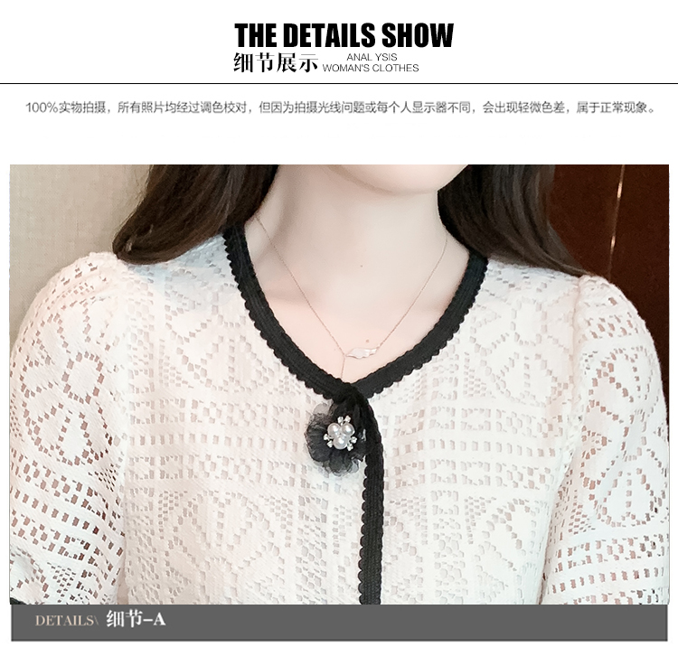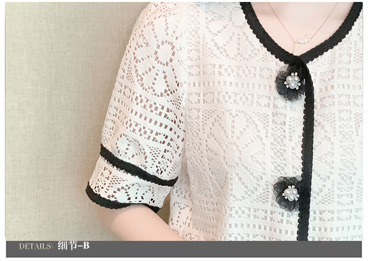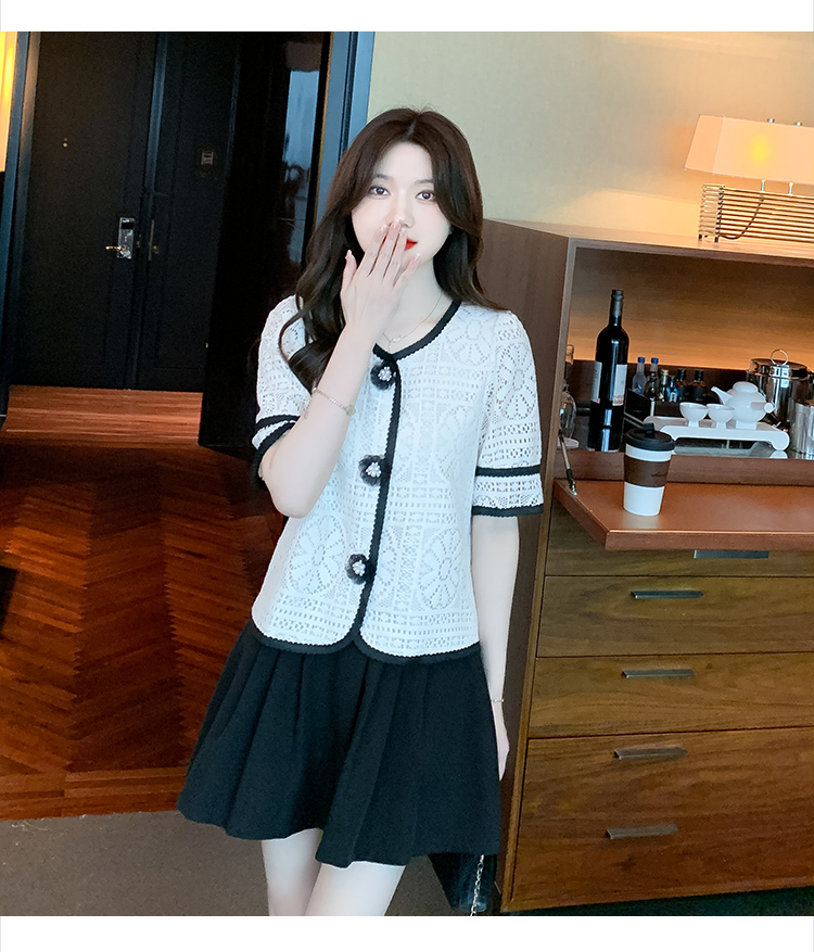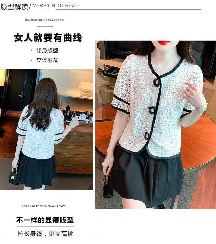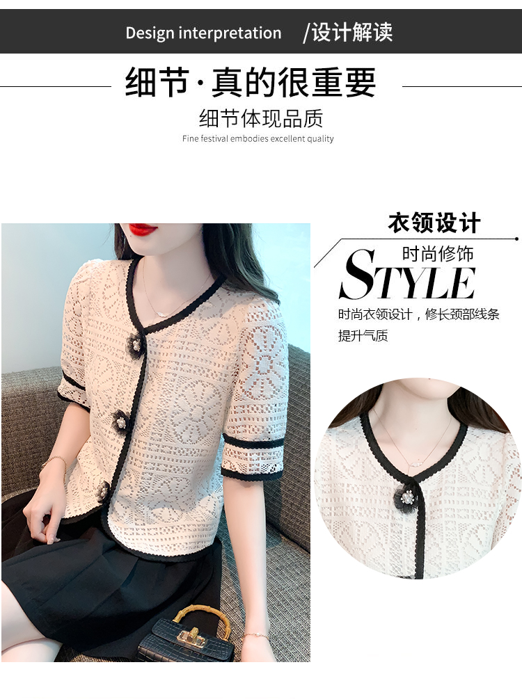 实拍2025夏季新款蕾丝刺绣镂空黑白撞色花纱珠扣优雅上衣