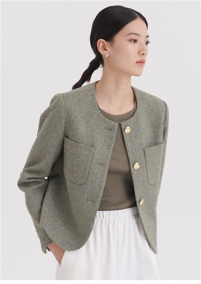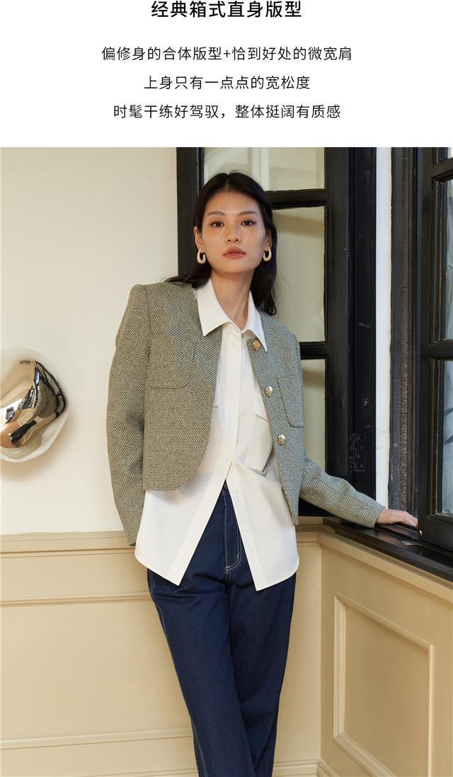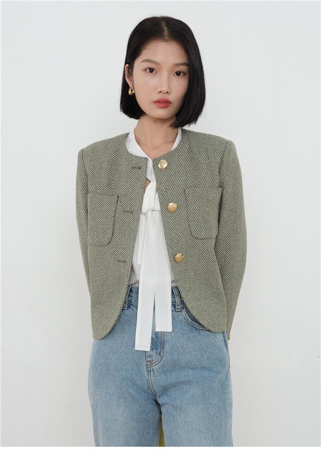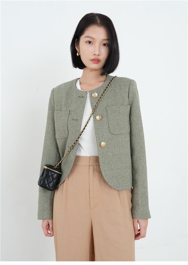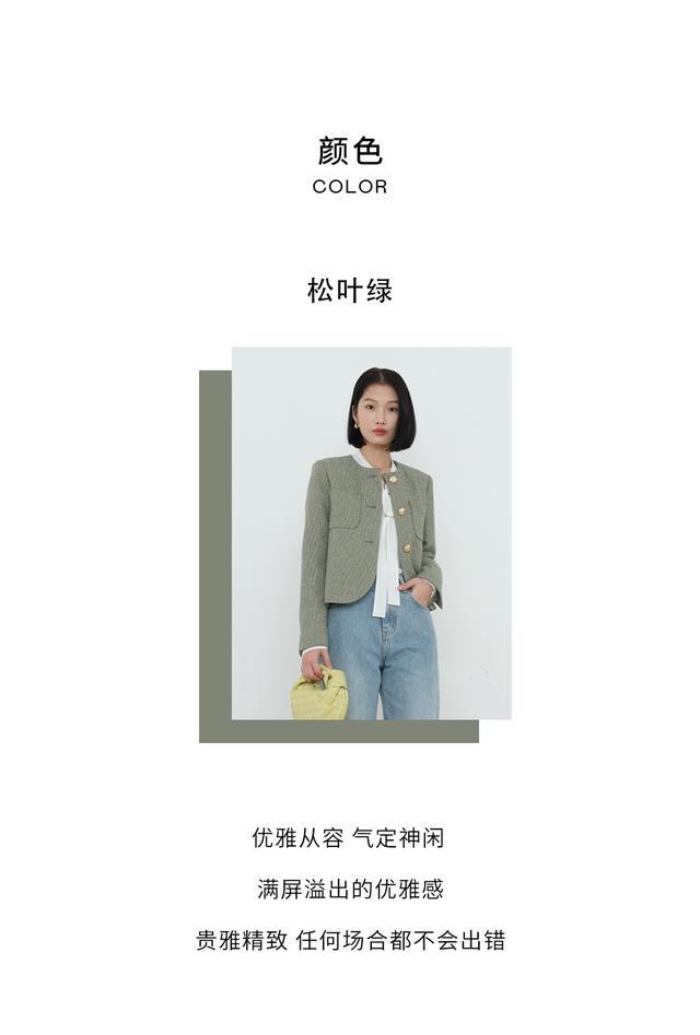 녹색 샤넬 스타일 재킷, 프랑스의 우아함, 2023년 봄/가을 신상 스타일, 짧은 라운드넥 디자인으로 독특하고 시크합니다.