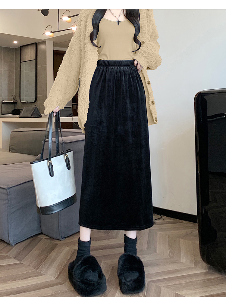 2024년 봄 신상 벨벳 슬릿 미디 스커트의 실제 사진입니다. 활용도가 높고 날씬해 보이는 스트레이트 스커트입니다.