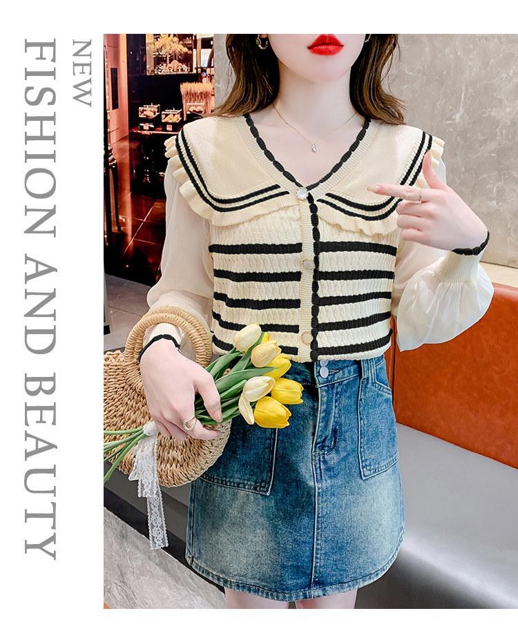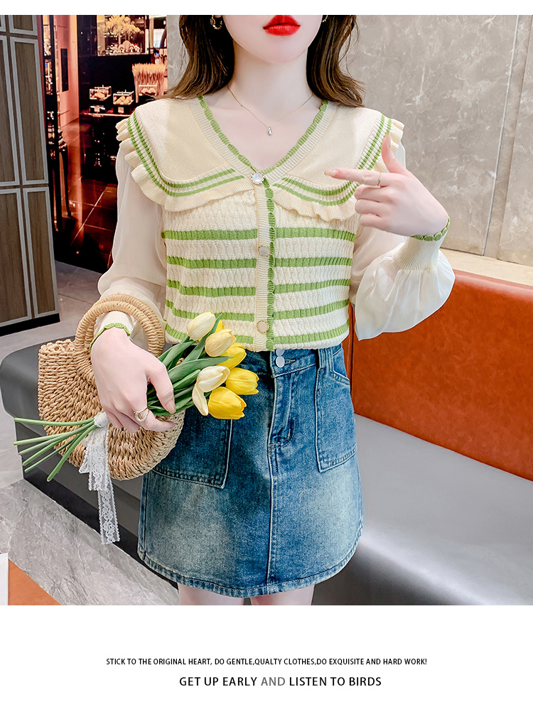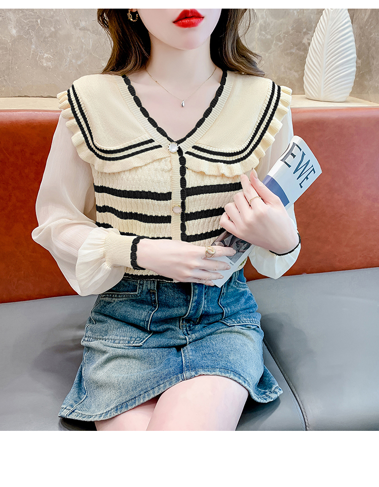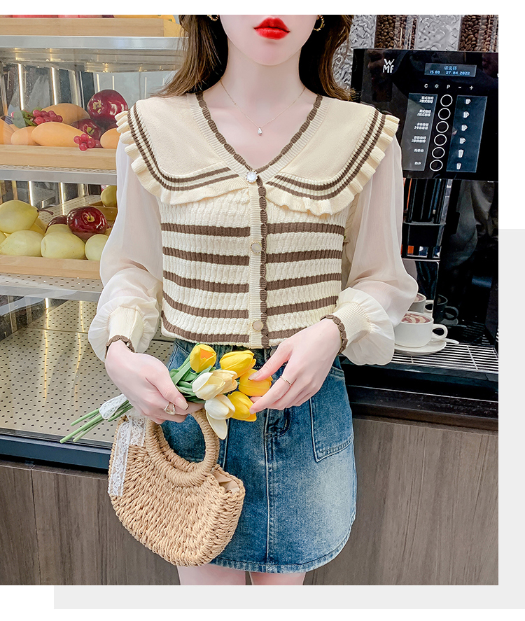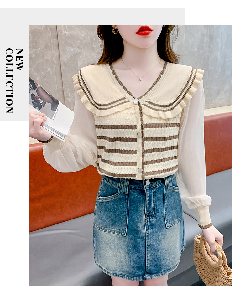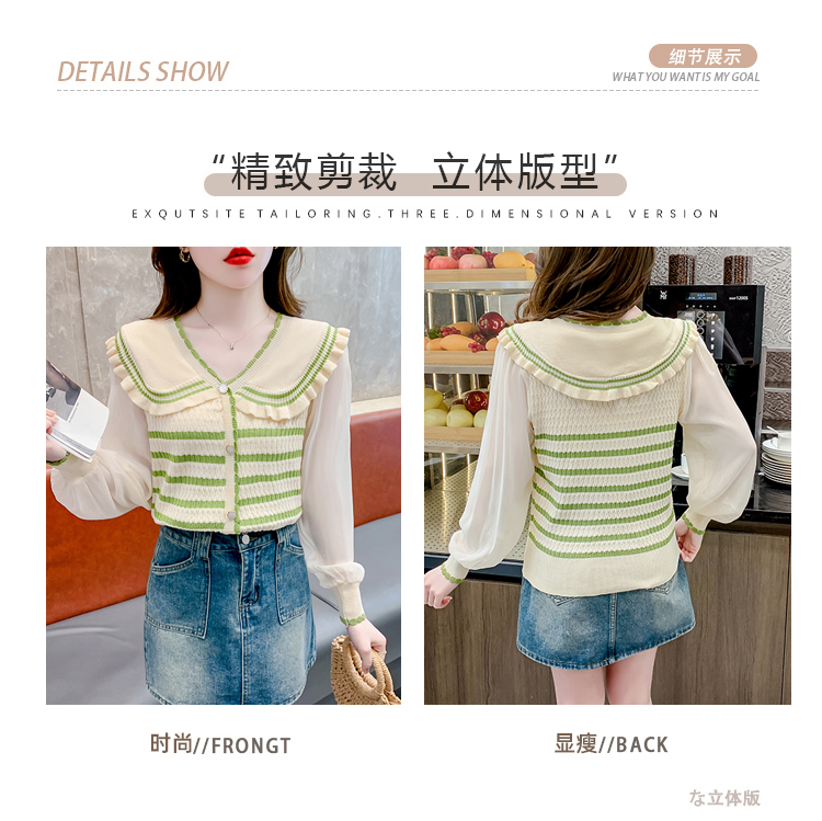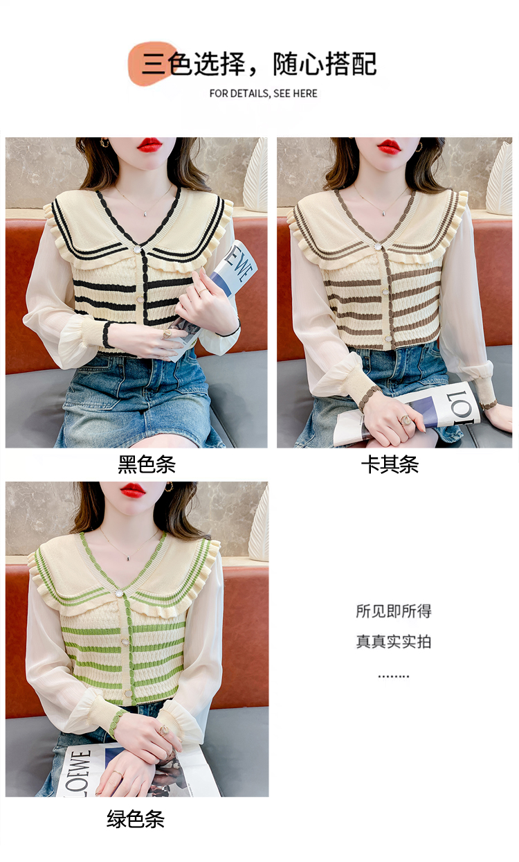 实拍2024春法式高级感撞色条纹娃娃领冰爽丝拼接雪纺减龄上衣