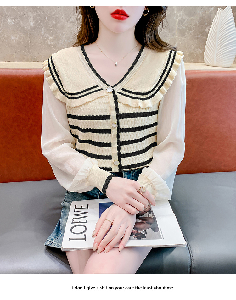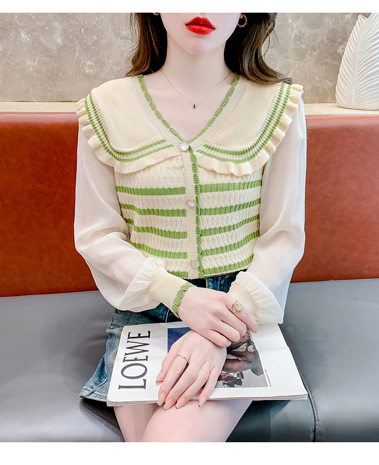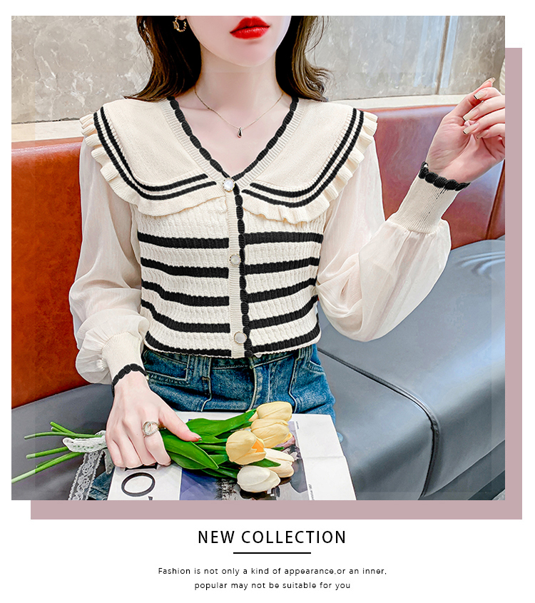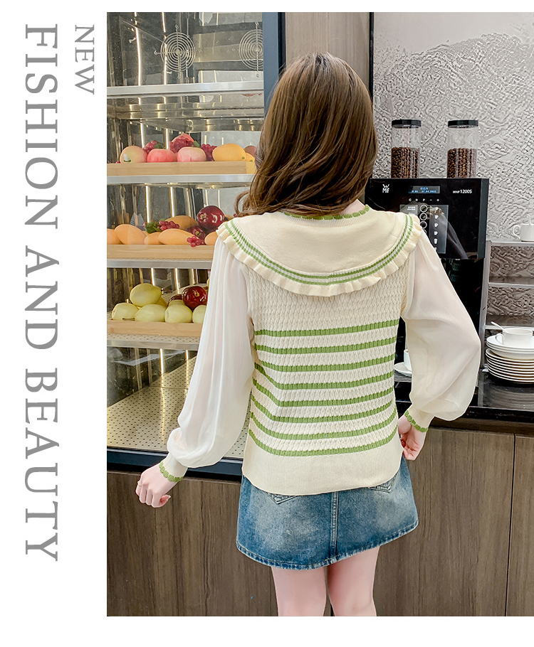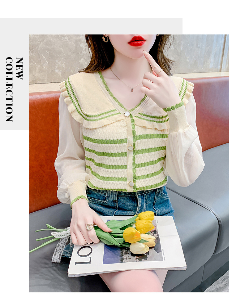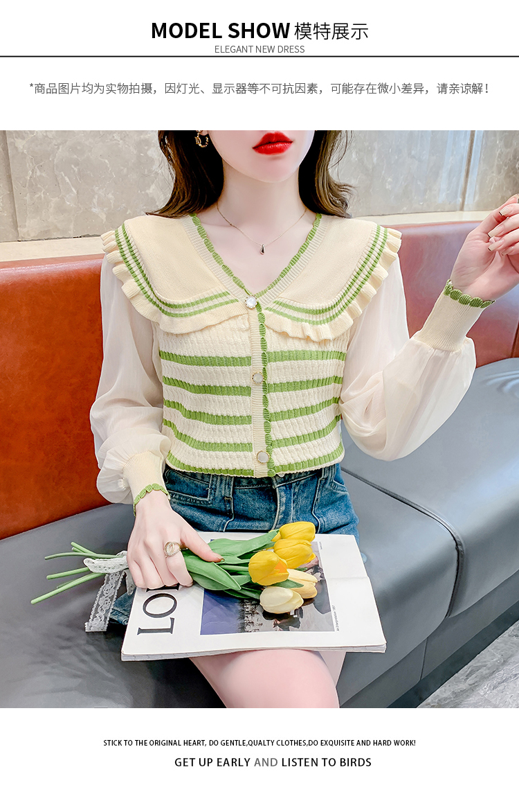 实拍2024春法式高级感撞色条纹娃娃领冰爽丝拼接雪纺减龄上衣