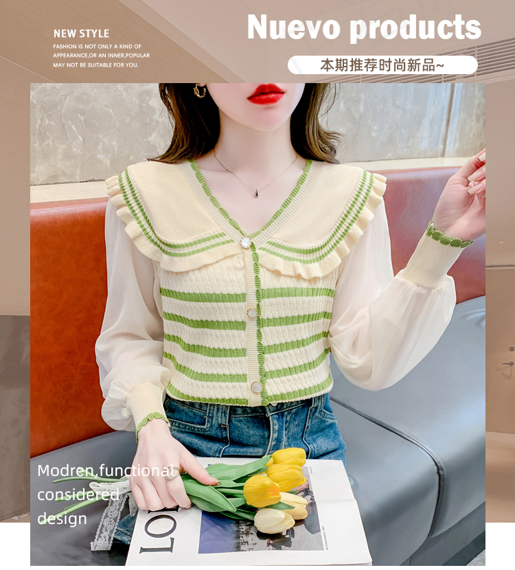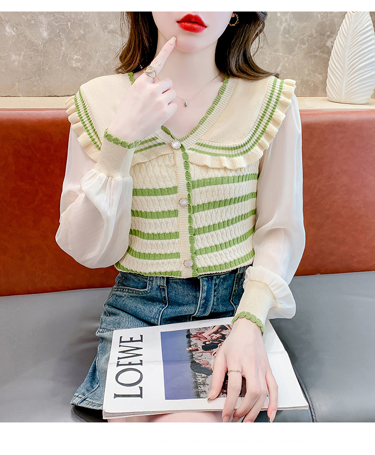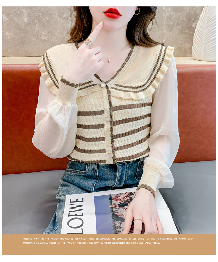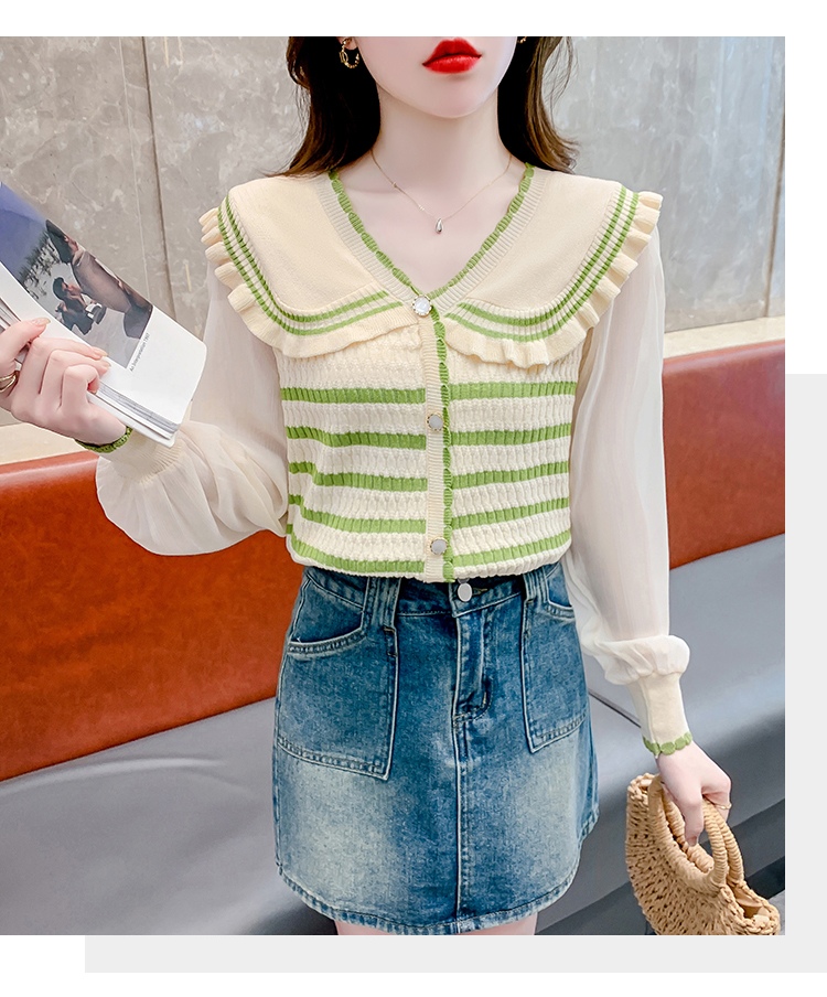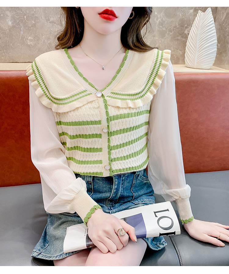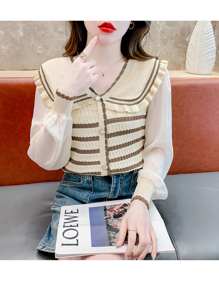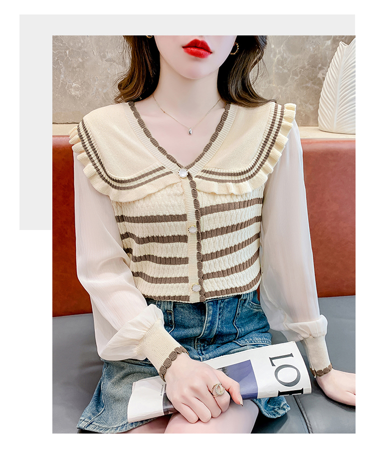实拍2024春法式高级感撞色条纹娃娃领冰爽丝拼接雪纺减龄上衣
