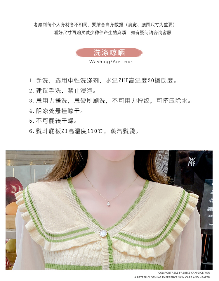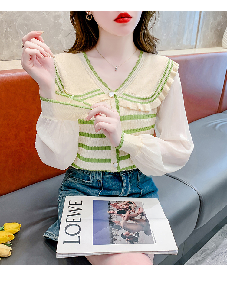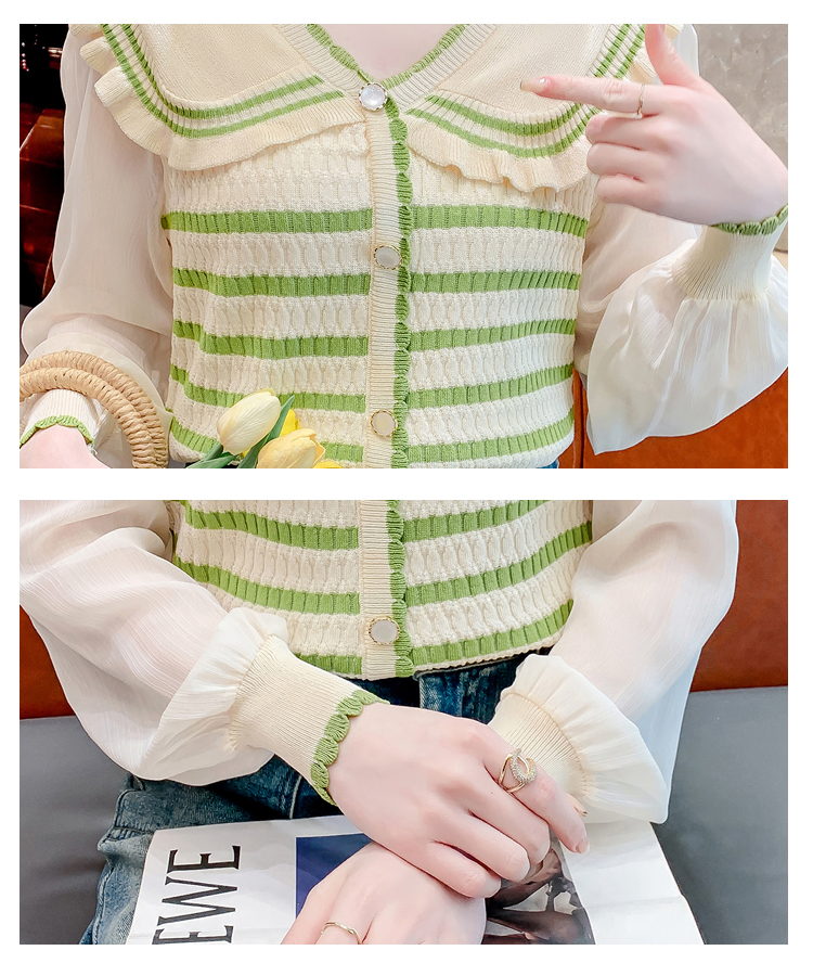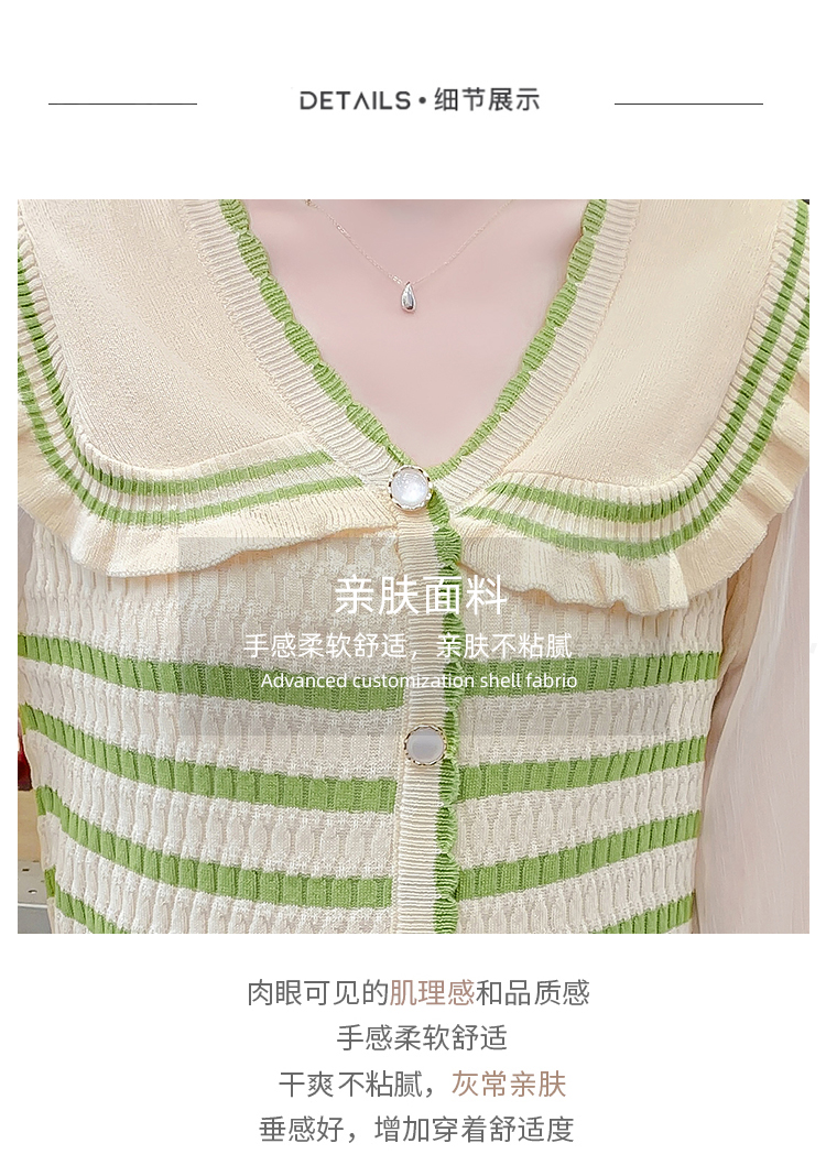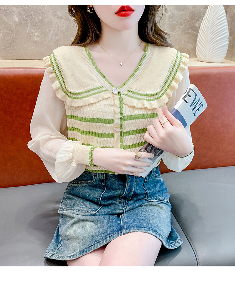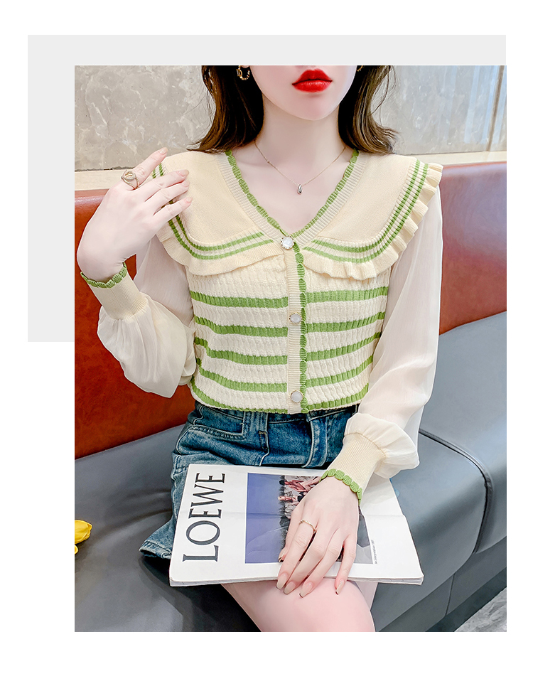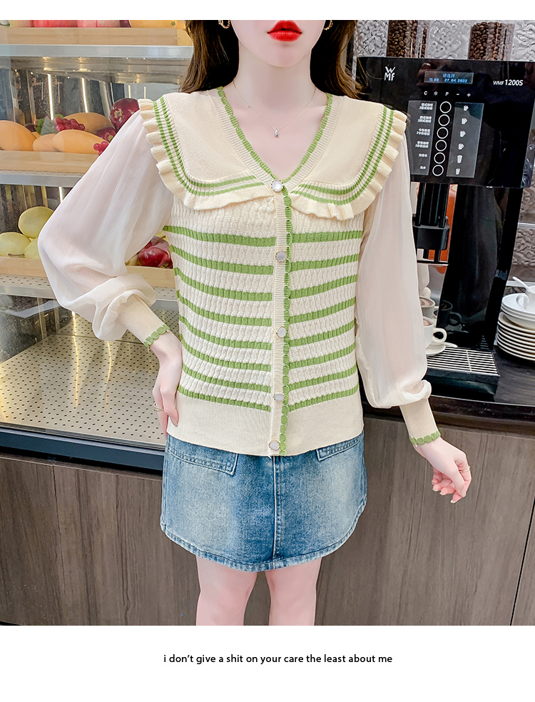 实拍2024春法式高级感撞色条纹娃娃领冰爽丝拼接雪纺减龄上衣