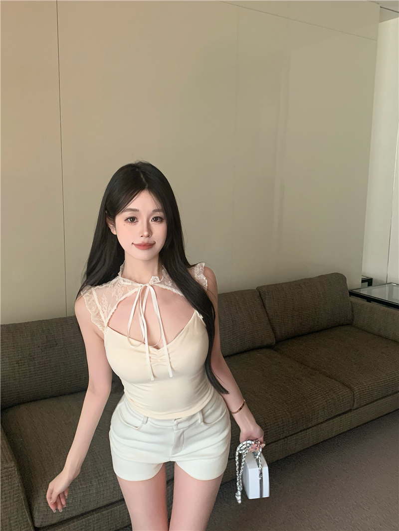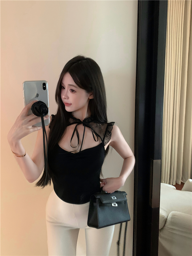 实拍实价 纯欲风背心蕾丝拼接设计性感上衣自带胸垫