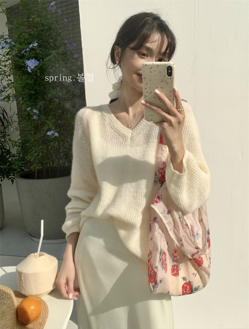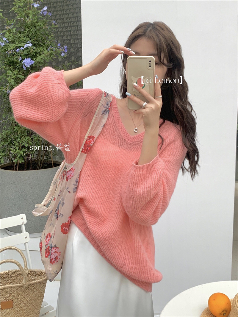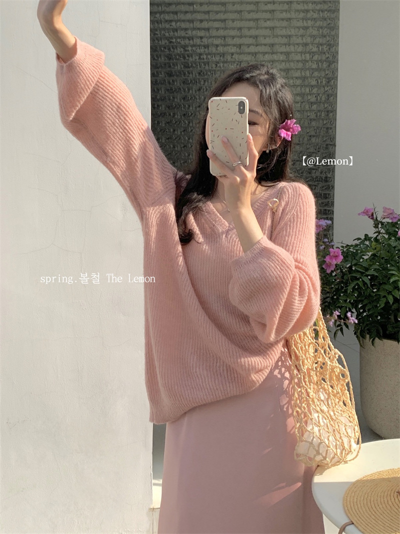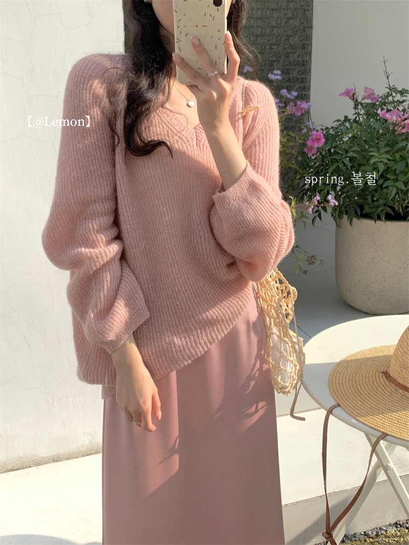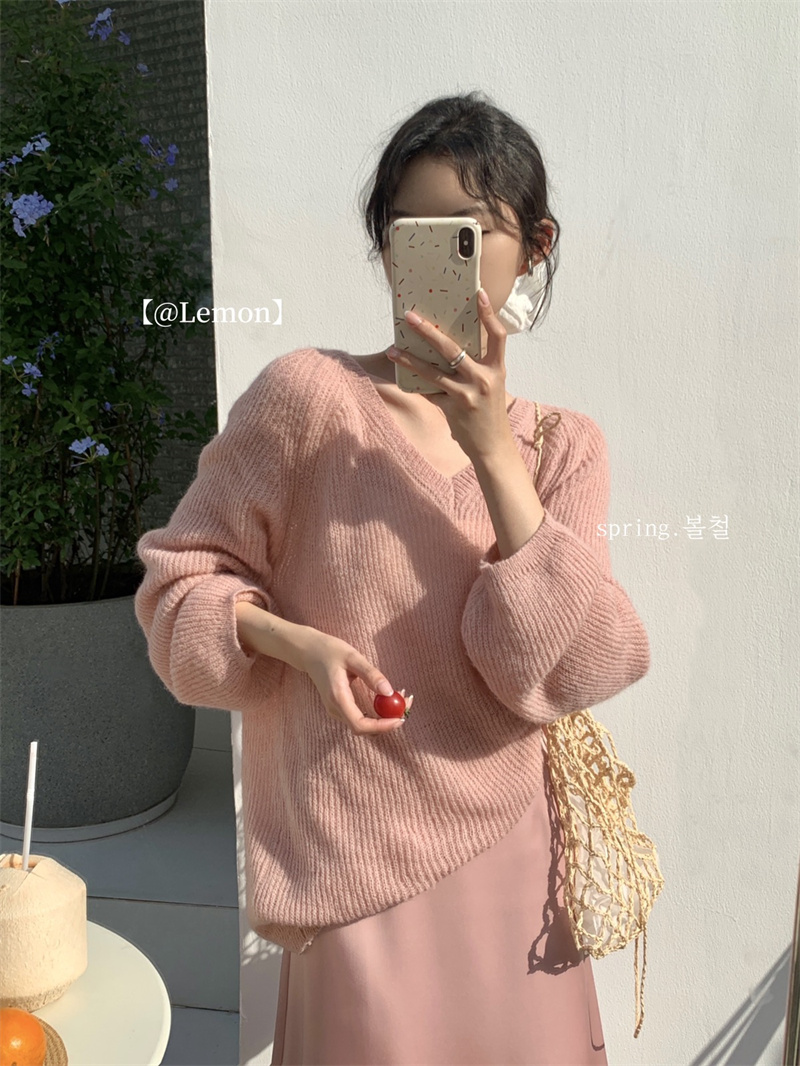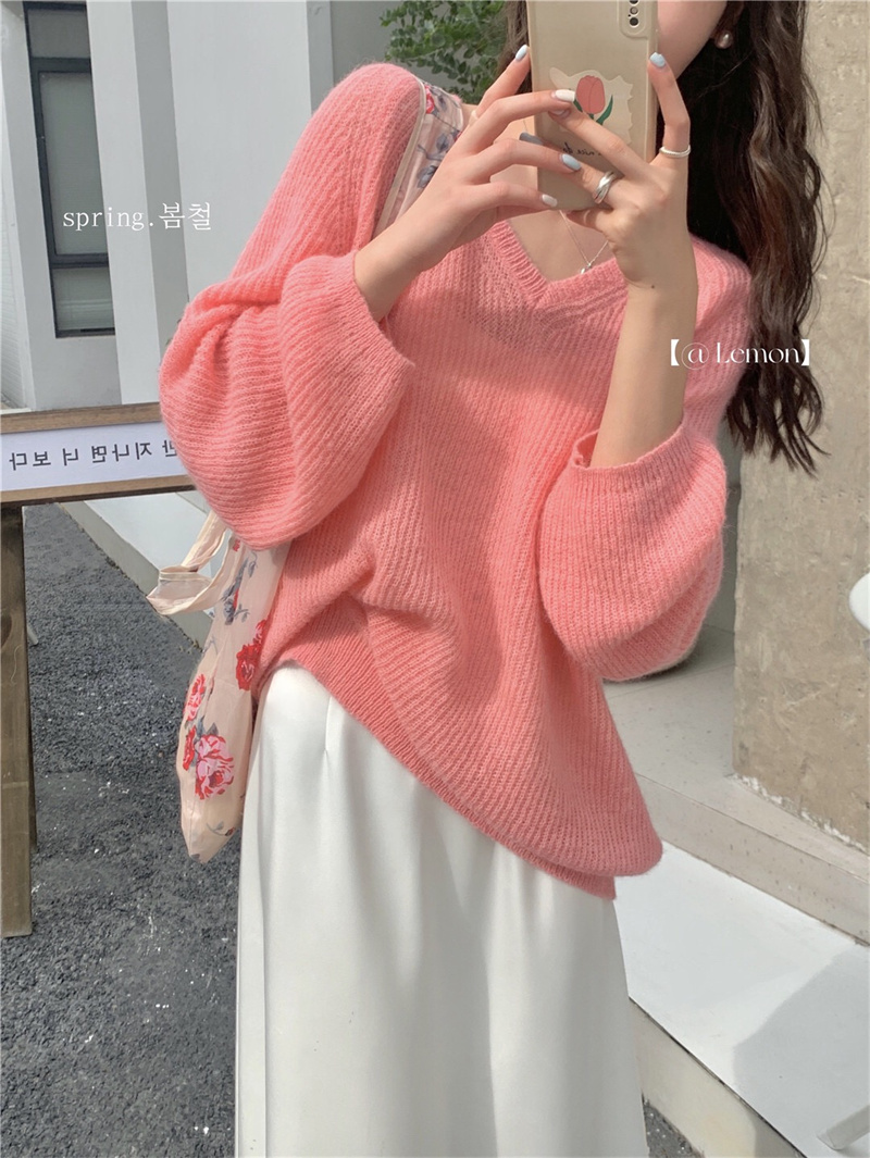 여성용 한국 스타일의 루즈하고 편안한 브이넥 스웨터, 봄철 루즈핏 상의