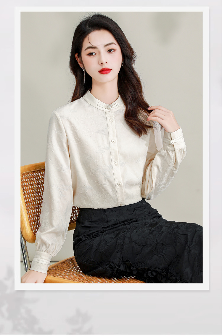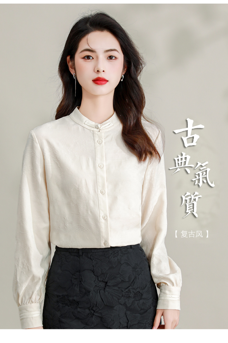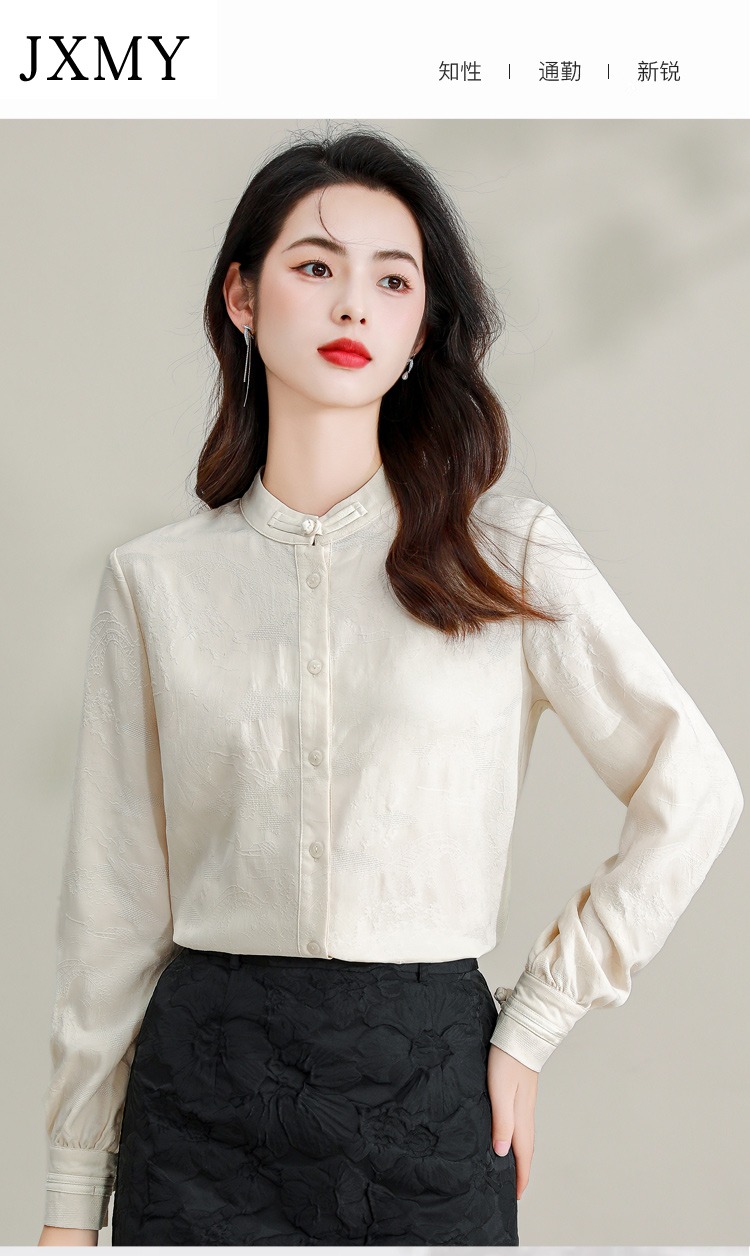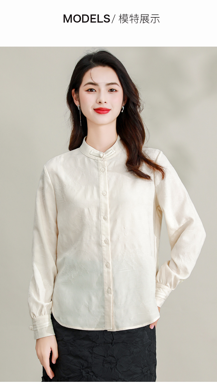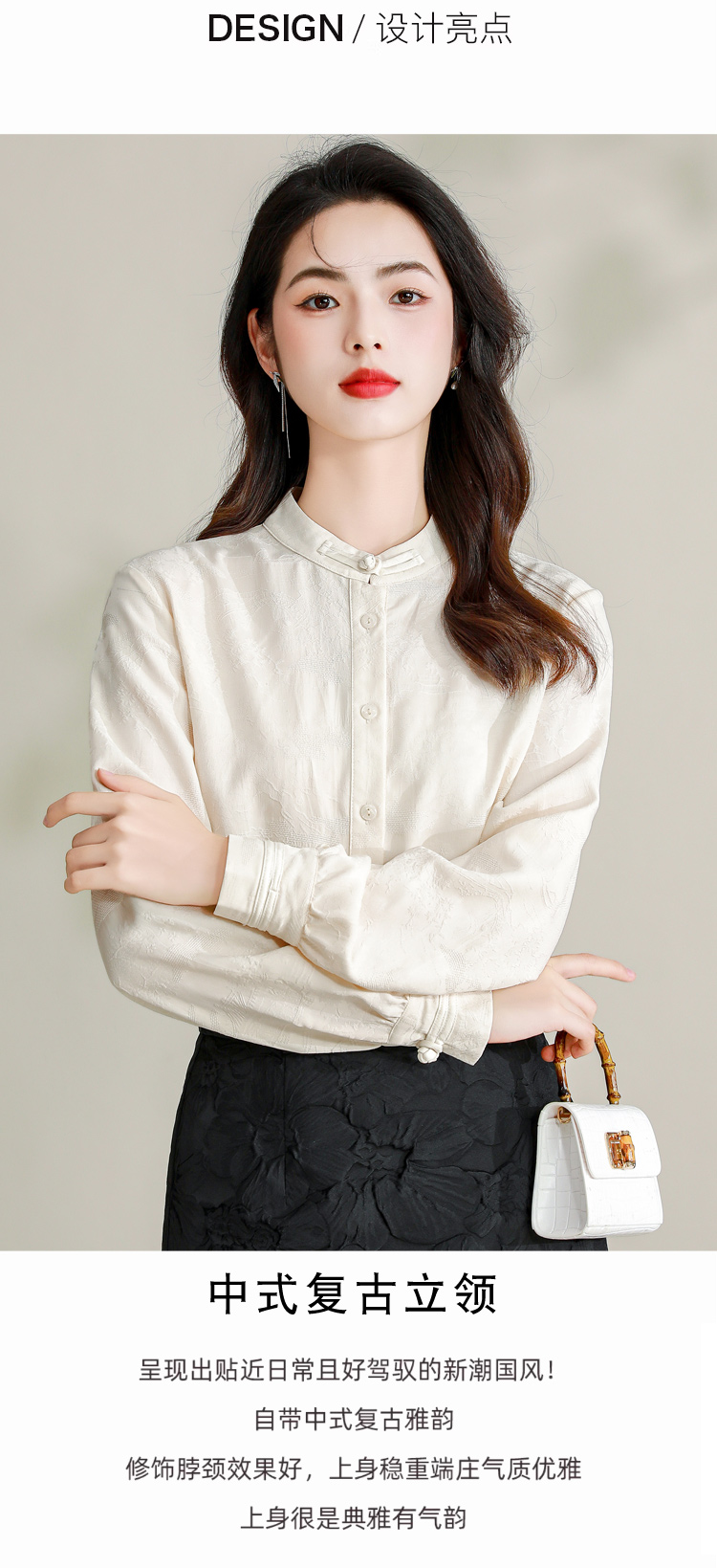 实拍雾漫白茶新中式立领提花衬衫早春高级感国风长袖上衣