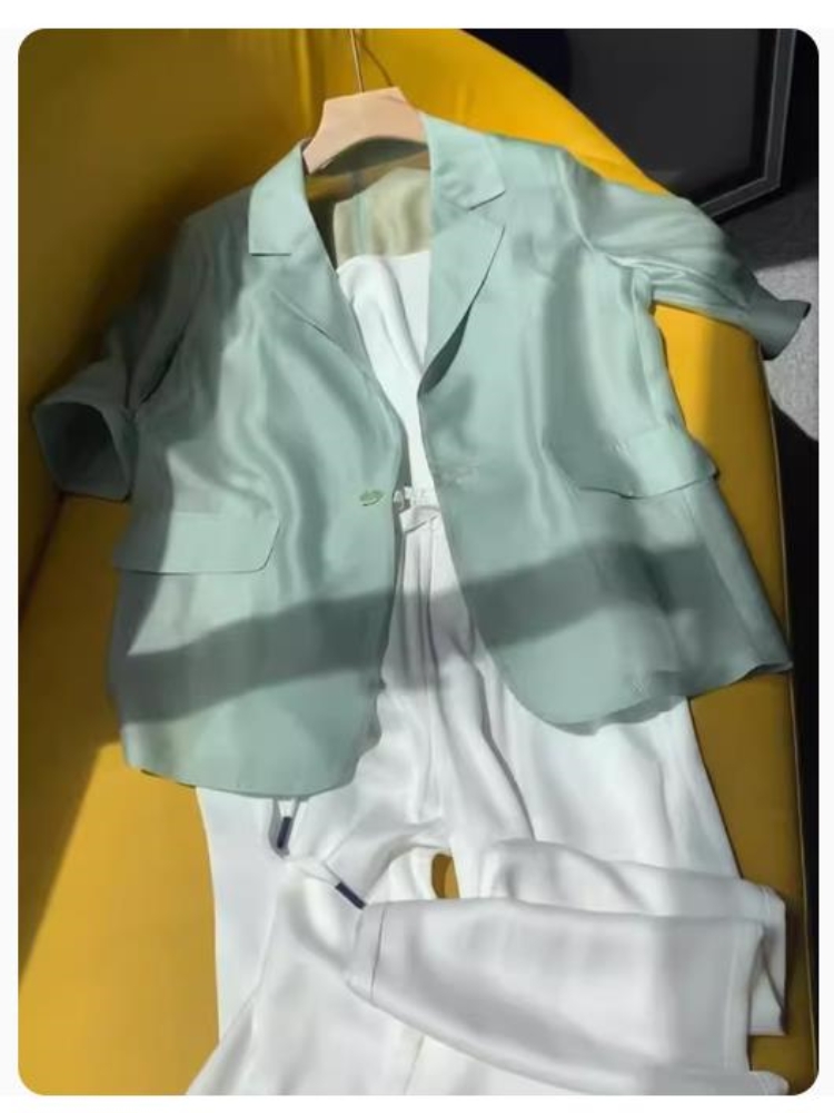 欧货高级感西装领天丝短袖衬衫薄款宽松休闲简约别致外搭开衫上衣