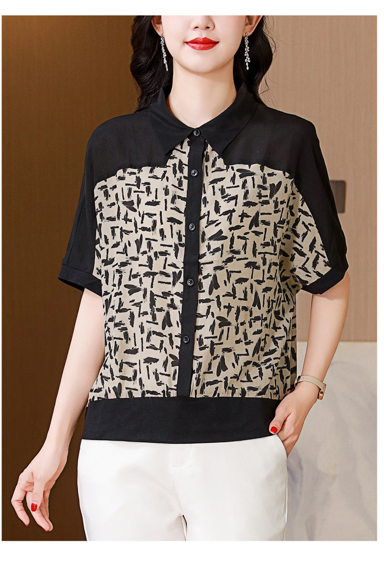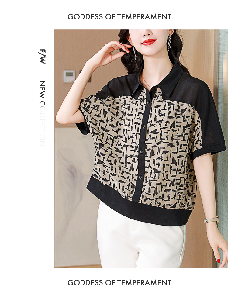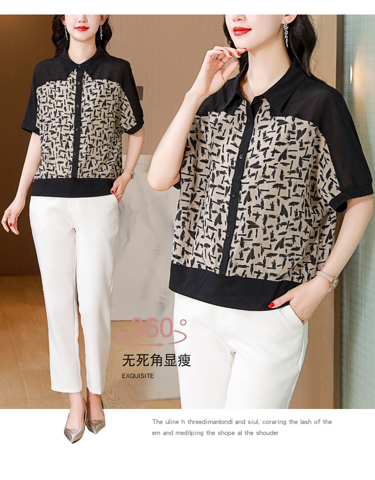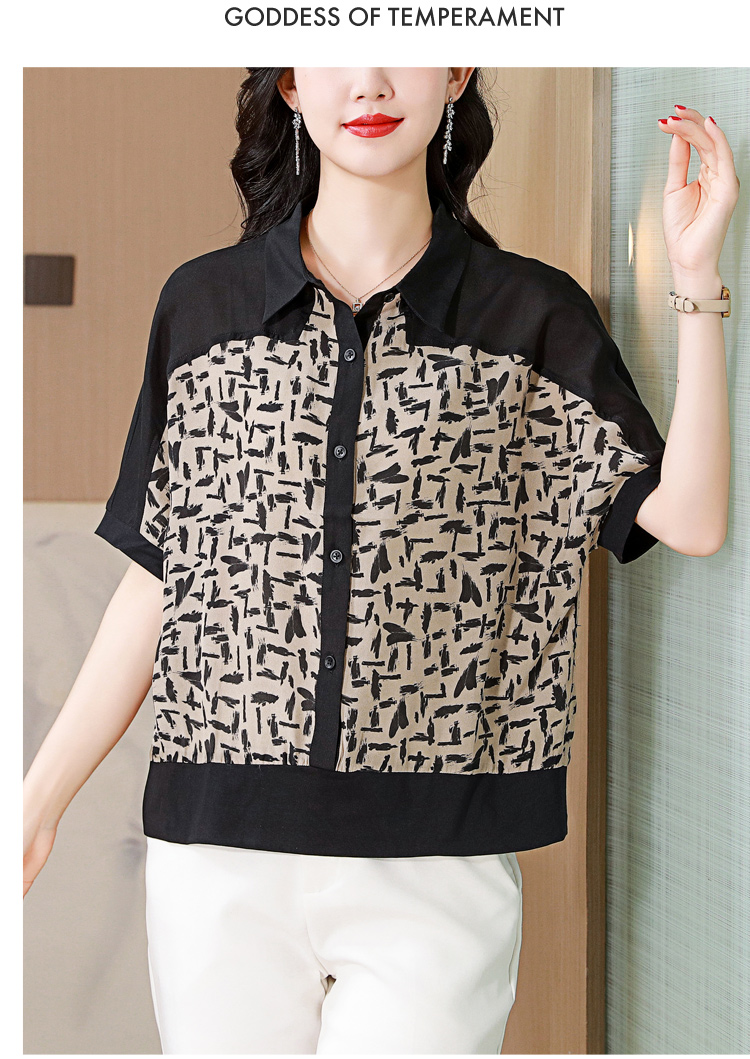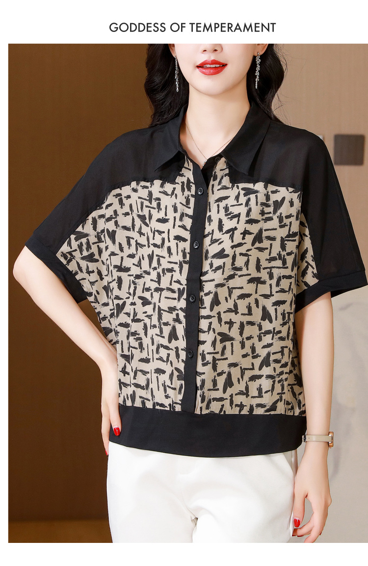 유럽 버전 배트 슬리브 여성 실크 셔츠 2024년 여름 신스타일 작은 셔츠 대비 색상 접합 멀버리 실크 셔츠의 실제 샷