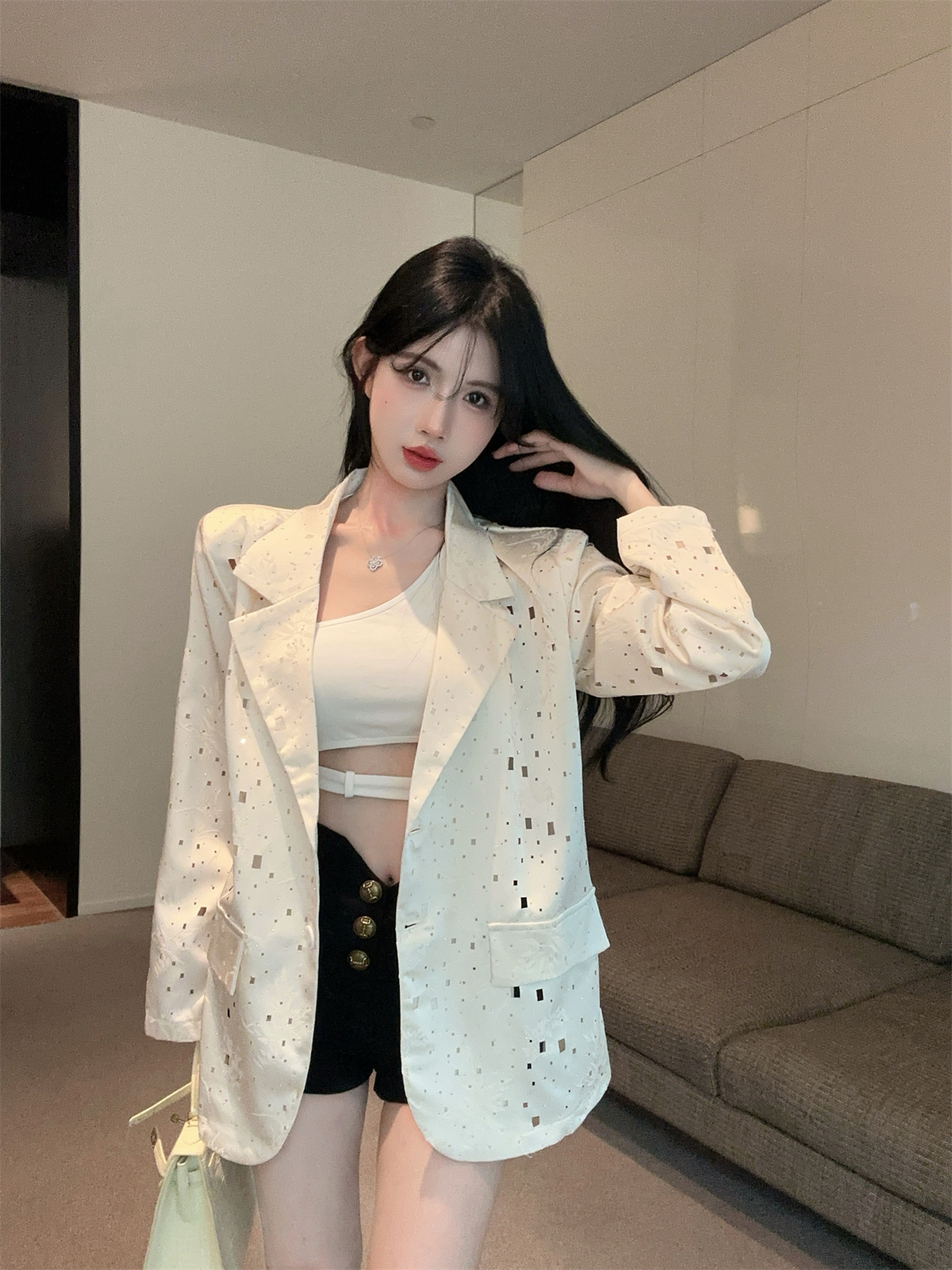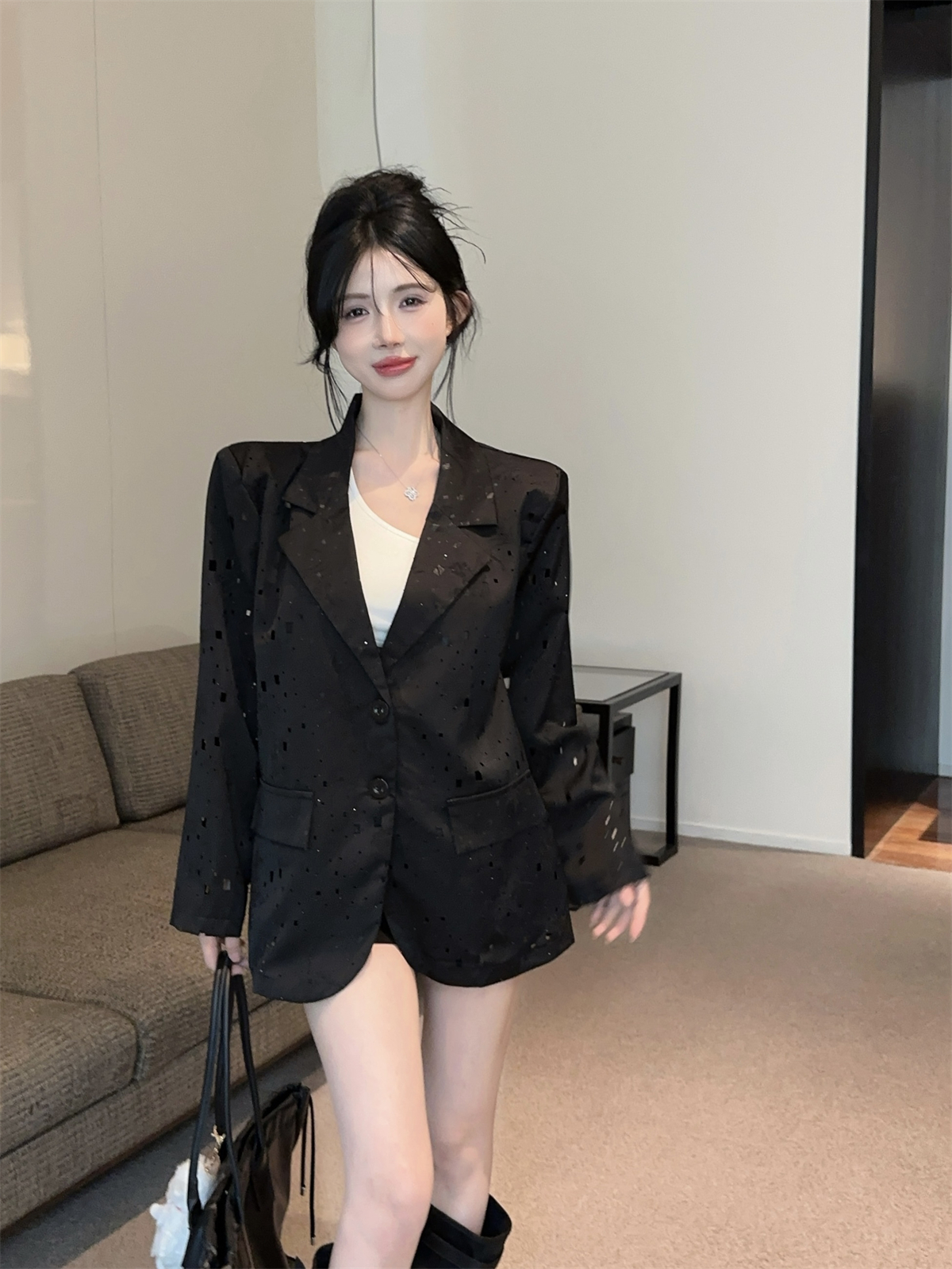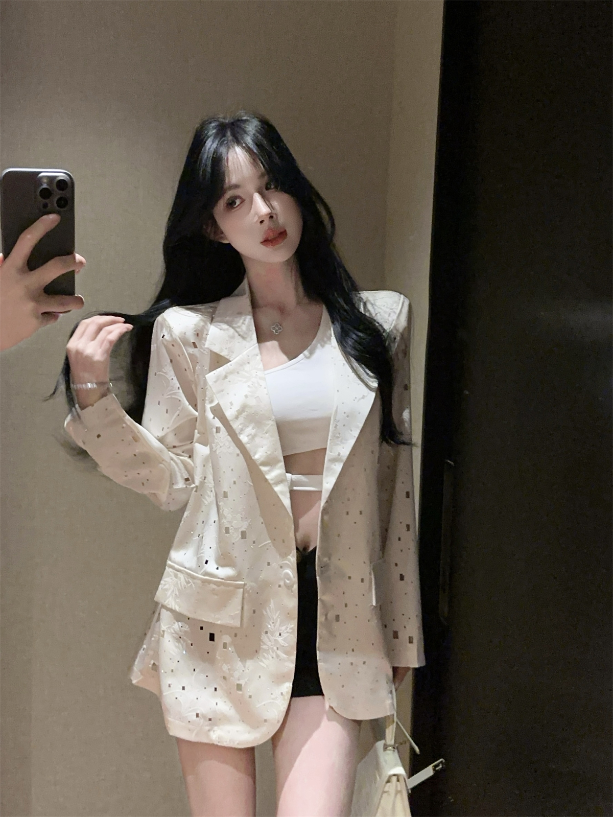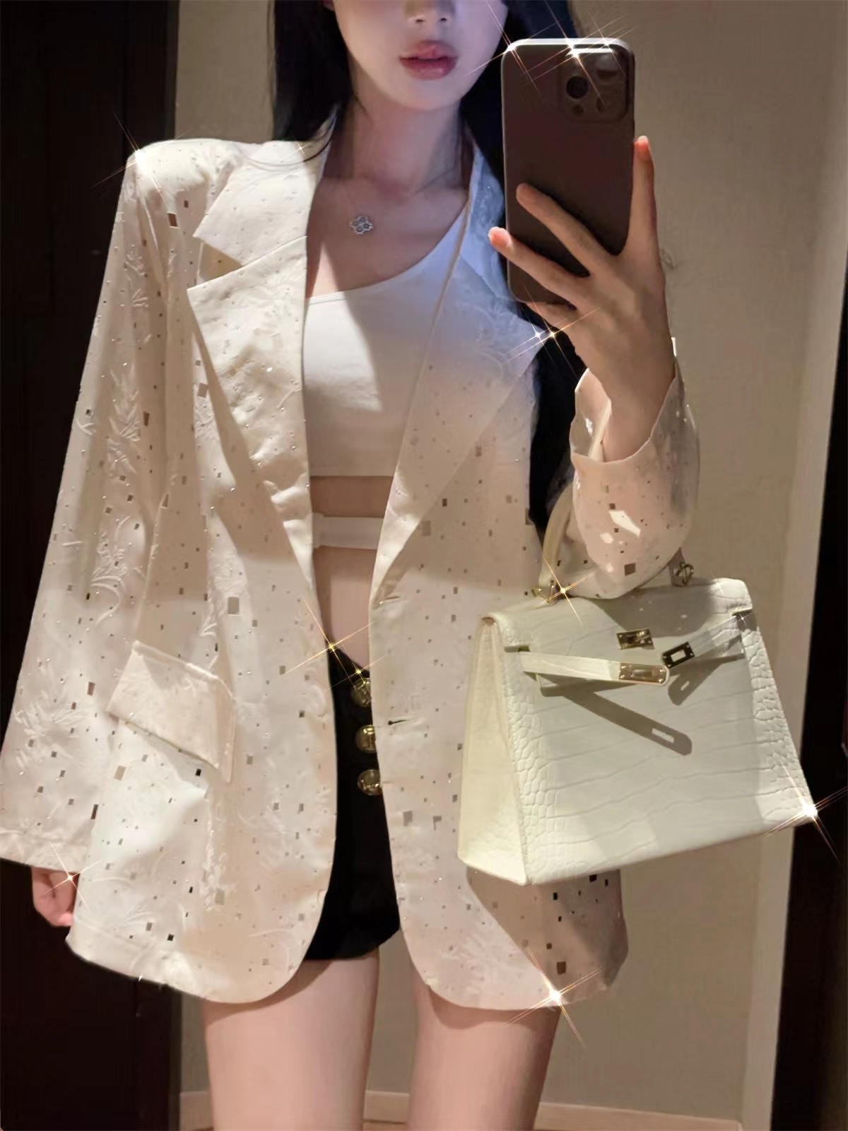 实拍实价 设计感镂空烫钻西装宽松外套女秋中长款
