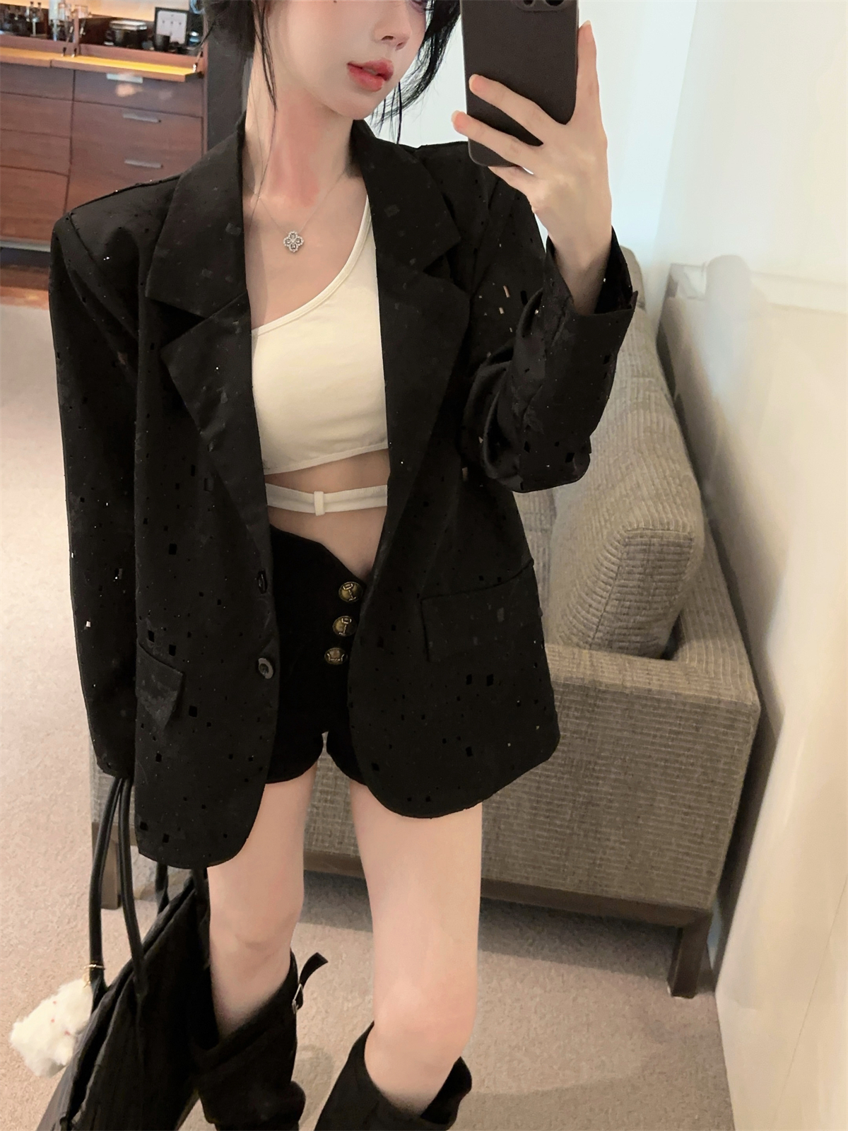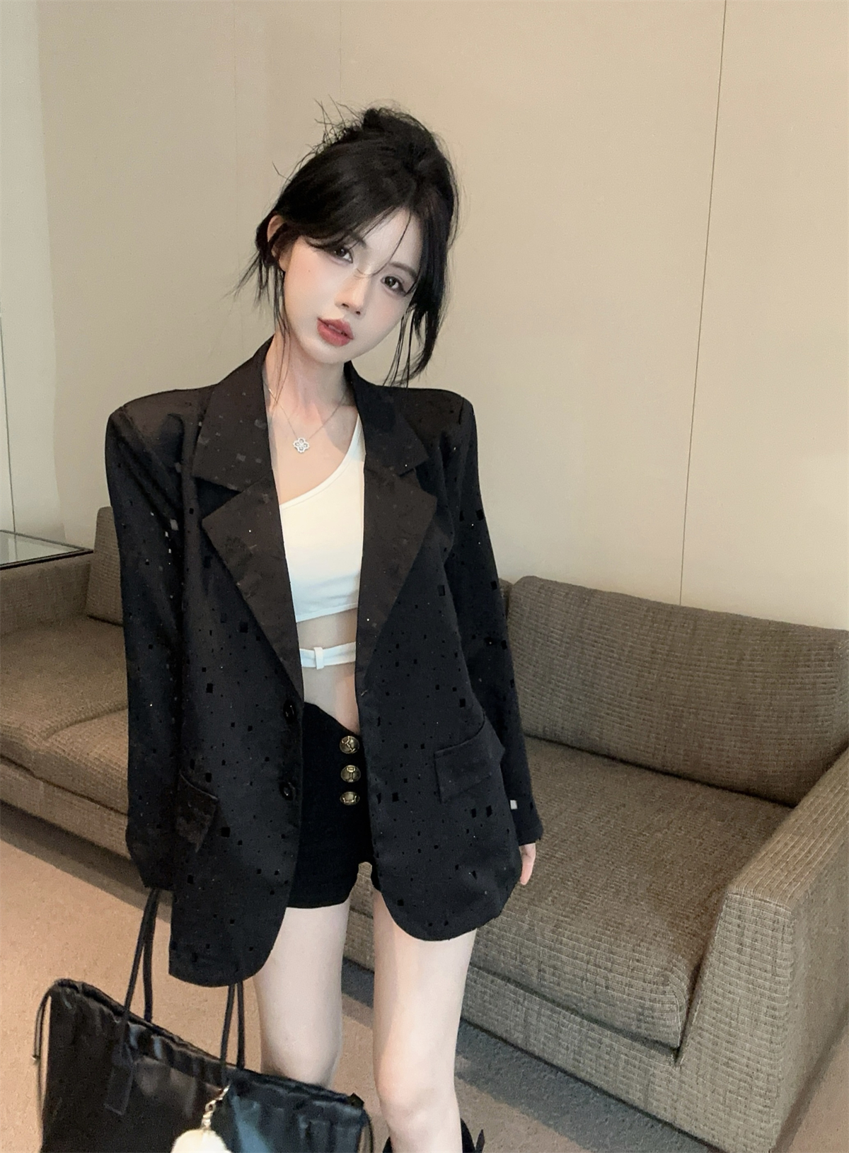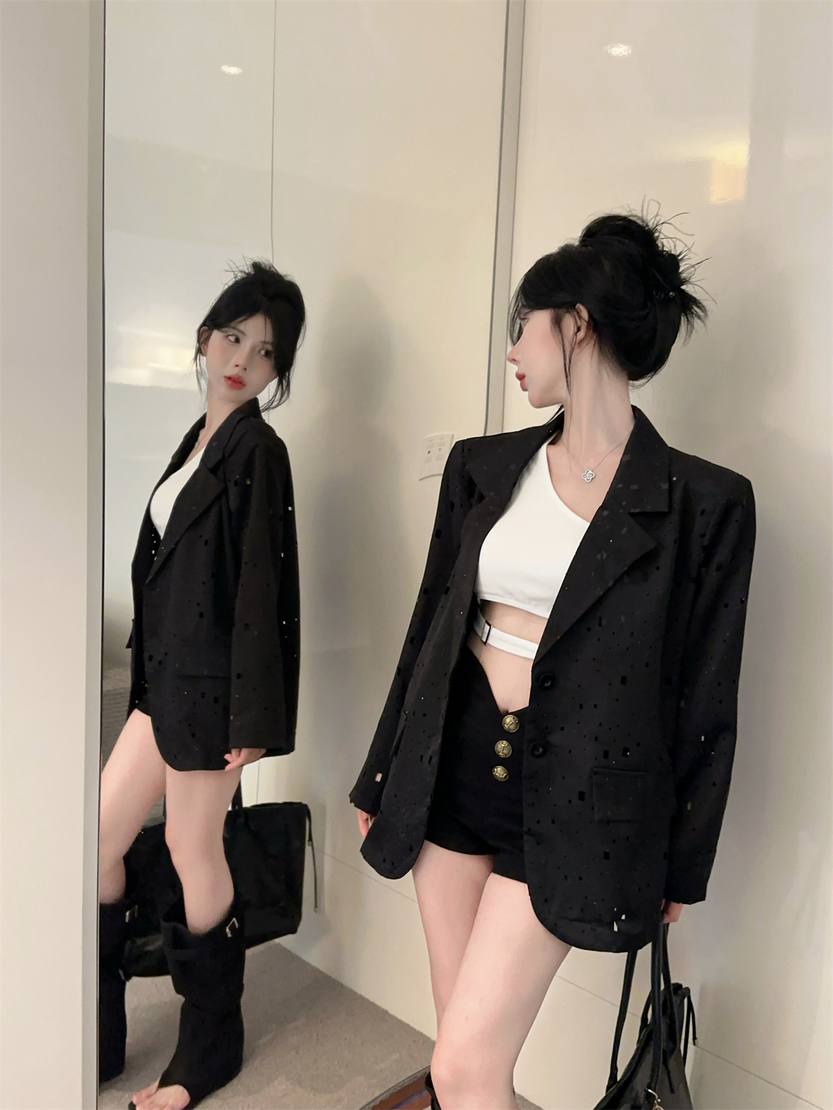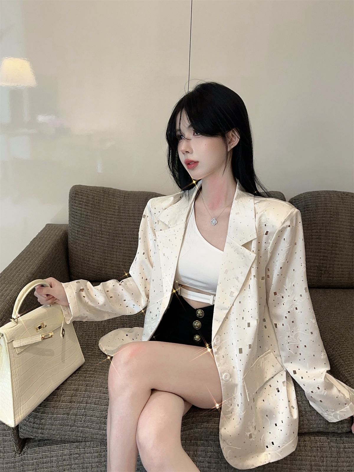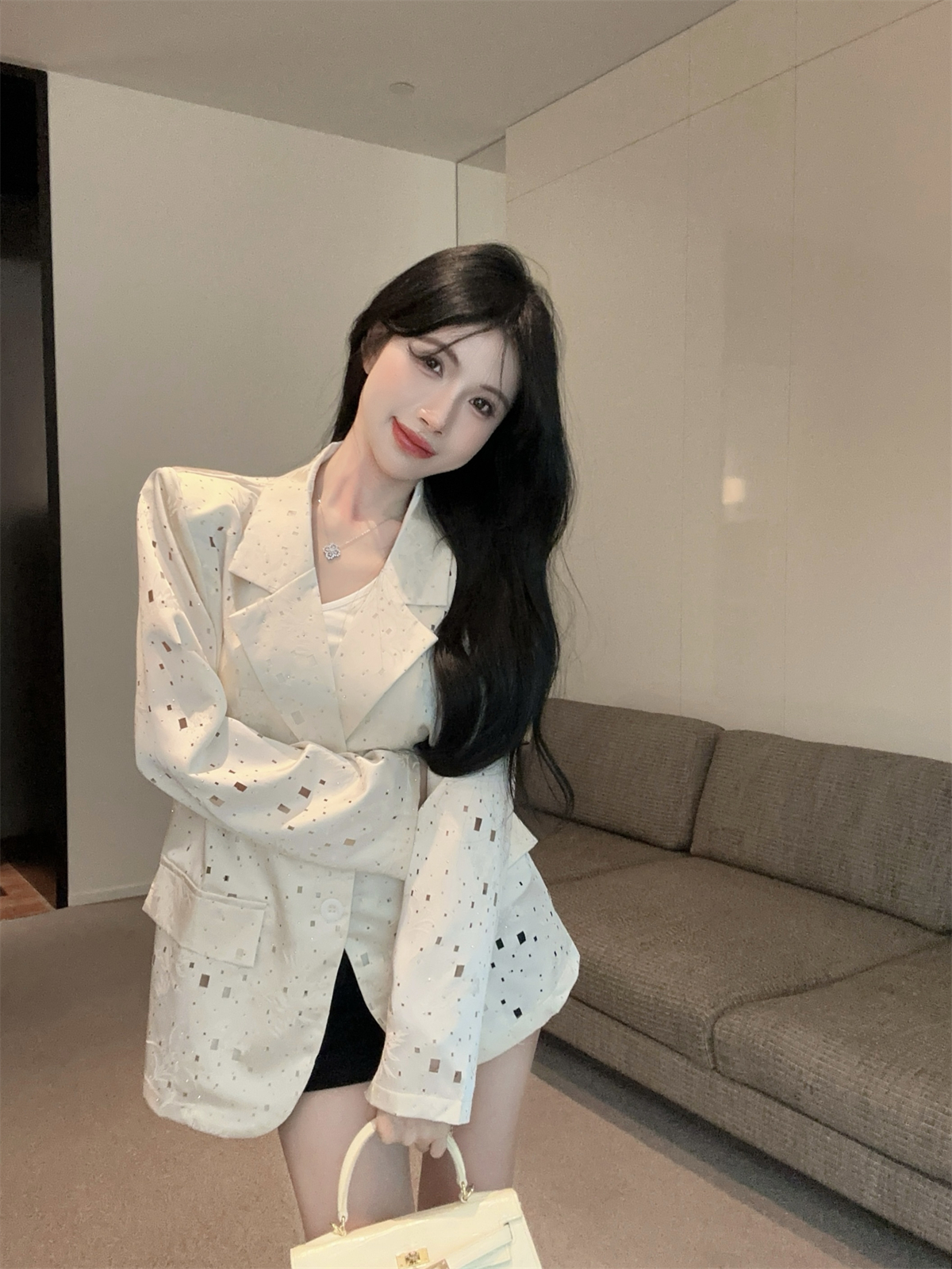 实拍实价 设计感镂空烫钻西装宽松外套女秋中长款