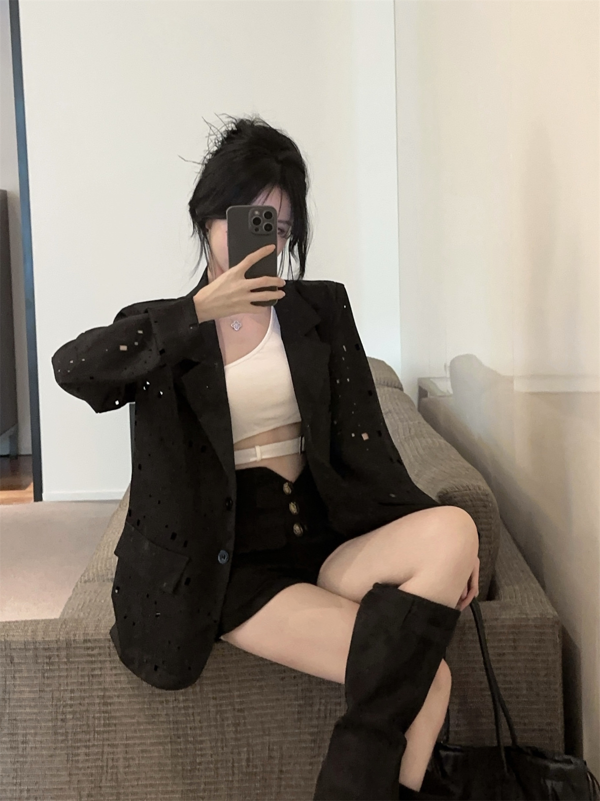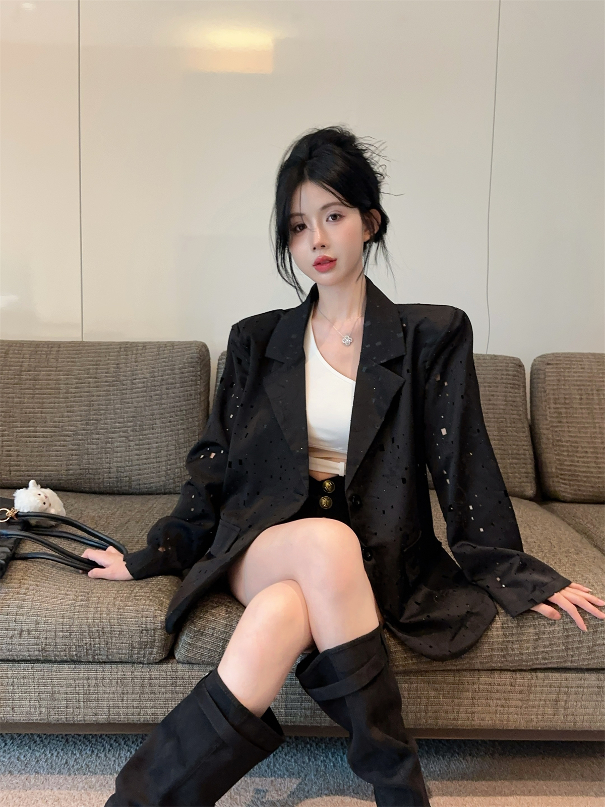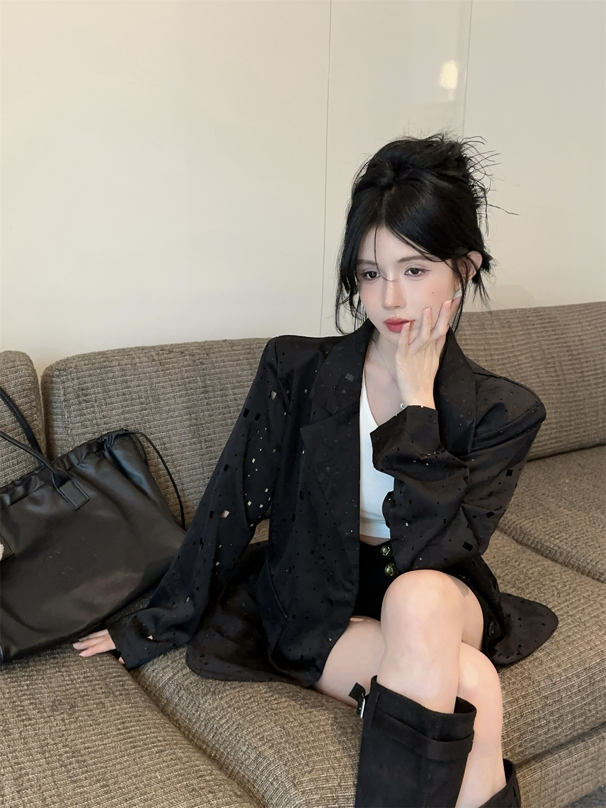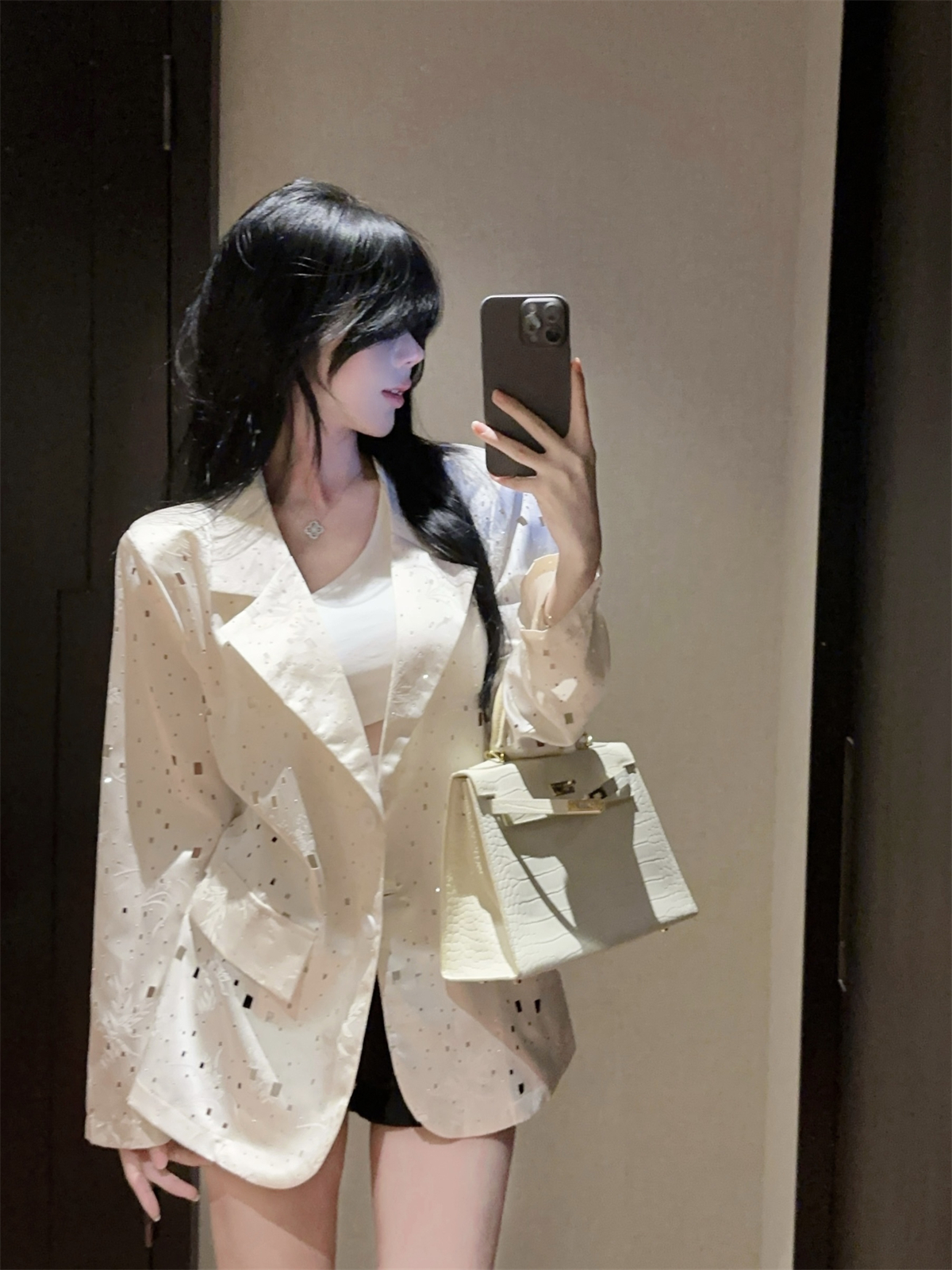 实拍实价 设计感镂空烫钻西装宽松外套女秋中长款