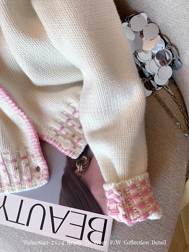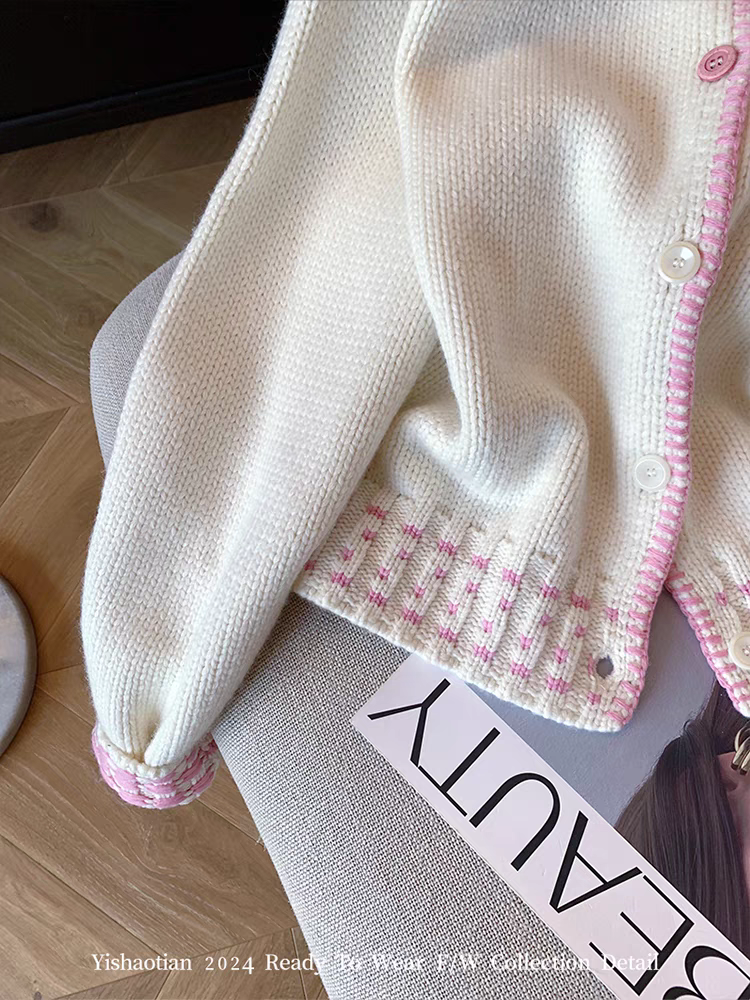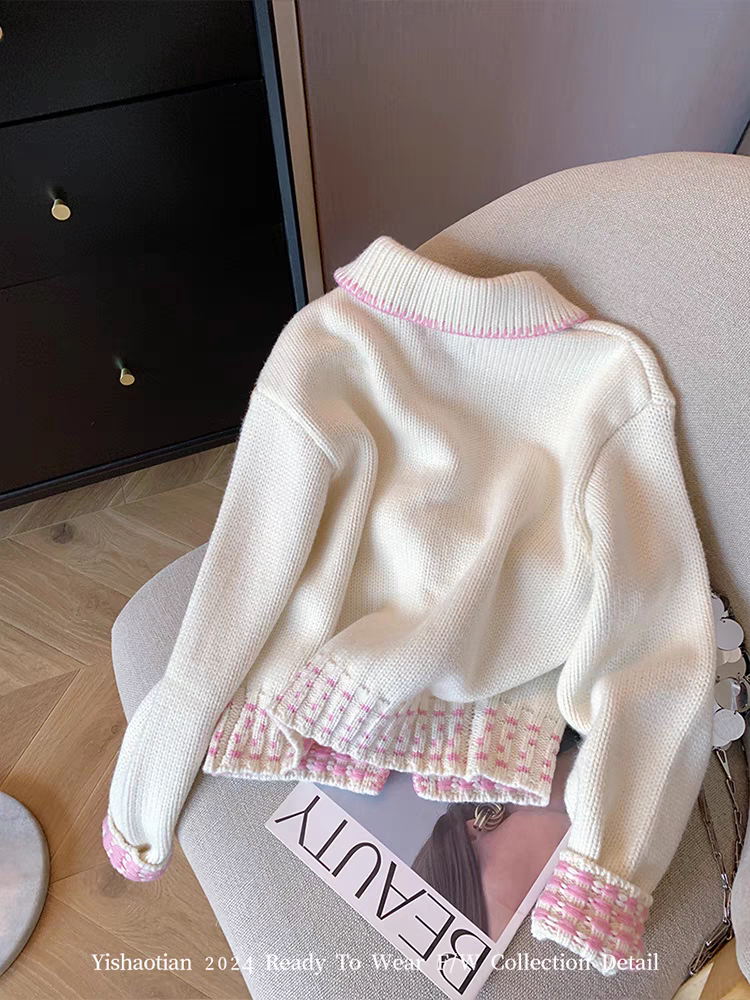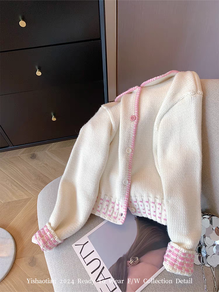 여성용 핑크 컬러 블록 피터팬 칼라 가디건 스웨터, 2024년 가을 신상 스타일, 부드럽고 사랑스러우며 젊은 감각의 니트 코트.