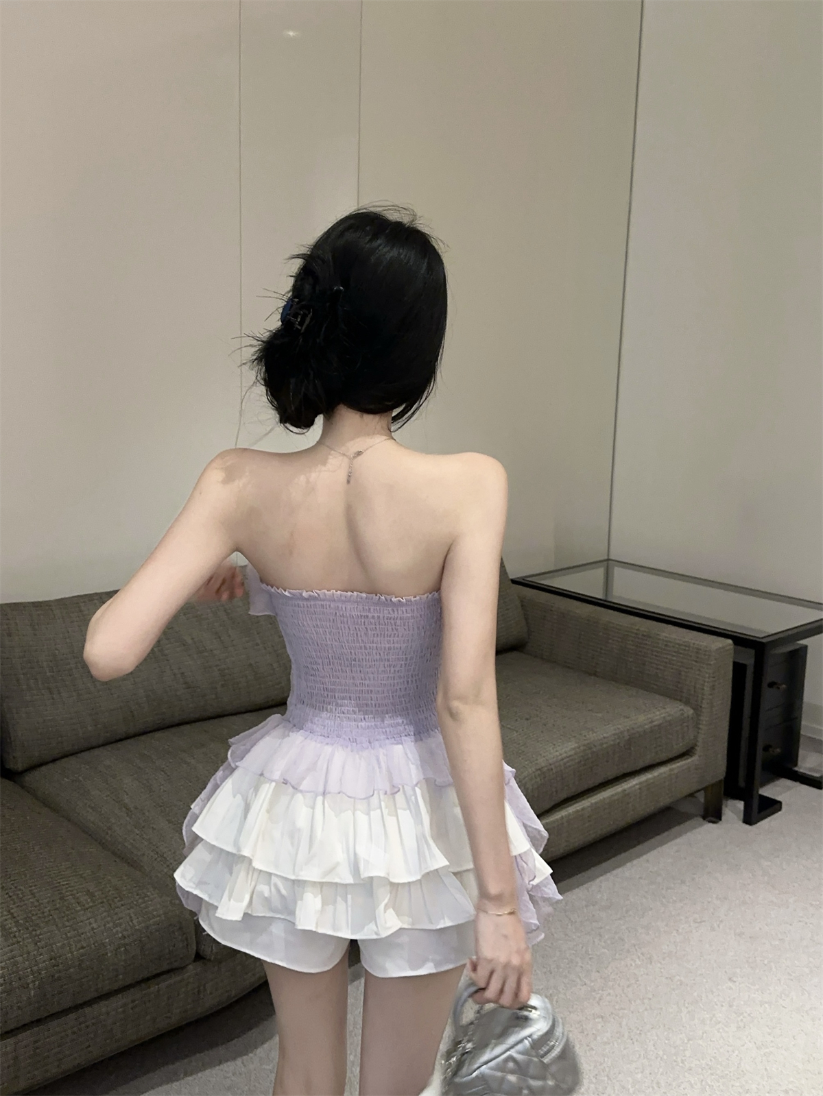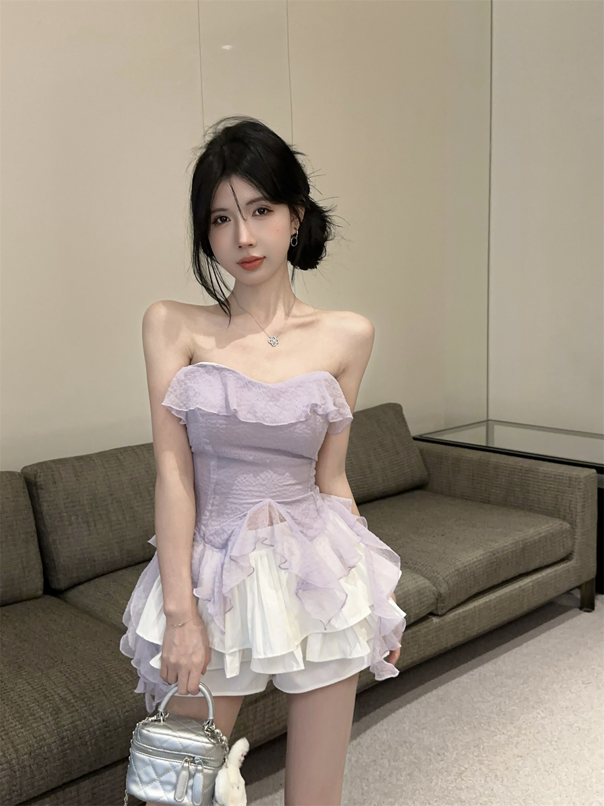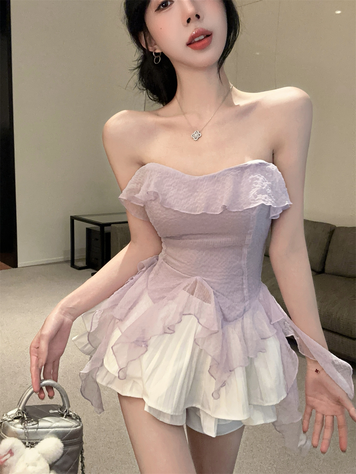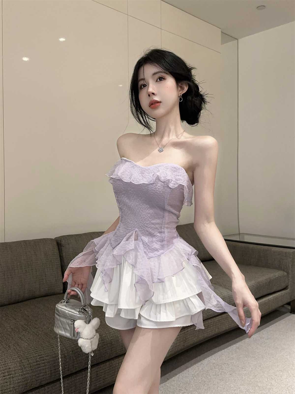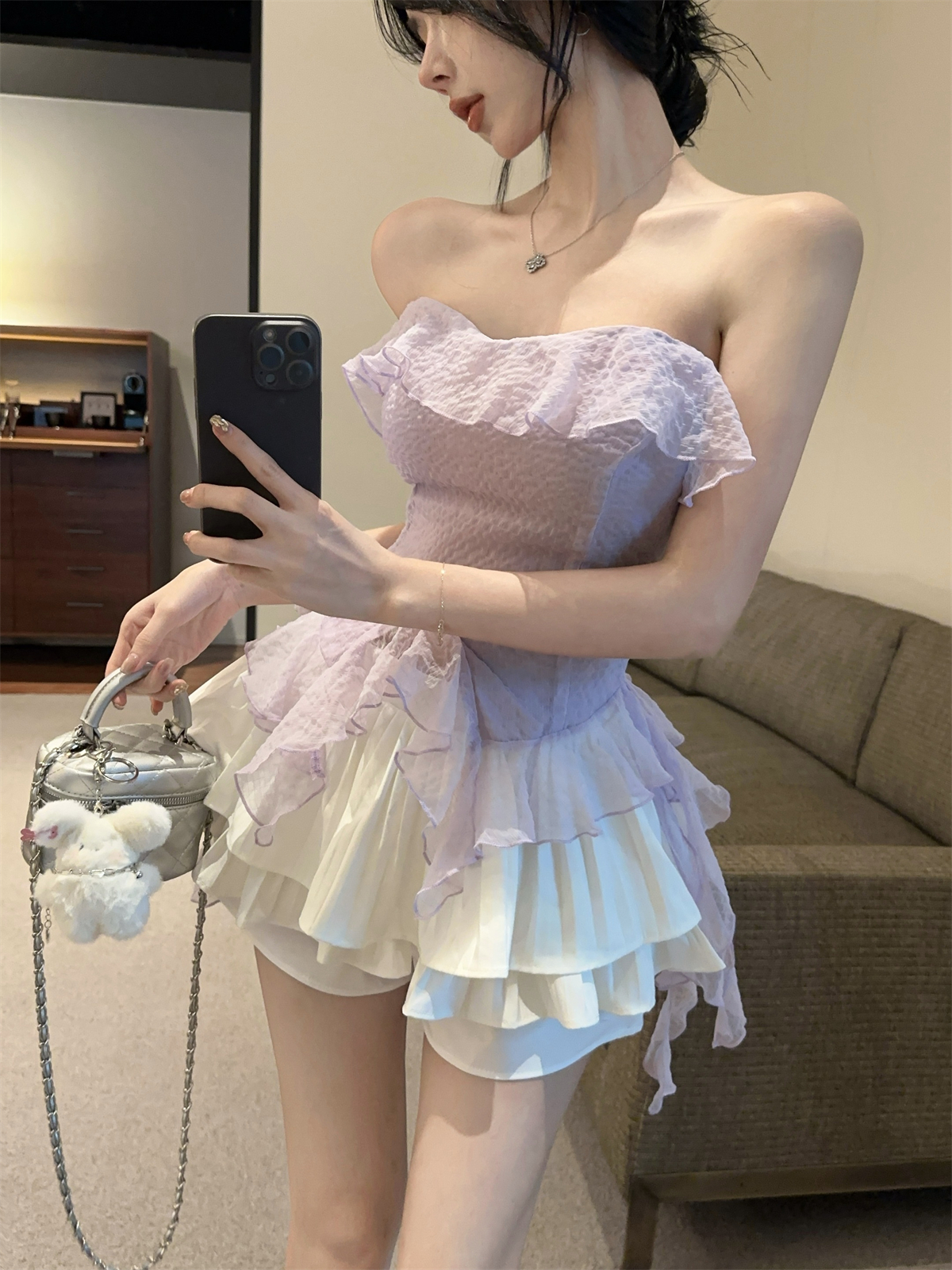 실제 촬영 및 실제 가격 러플 불규칙 튜브 탑 프렌치 쉬폰 탑 케이크 스커트 여성 패션 슈트