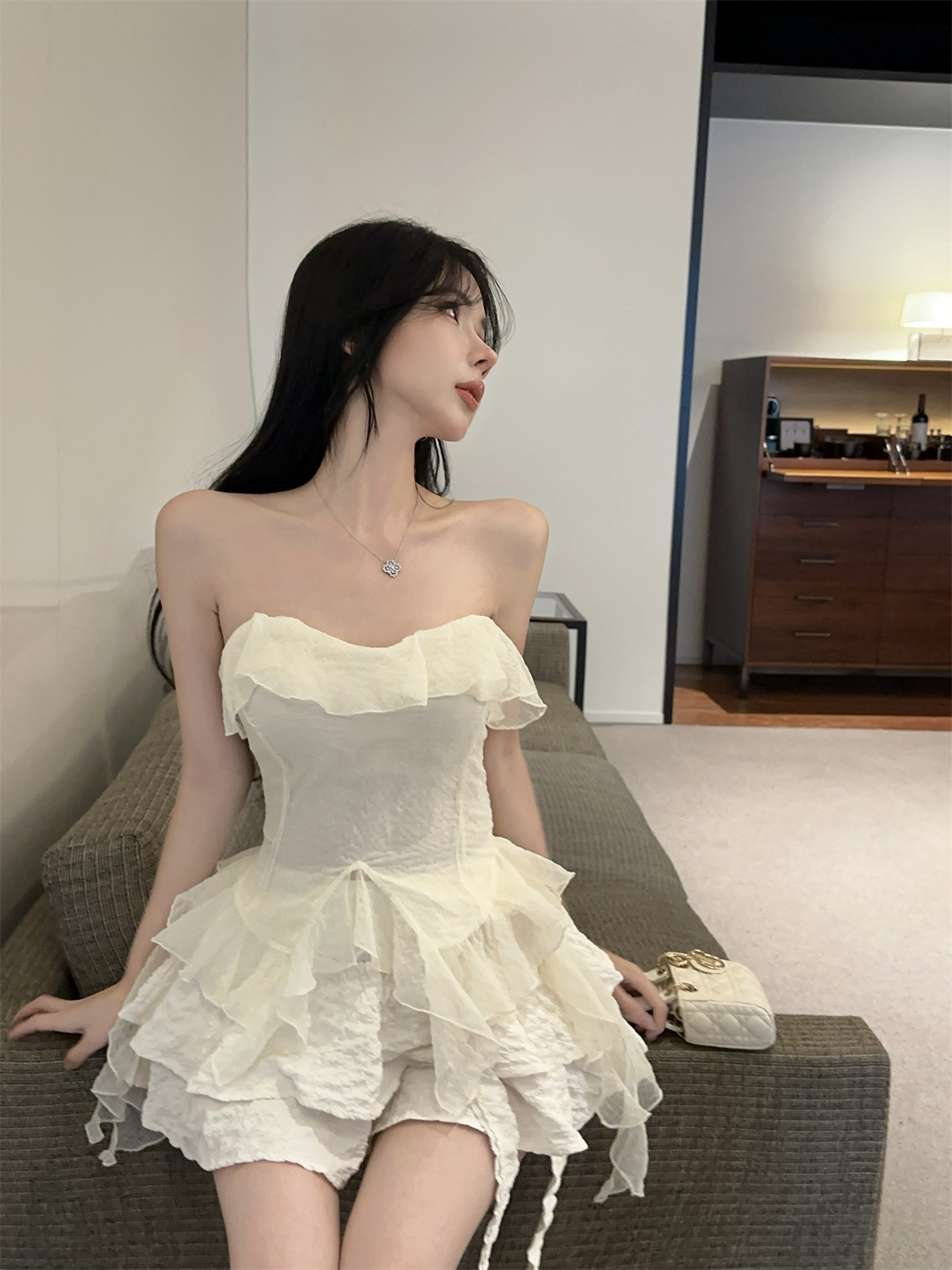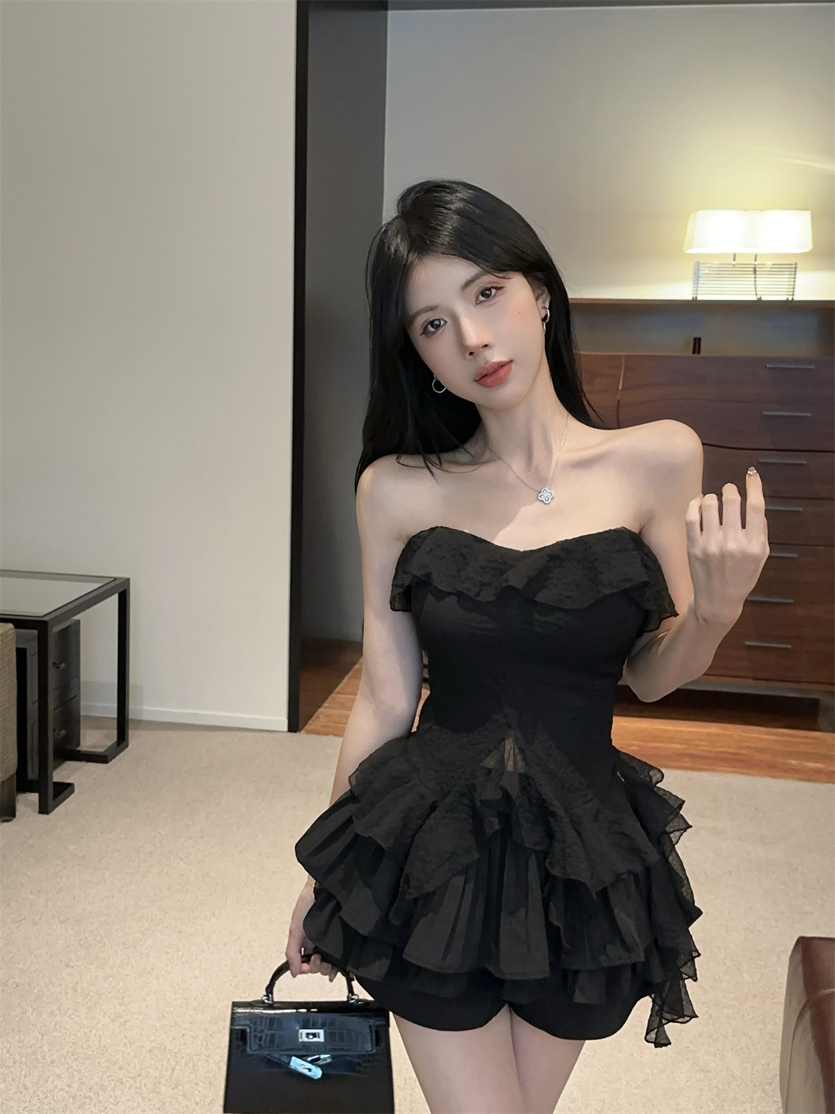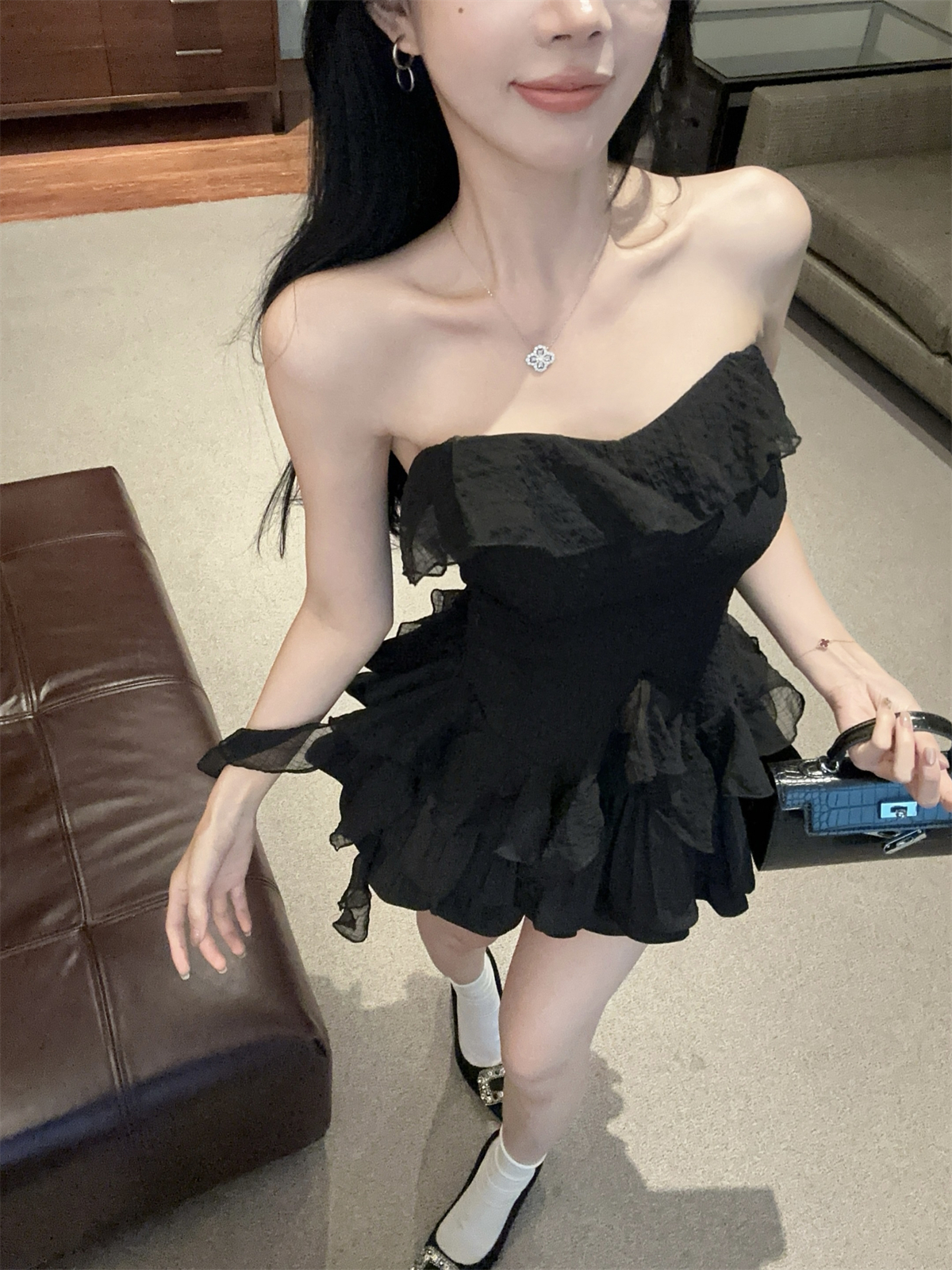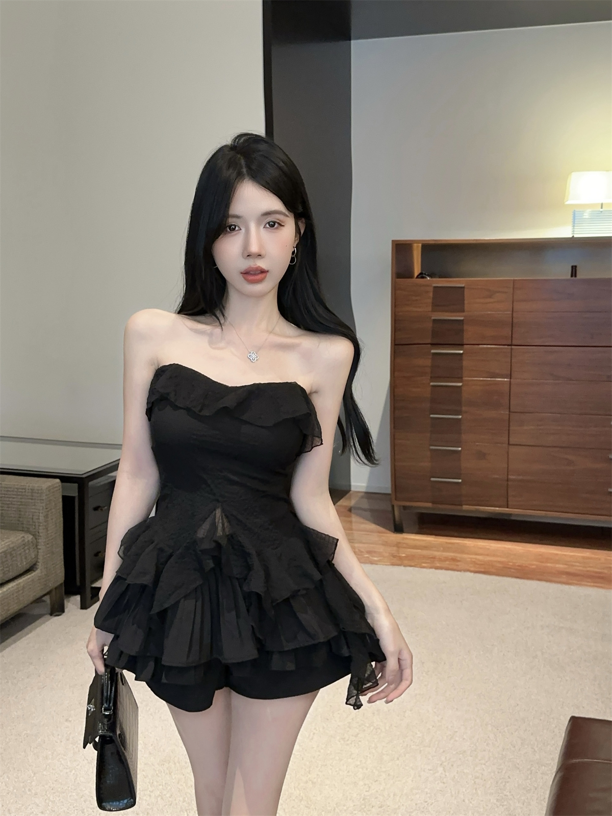 실제 촬영 및 실제 가격 러플 불규칙 튜브 탑 프렌치 쉬폰 탑 케이크 스커트 여성 패션 슈트