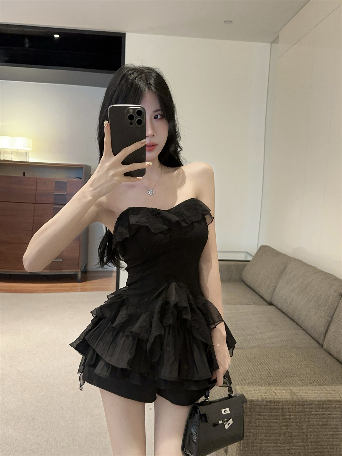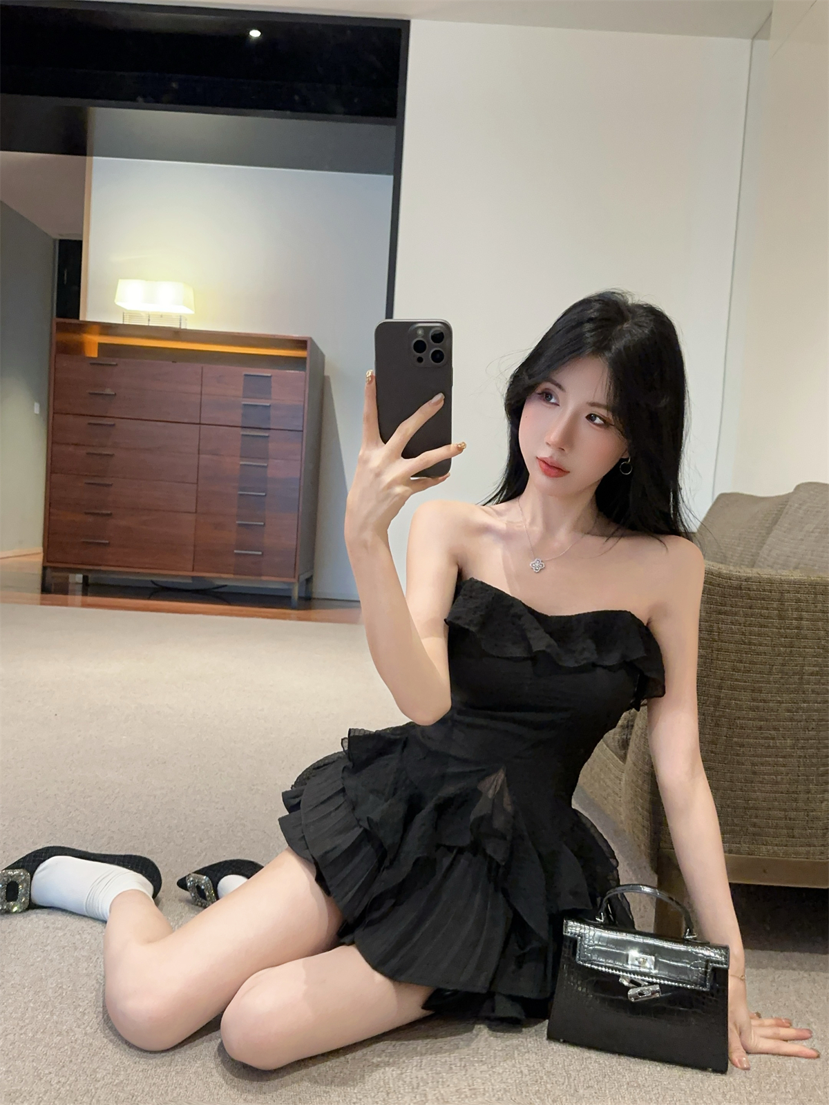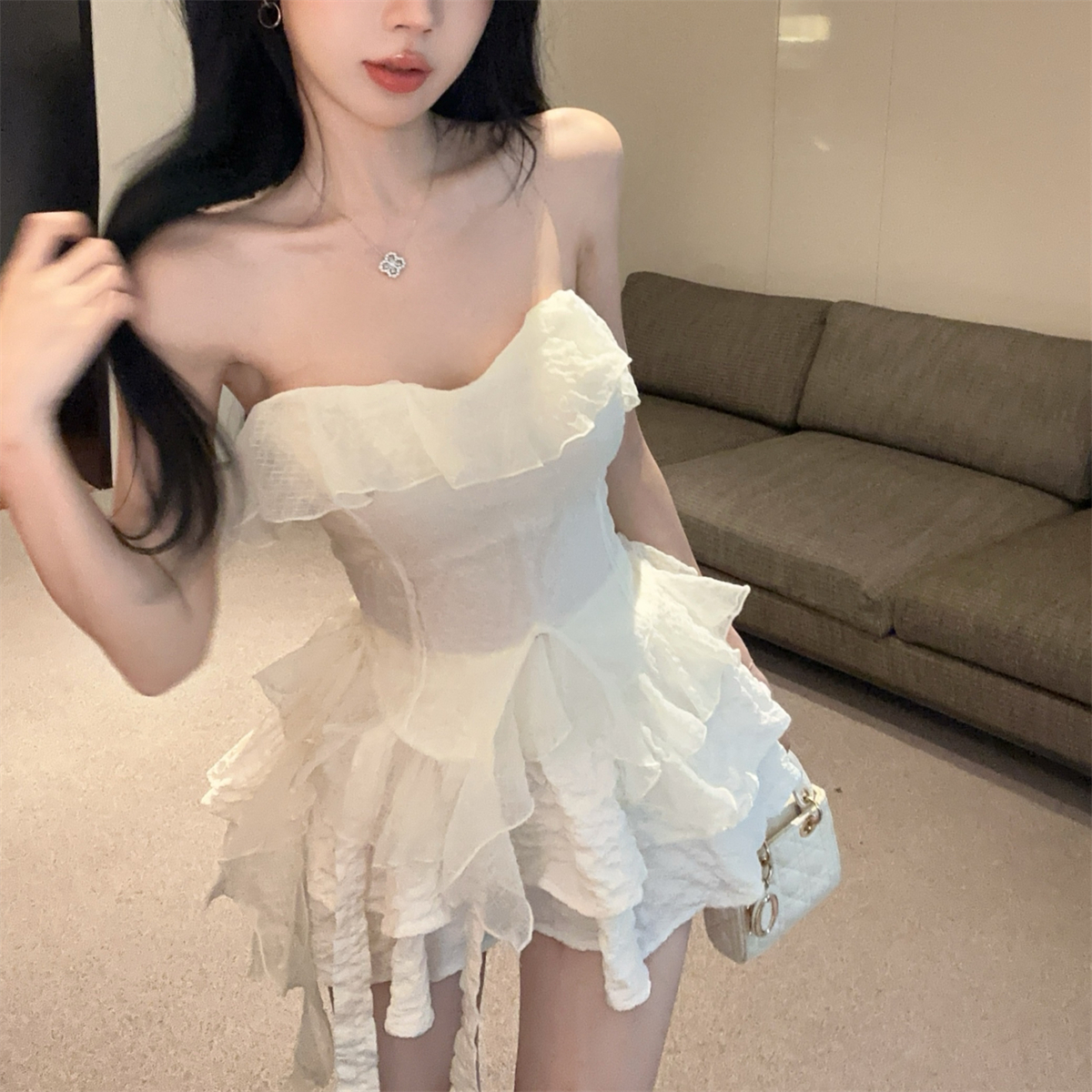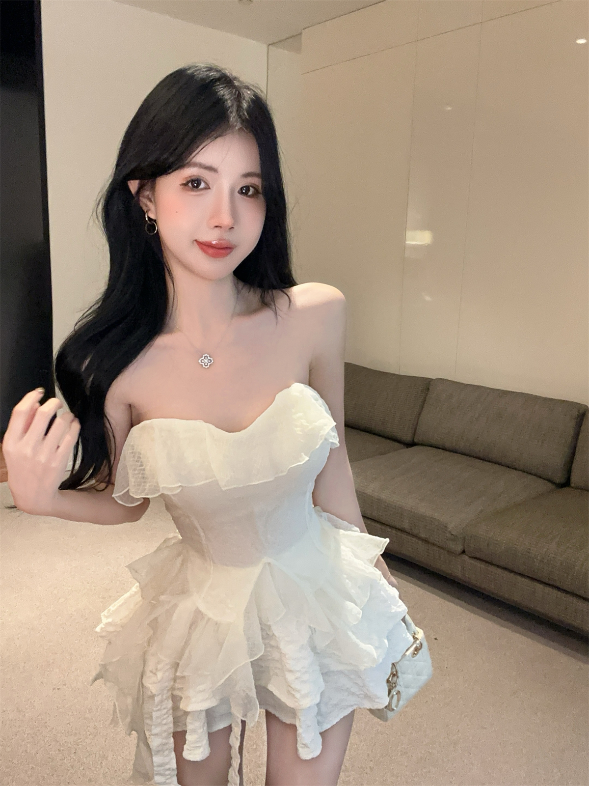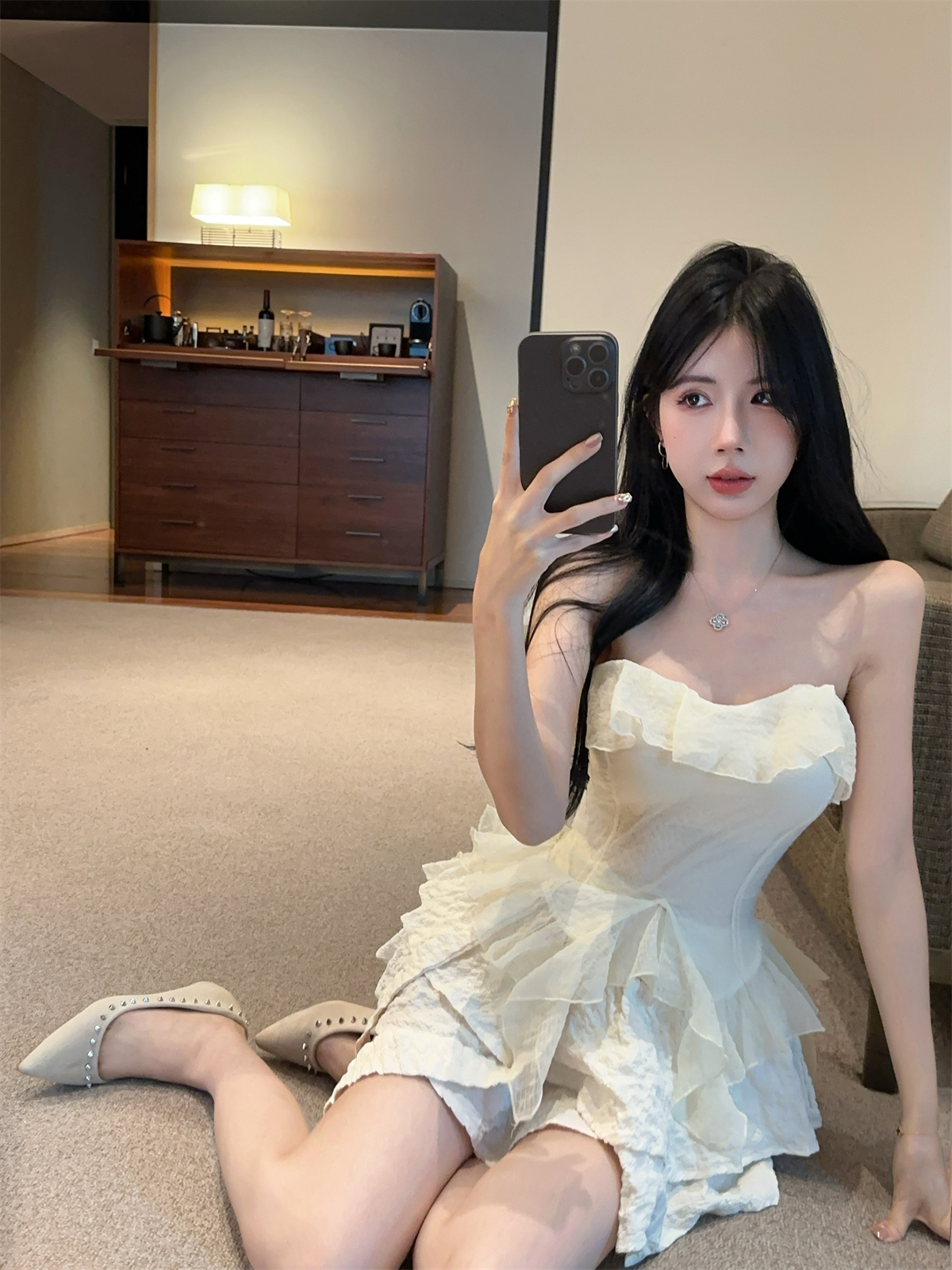 실제 촬영 및 실제 가격 러플 불규칙 튜브 탑 프렌치 쉬폰 탑 케이크 스커트 여성 패션 슈트