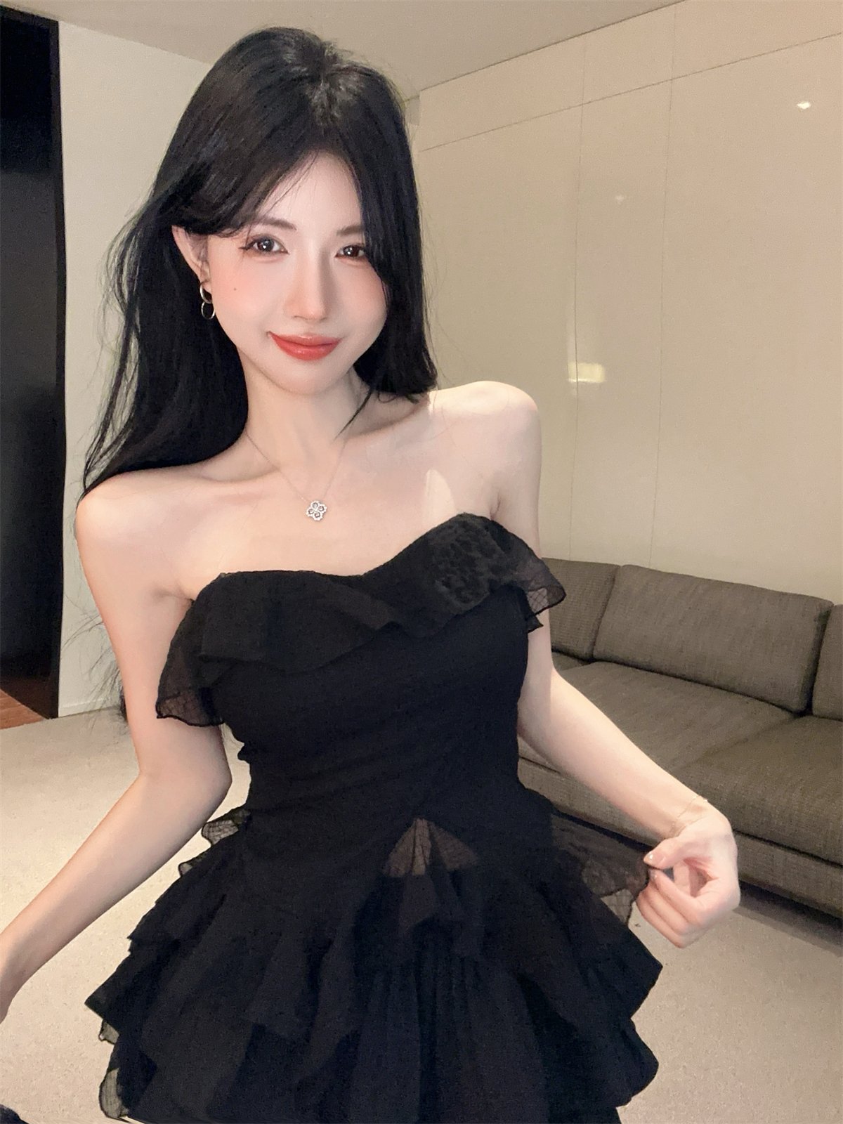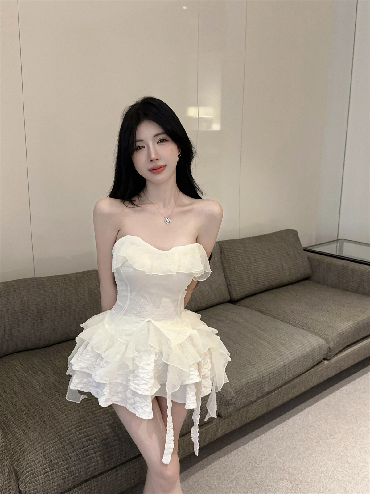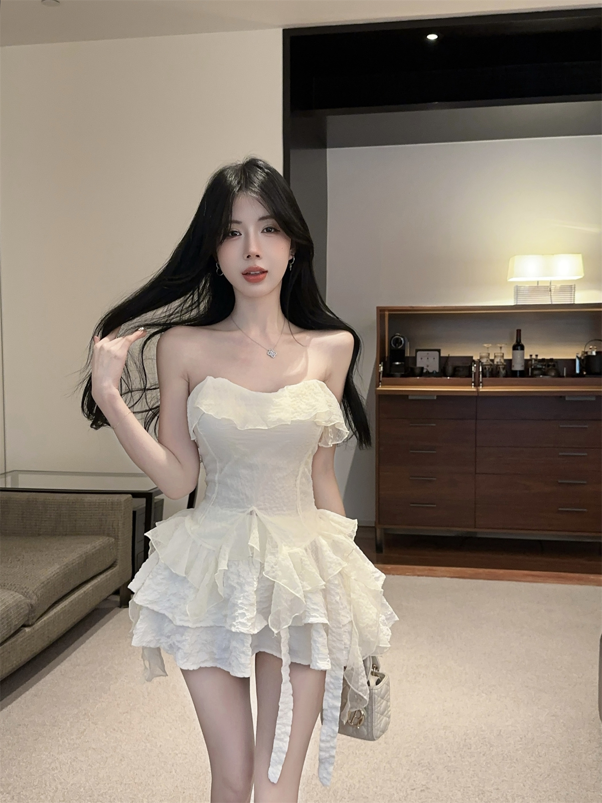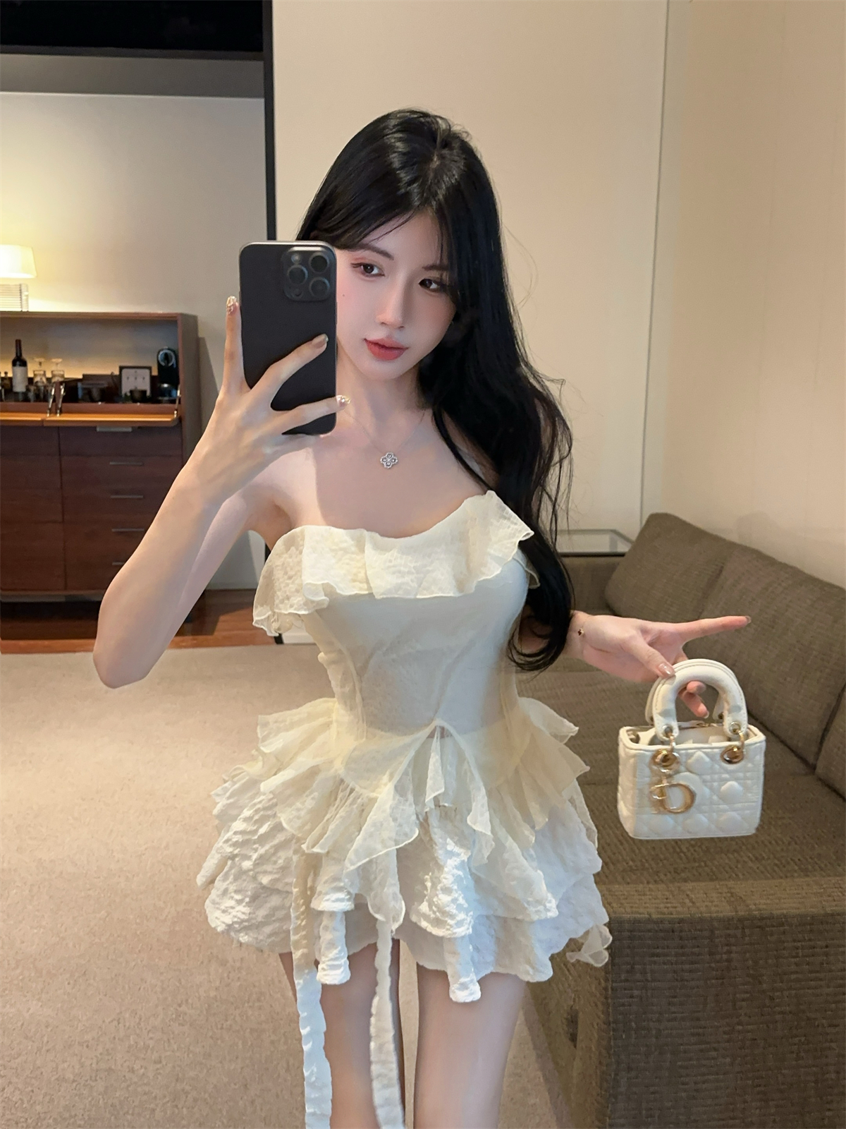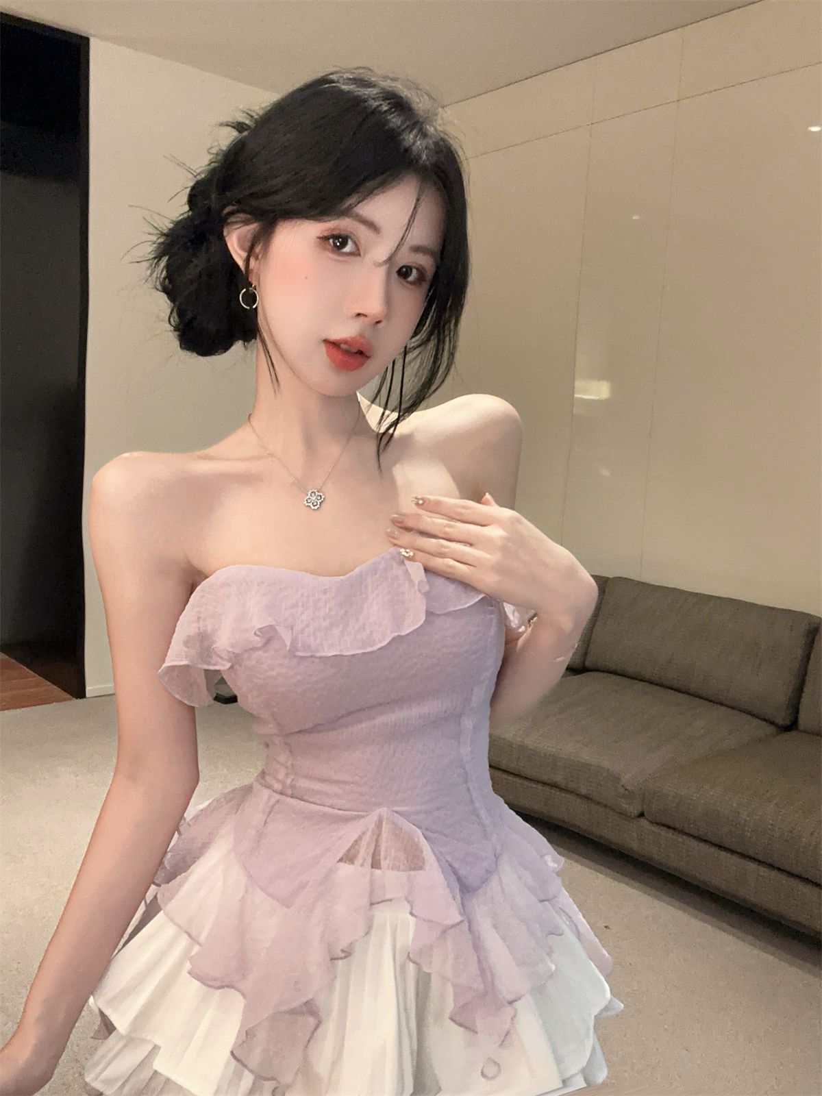 실제 촬영 및 실제 가격 러플 불규칙 튜브 탑 프렌치 쉬폰 탑 케이크 스커트 여성 패션 슈트