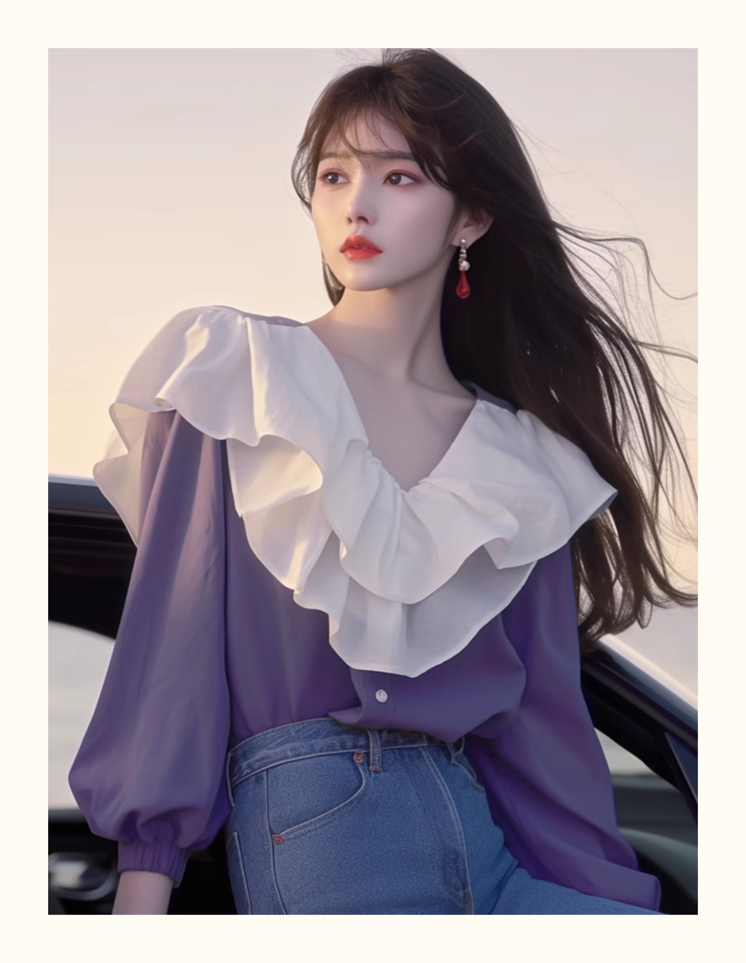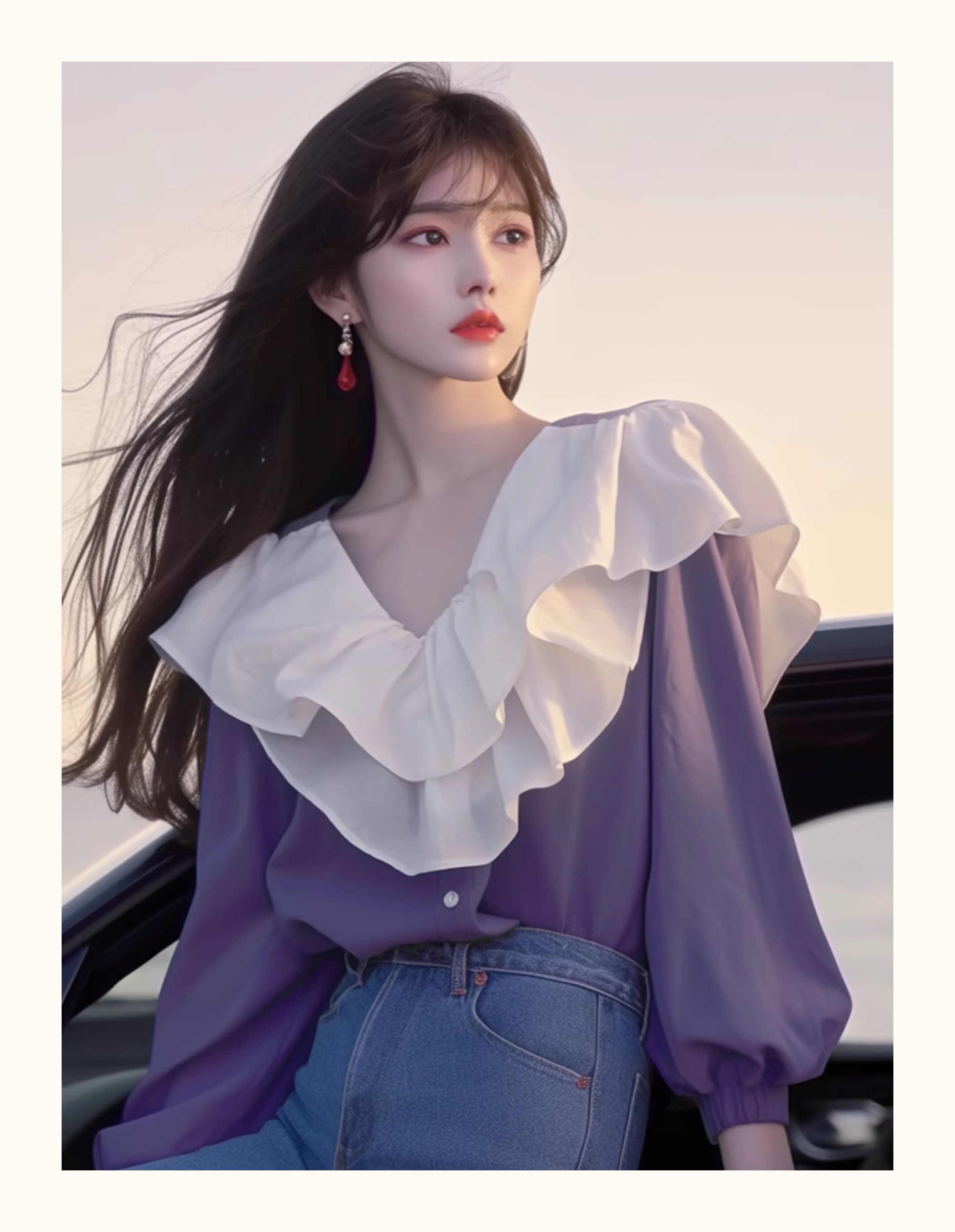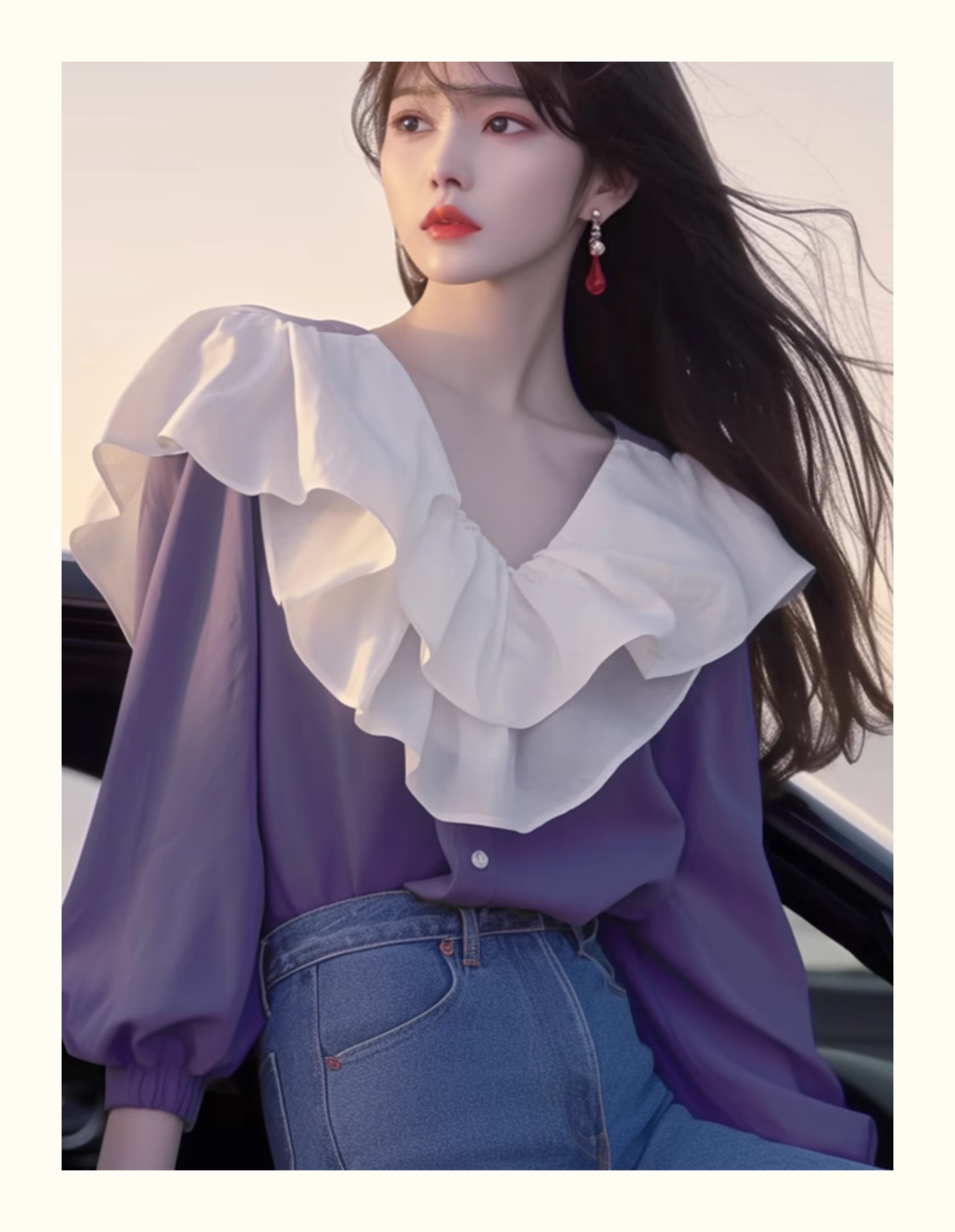 2024년 초가을 신상품 프렌치 스타일 시크 하이엔드 한국 스타일 나이를 줄여주는 달콤한 보라색 러플 스티칭 여성 셔츠