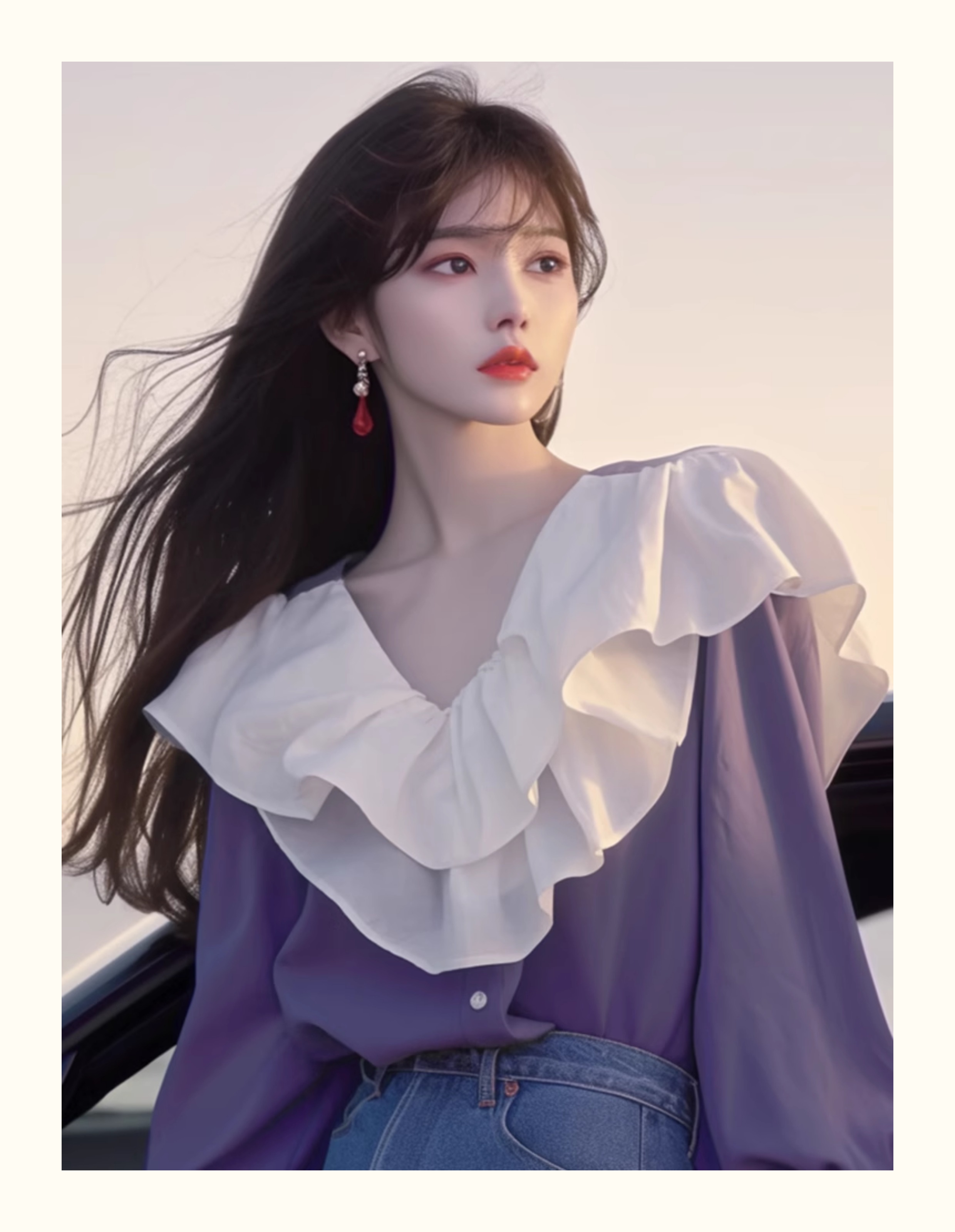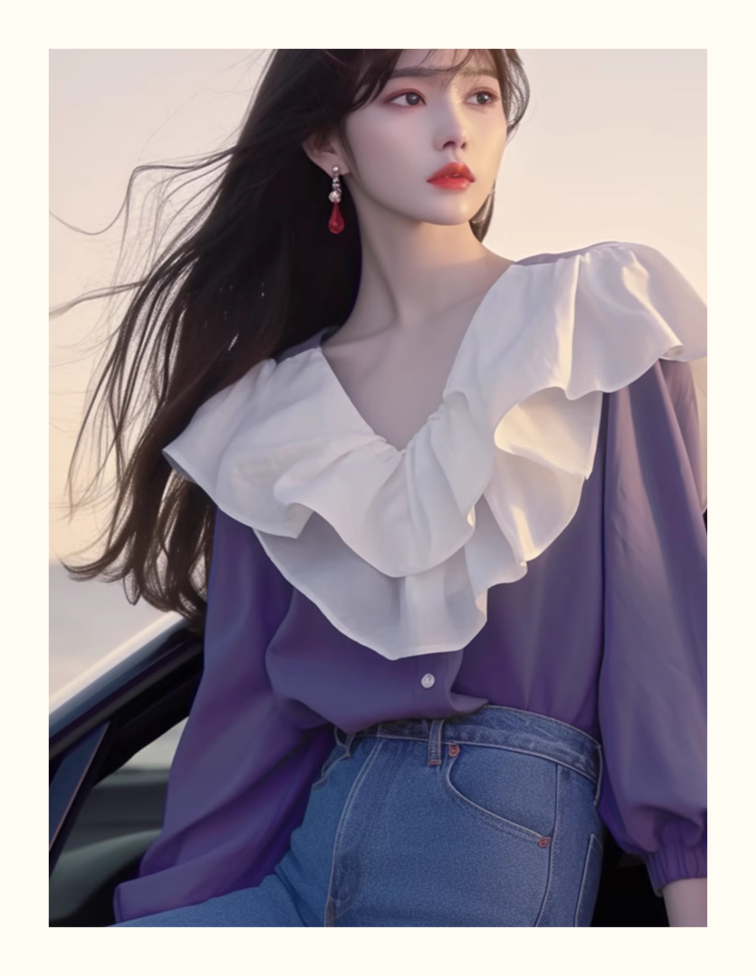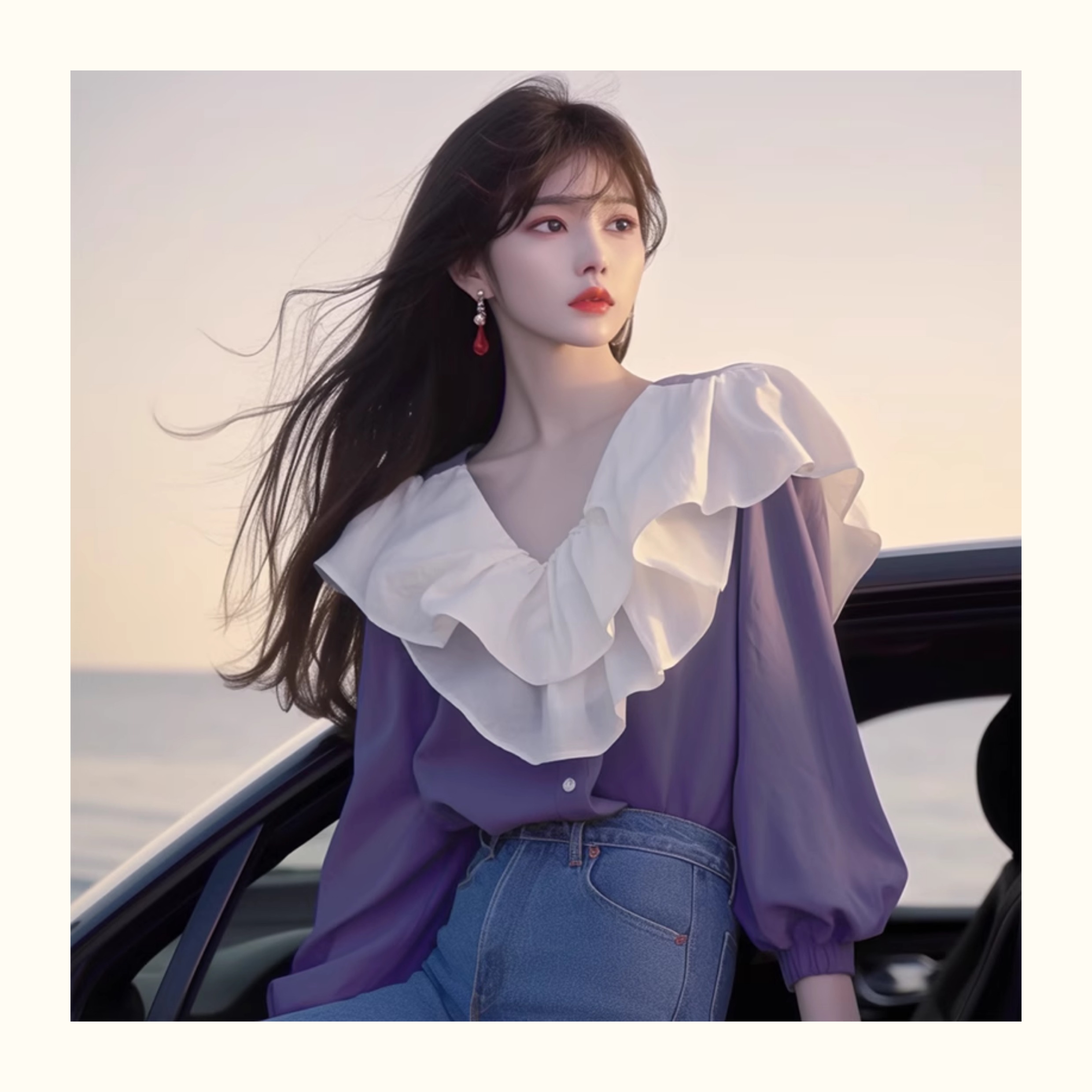 2024년 초가을 신상품 프렌치 스타일 시크 하이엔드 한국 스타일 나이를 줄여주는 달콤한 보라색 러플 스티칭 여성 셔츠