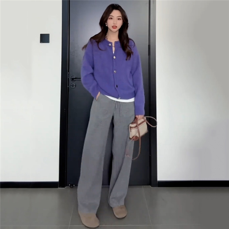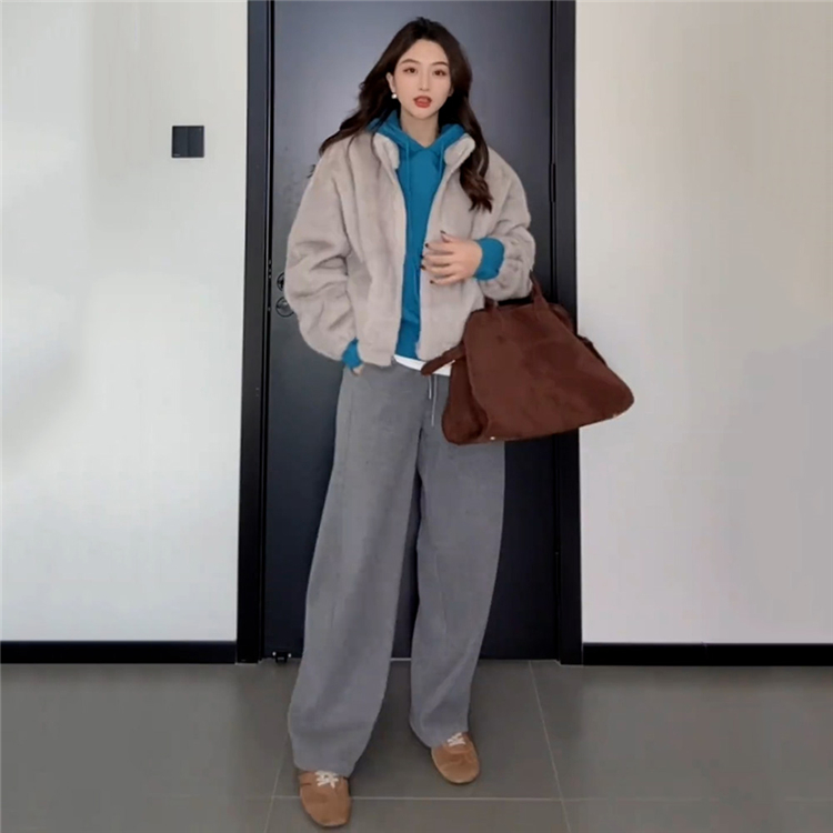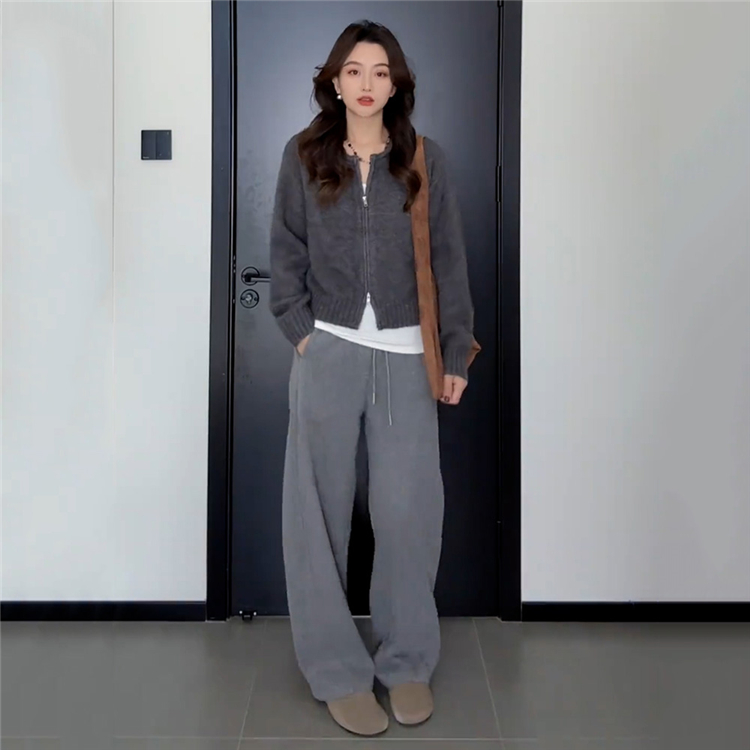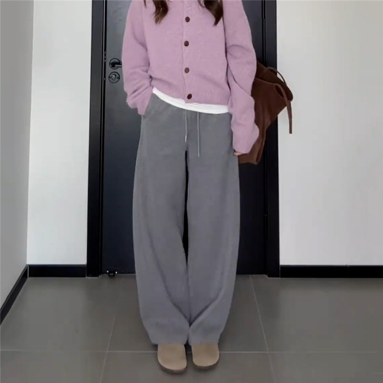 여성용 플러스 사이즈 플리스 안감 그레이 캐주얼 낫 레그 팬츠. 가을과 겨울에 딱 맞습니다. 뱃살 체형에 딱 맞는 신축성 있는 허리 디자인, 날씬해 보이는 와이드 레그 스타일.