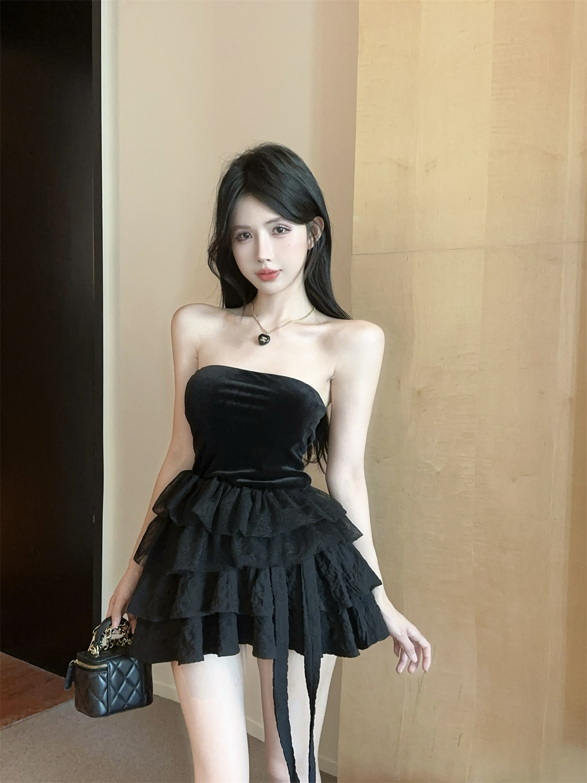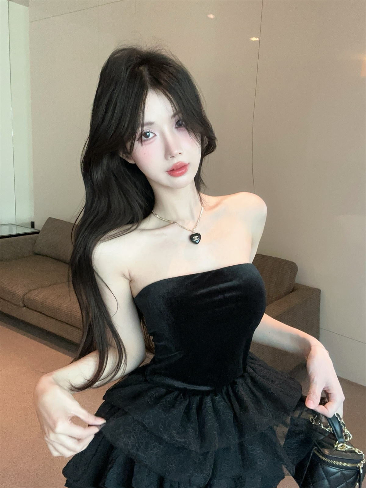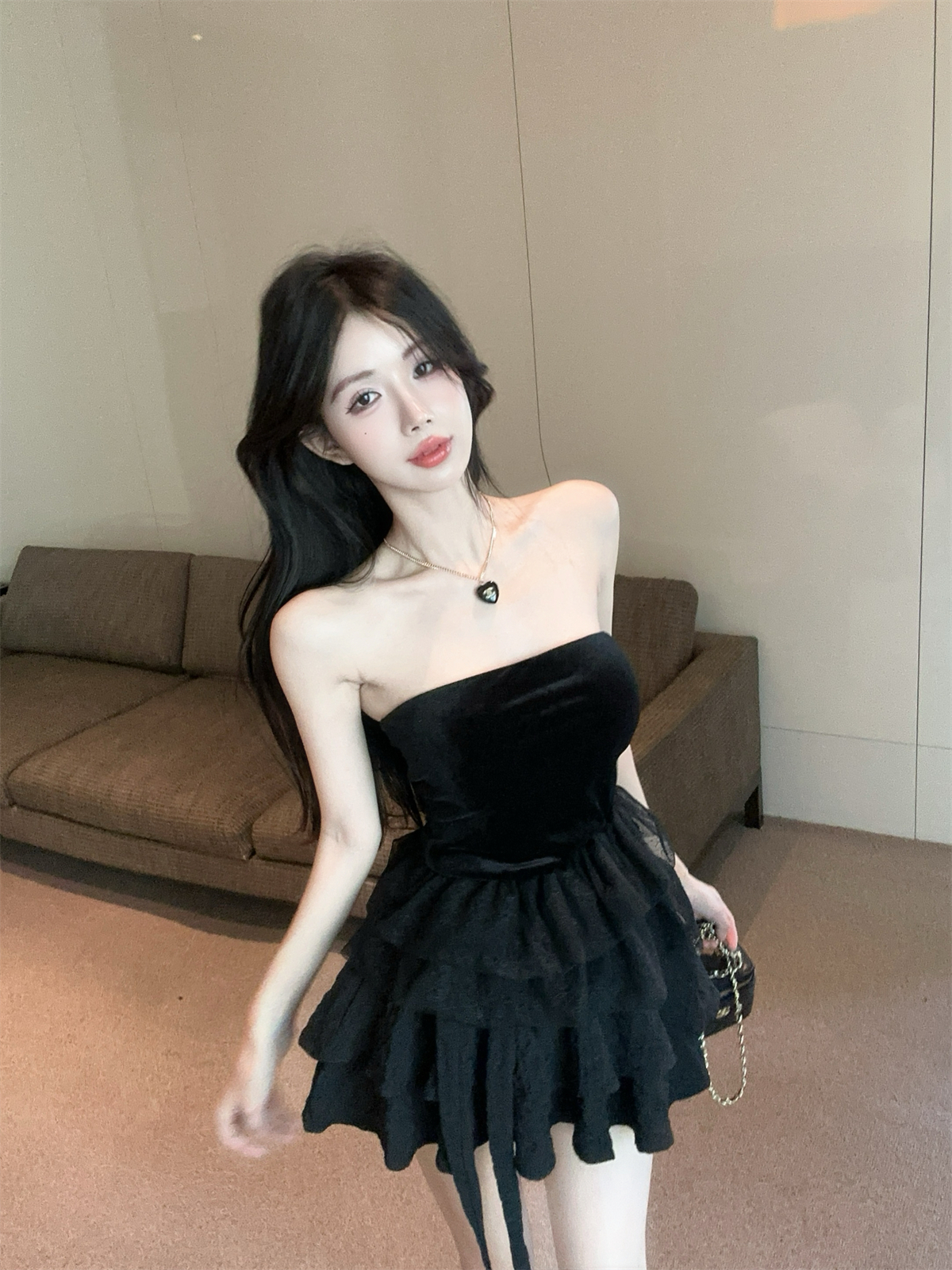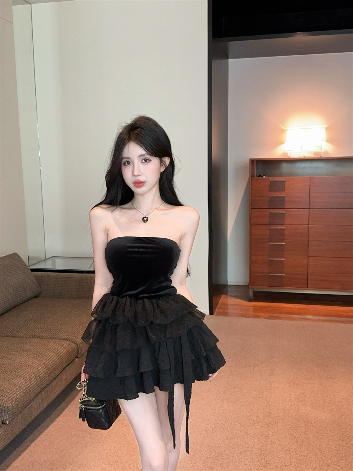 실제 촬영 및 실제 가격 퓨어 디자이어 벨벳 및 레이스 튜브 탑, 가슴 패드 리본 케이크 스커트 여성 정장