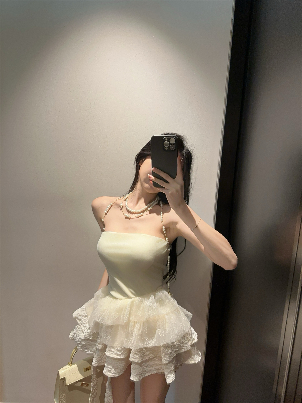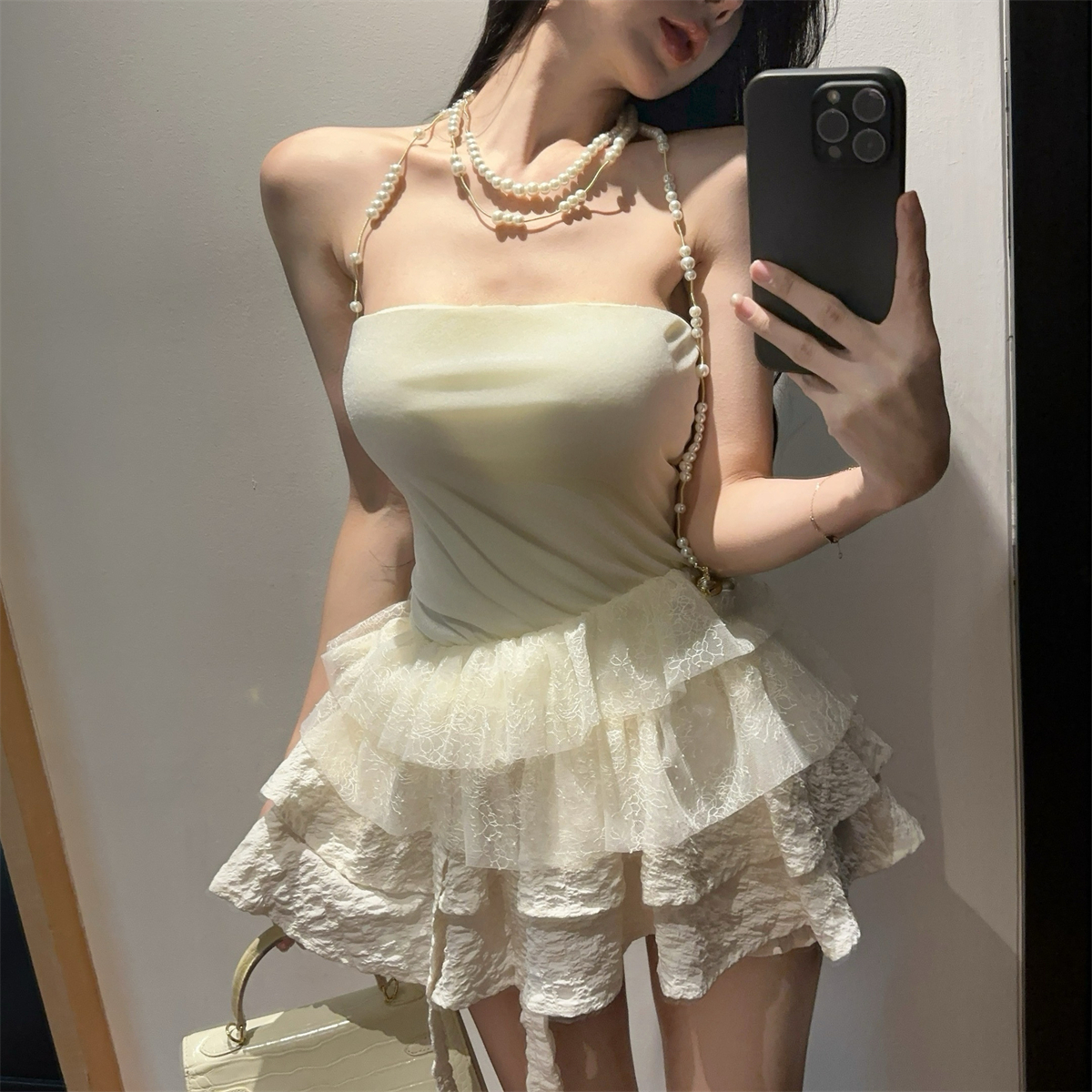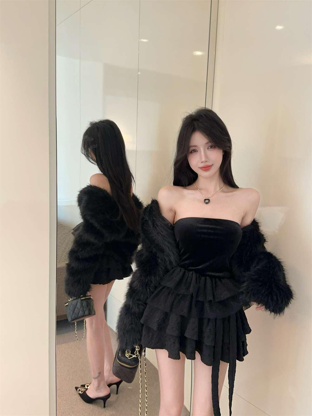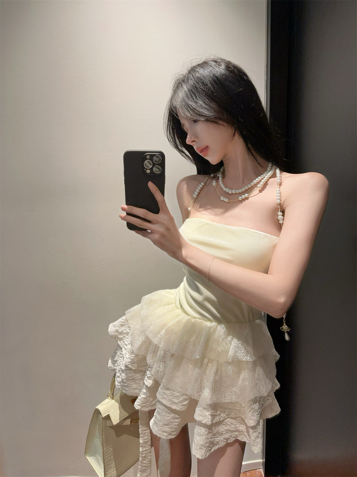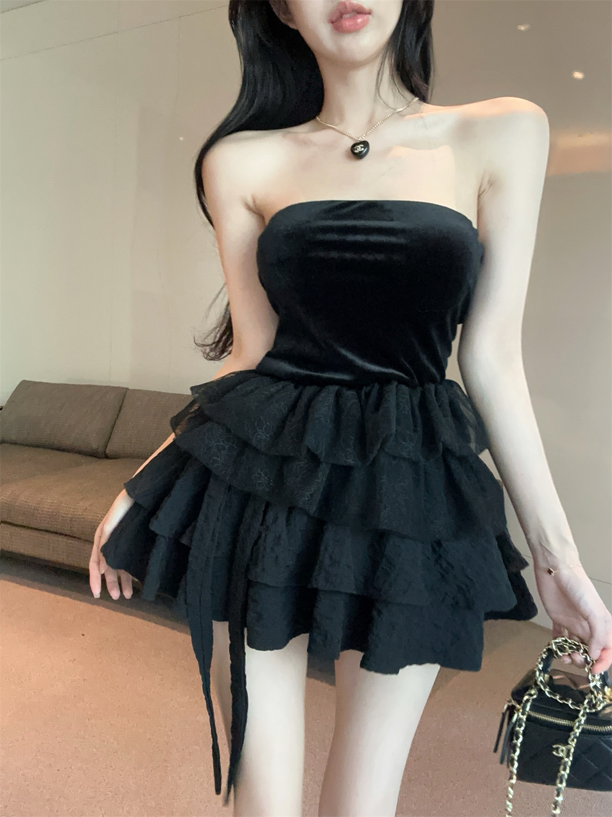 실제 촬영 및 실제 가격 퓨어 디자이어 벨벳 및 레이스 튜브 탑, 가슴 패드 리본 케이크 스커트 여성 정장