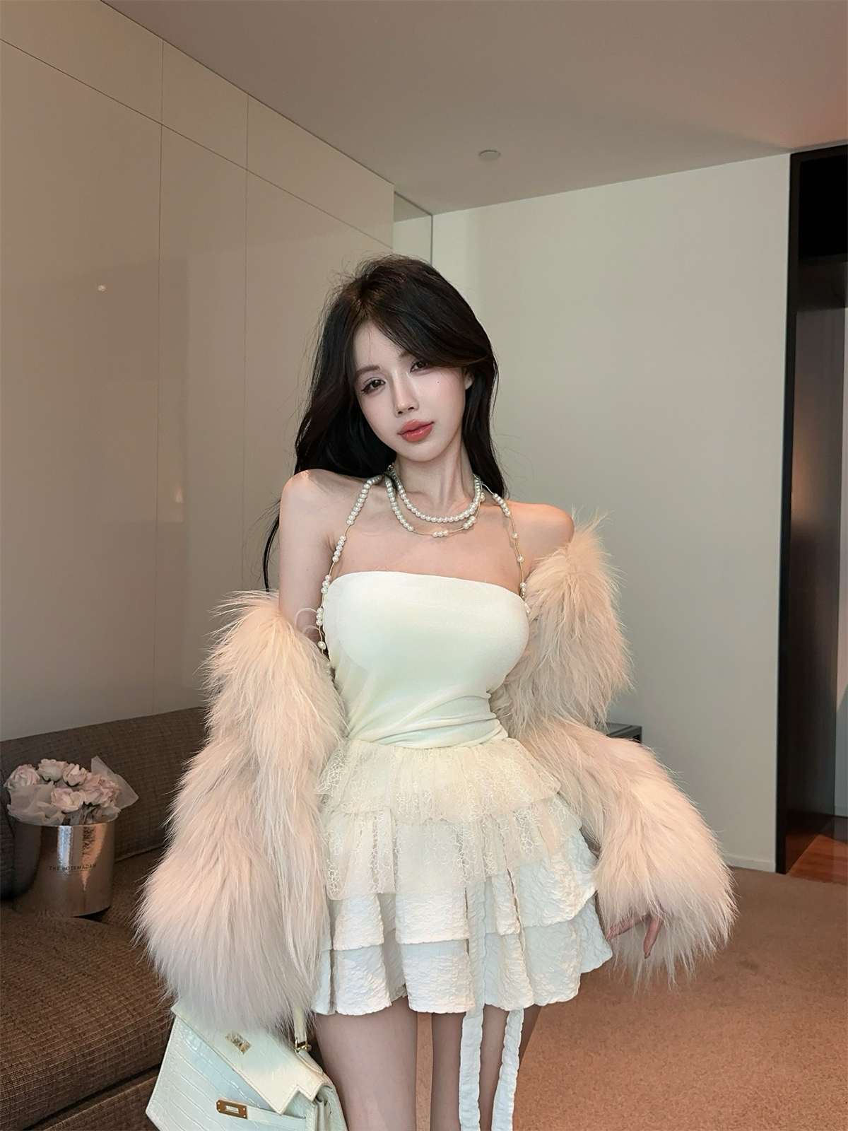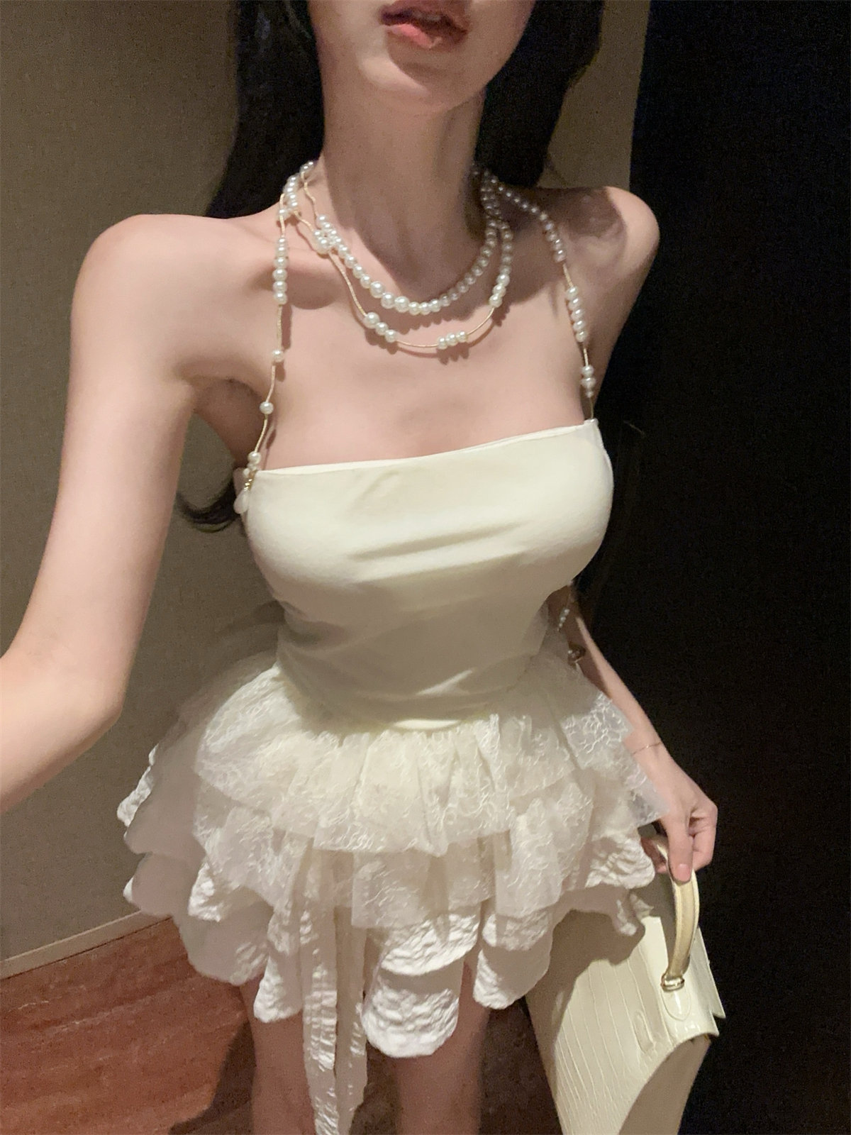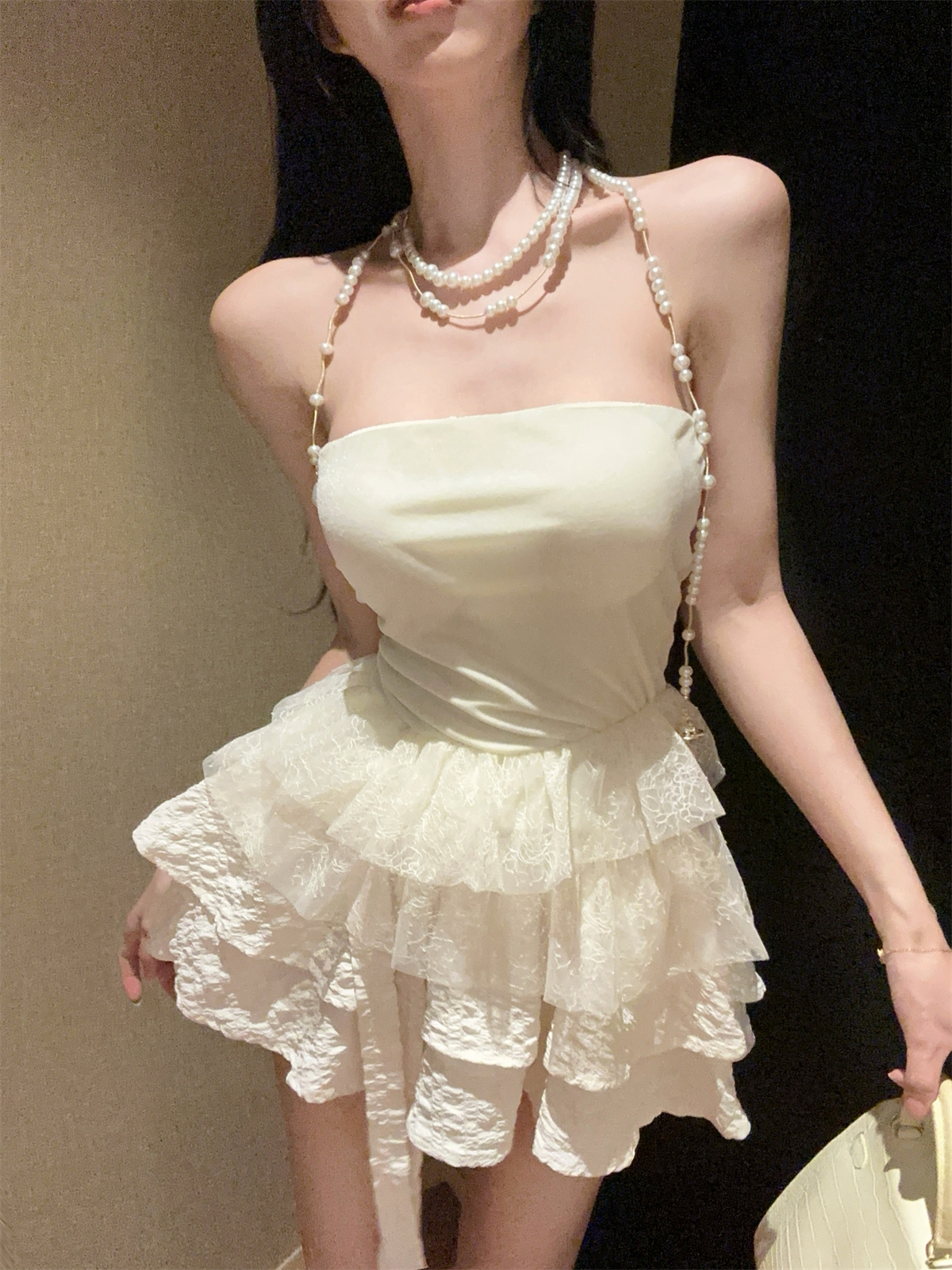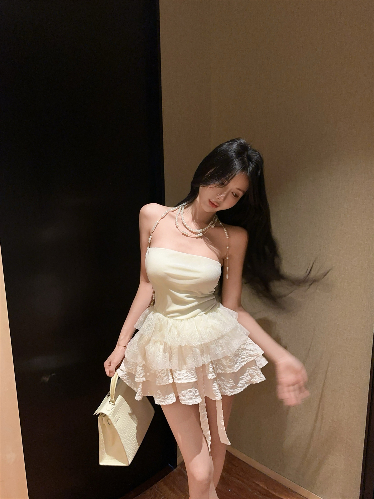 실제 촬영 및 실제 가격 퓨어 디자이어 벨벳 및 레이스 튜브 탑, 가슴 패드 리본 케이크 스커트 여성 정장