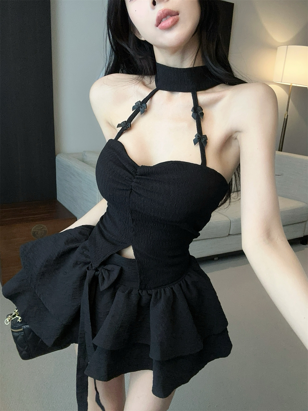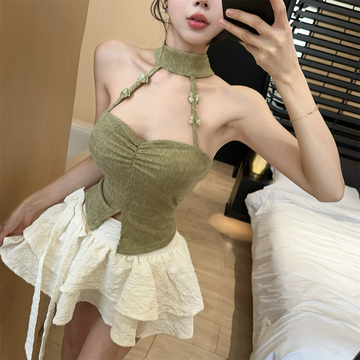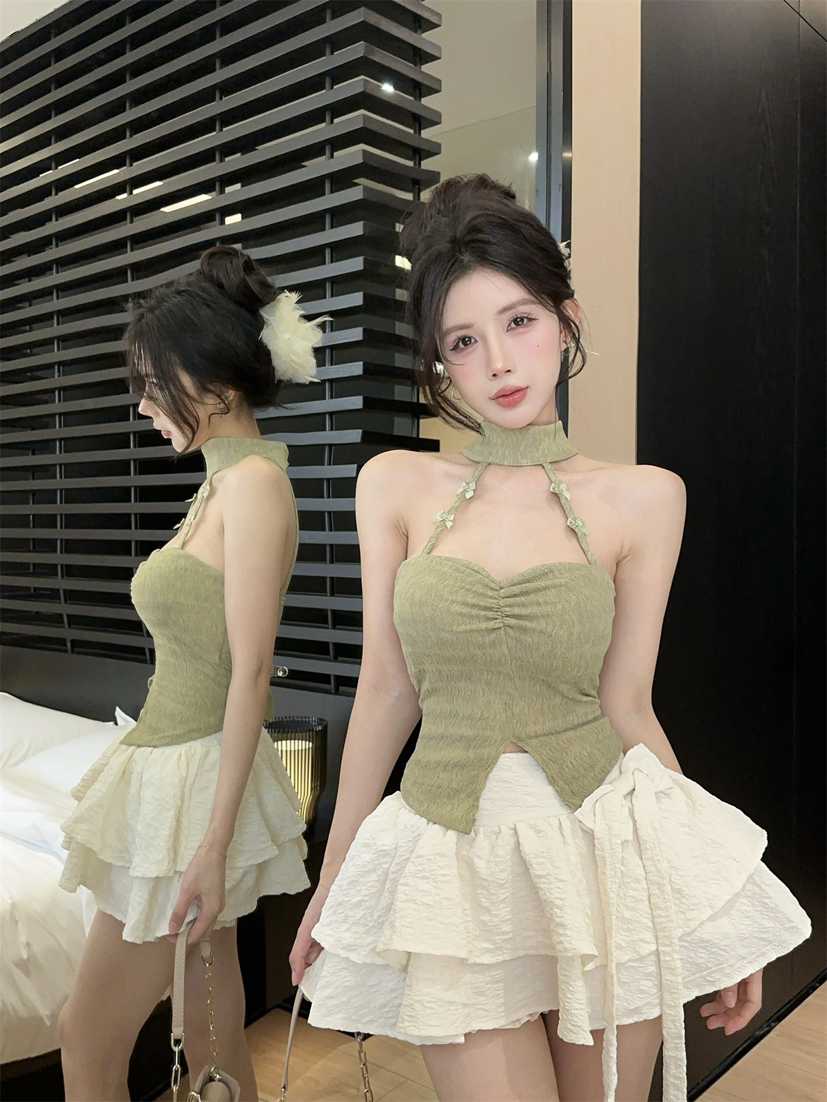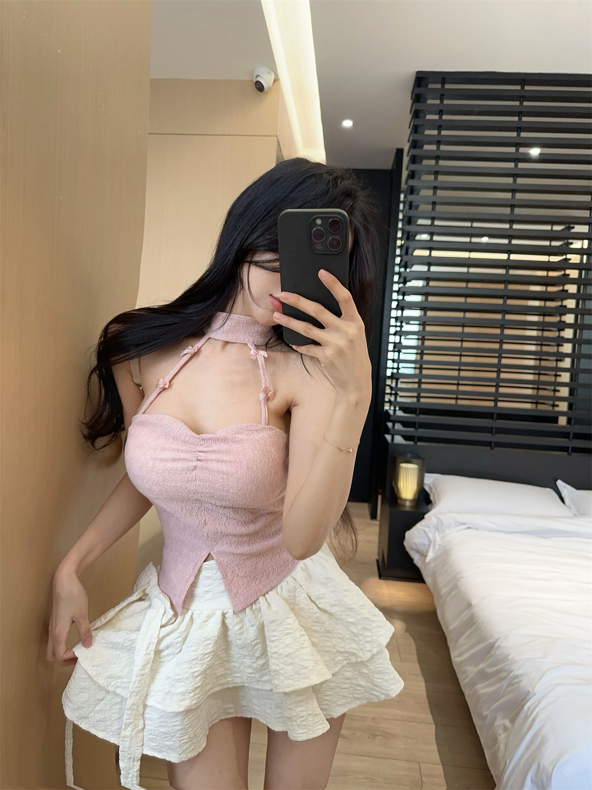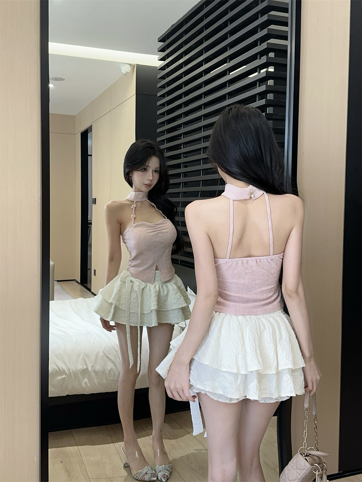 실제 촬영 및 실제 가격 달콤하고 매콤한 디자인 홀터넥 리본 플리츠 퓨어 디자이어 탑 케이크 스커트 여성 스프링 슈트
