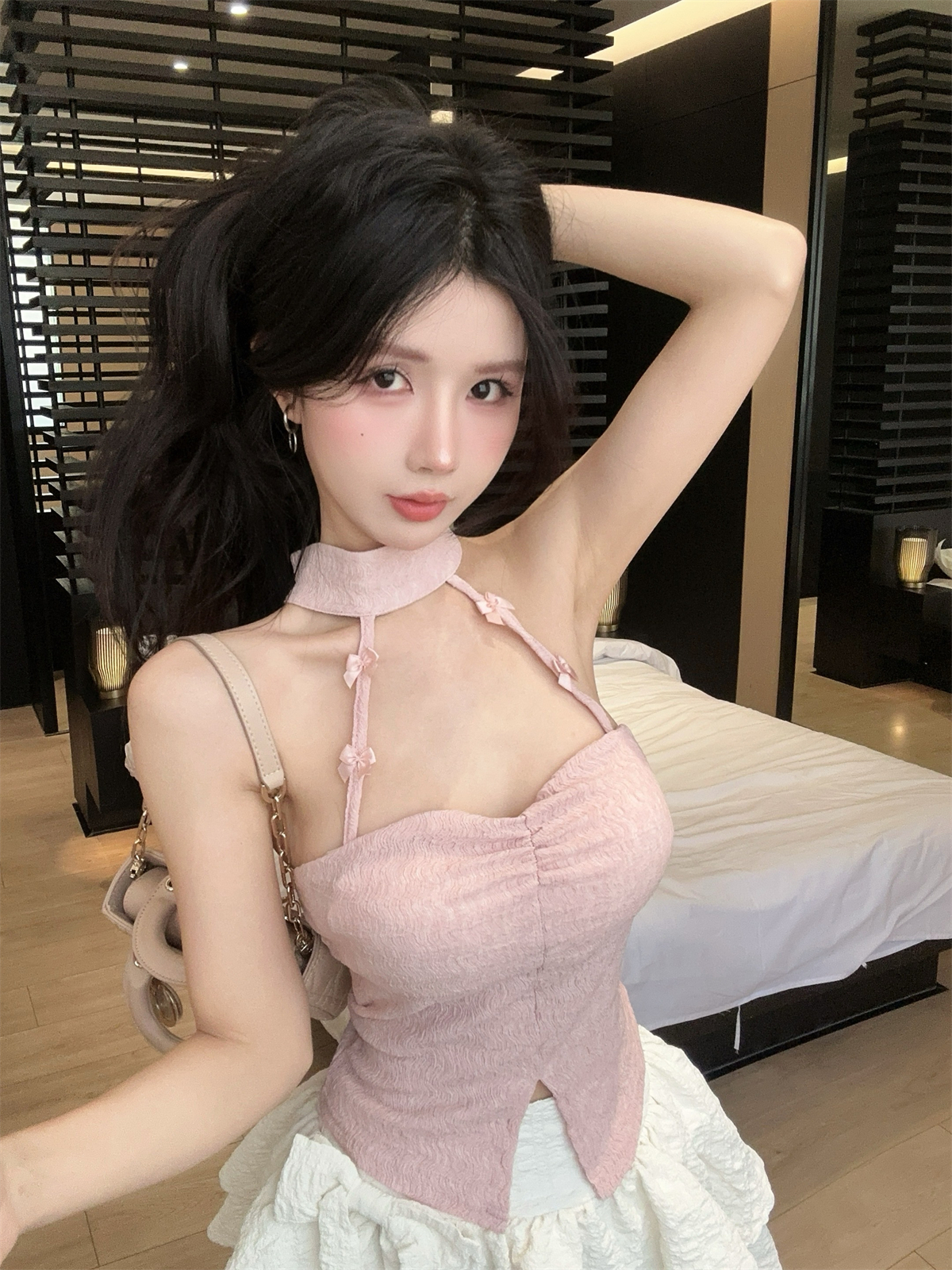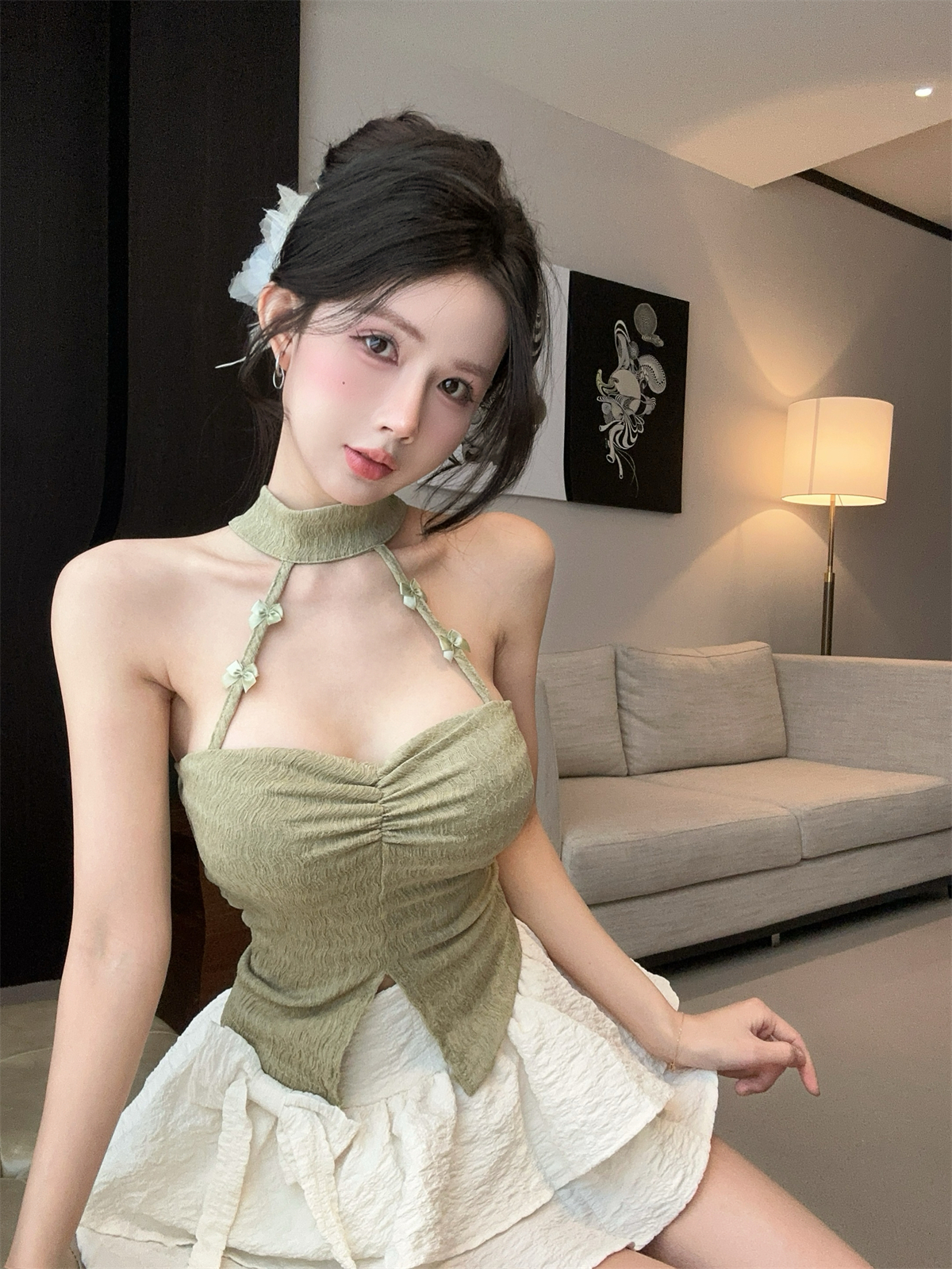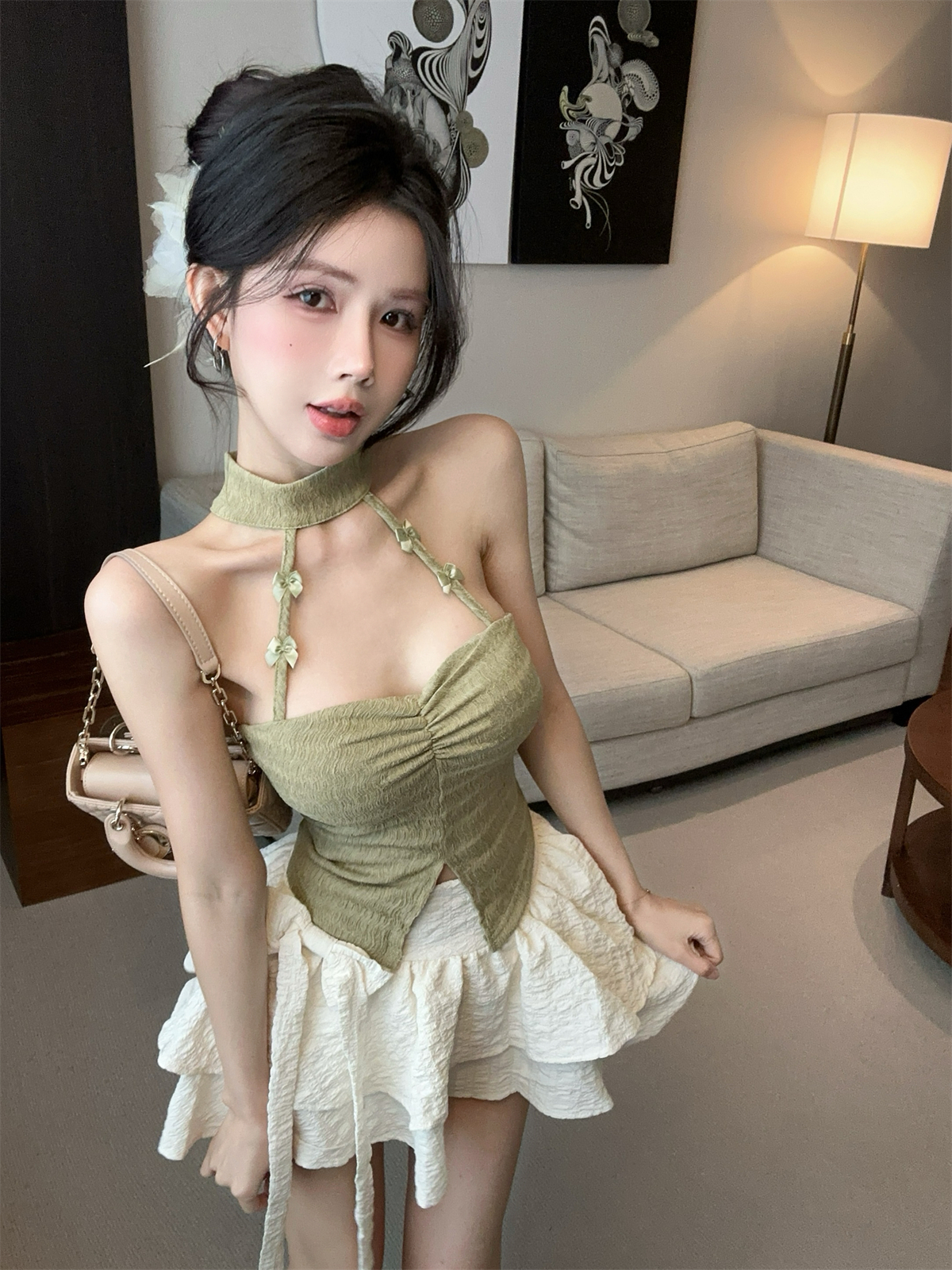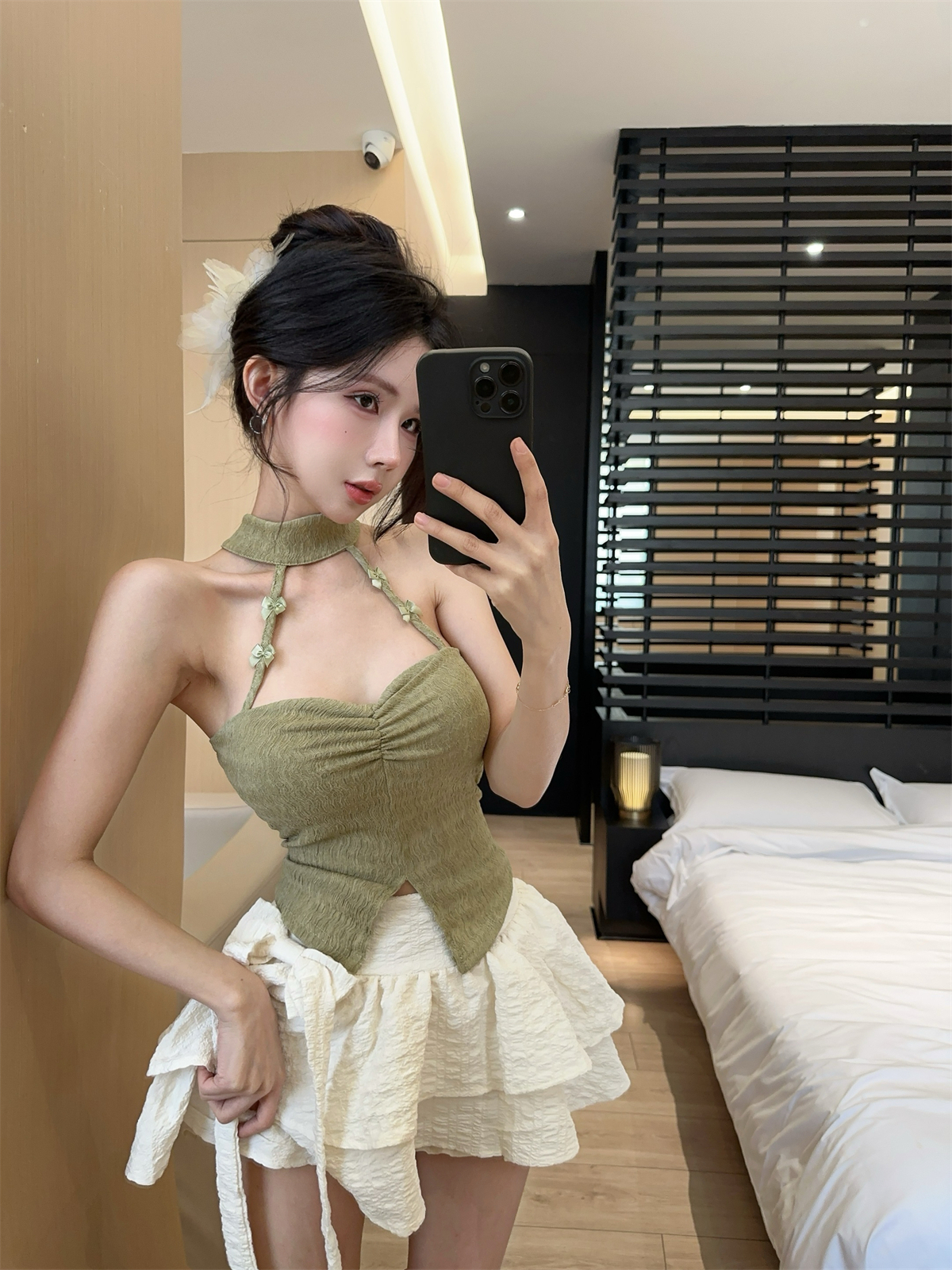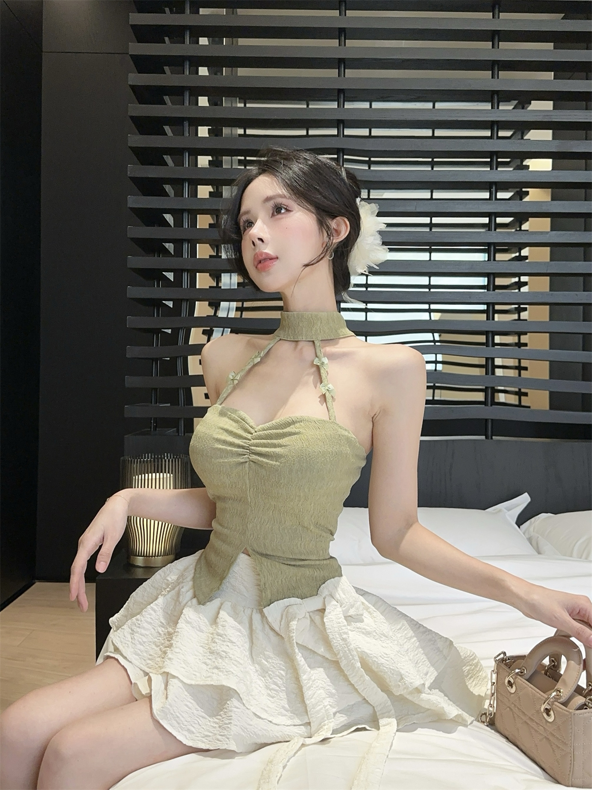 실제 촬영 및 실제 가격 달콤하고 매콤한 디자인 홀터넥 리본 플리츠 퓨어 디자이어 탑 케이크 스커트 여성 스프링 슈트
