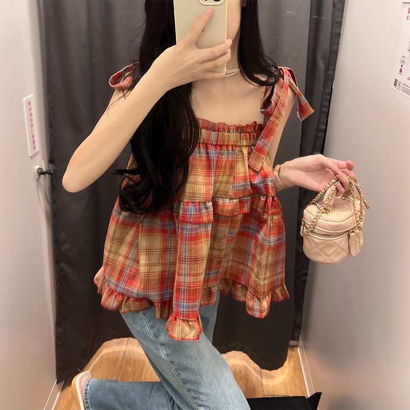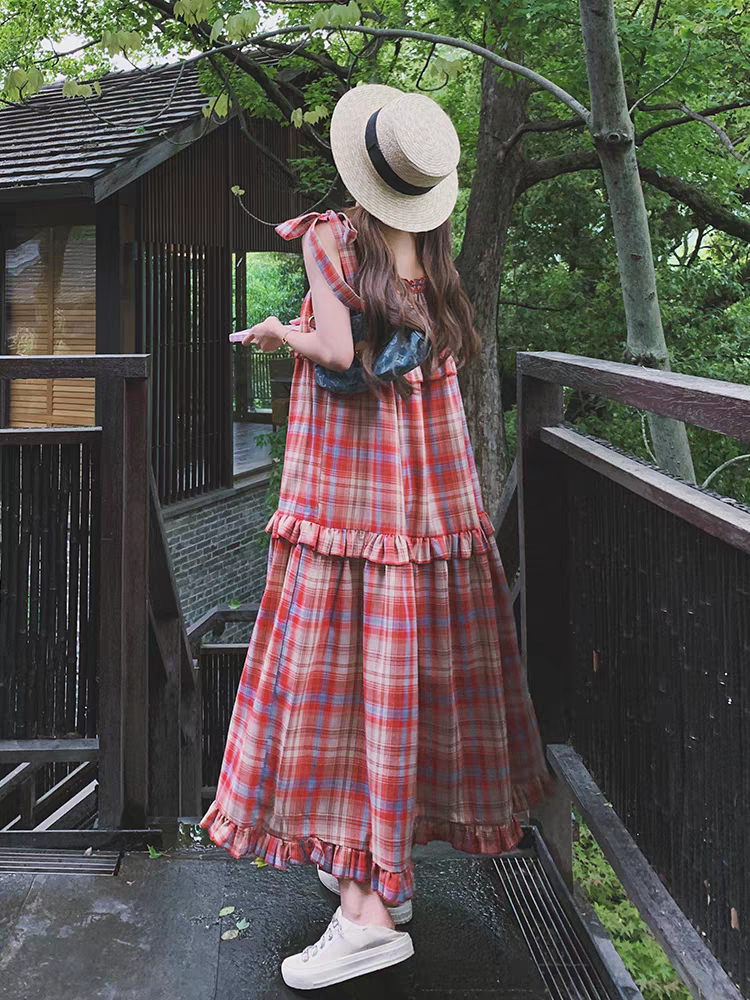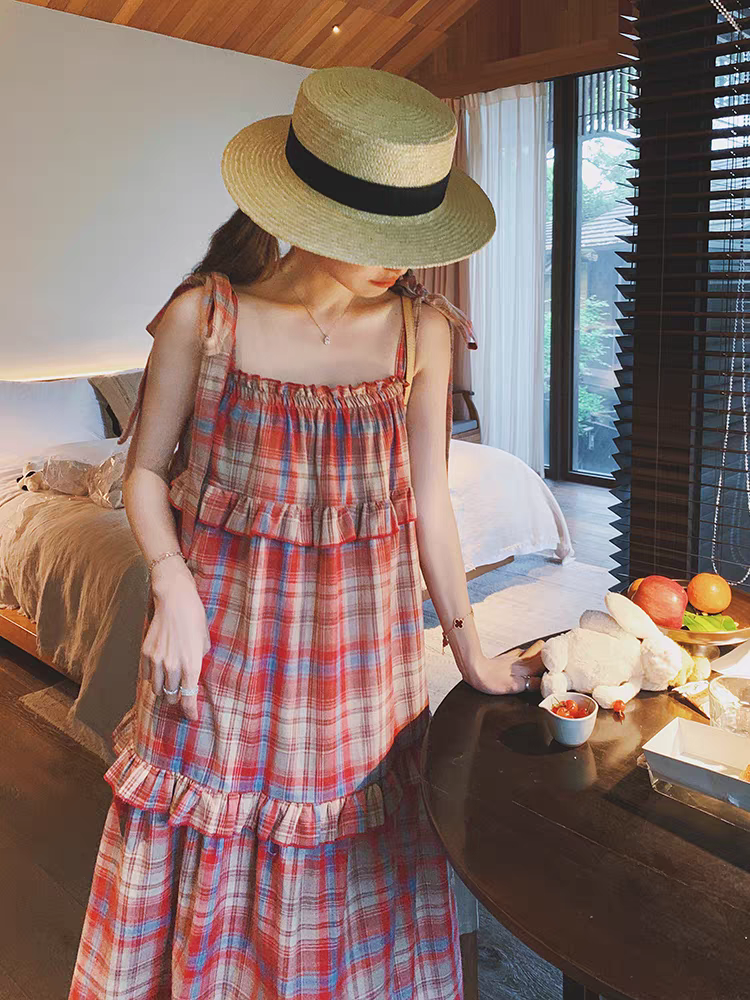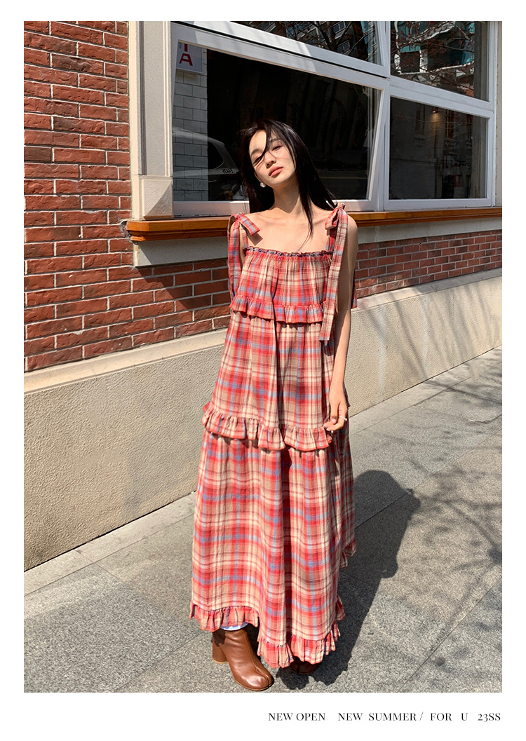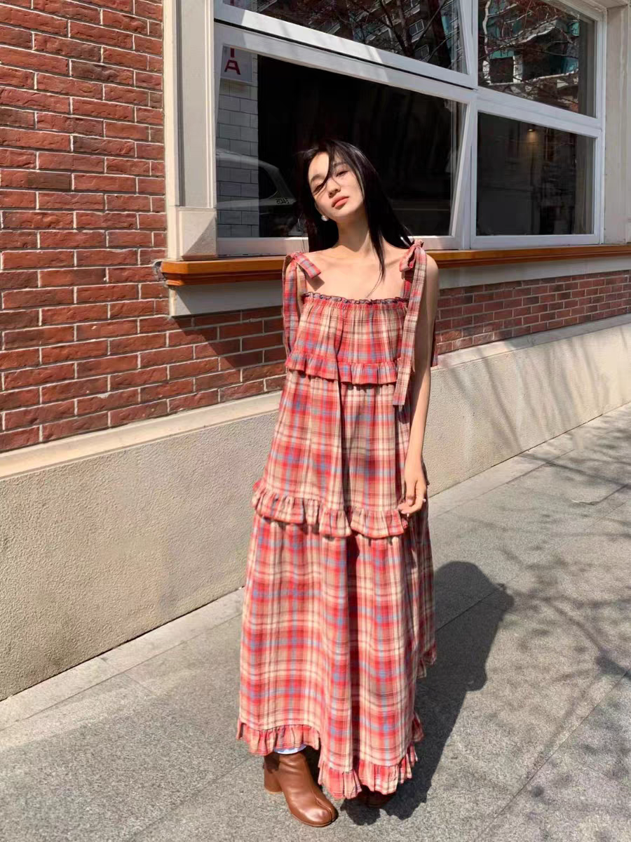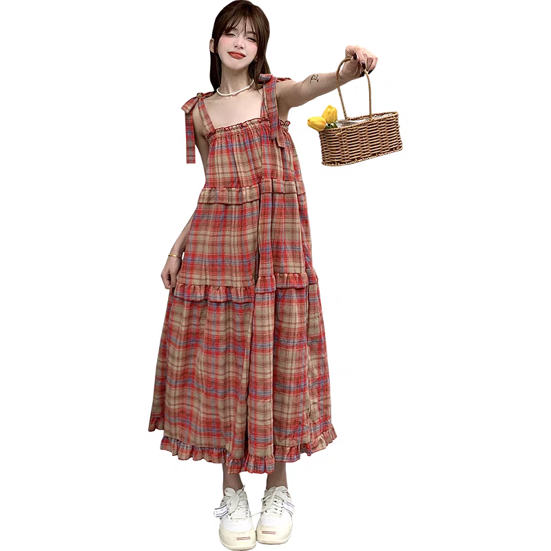 法式复古高级感格子连衣裙女夏2025新款大码宽松显瘦蛋糕吊带长裙
