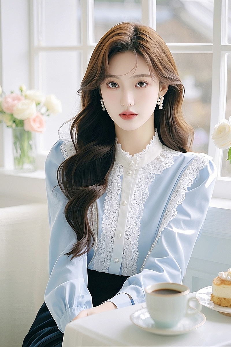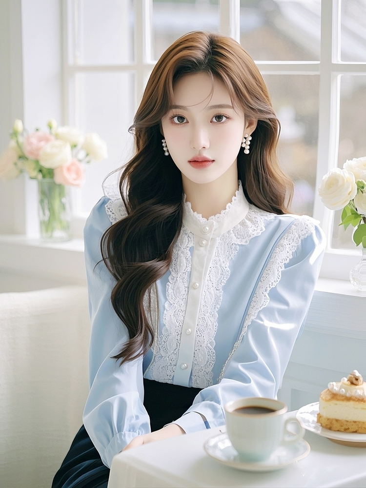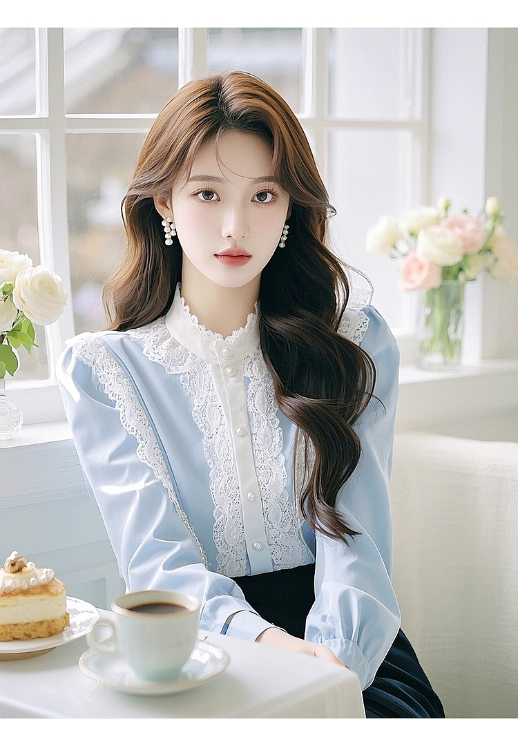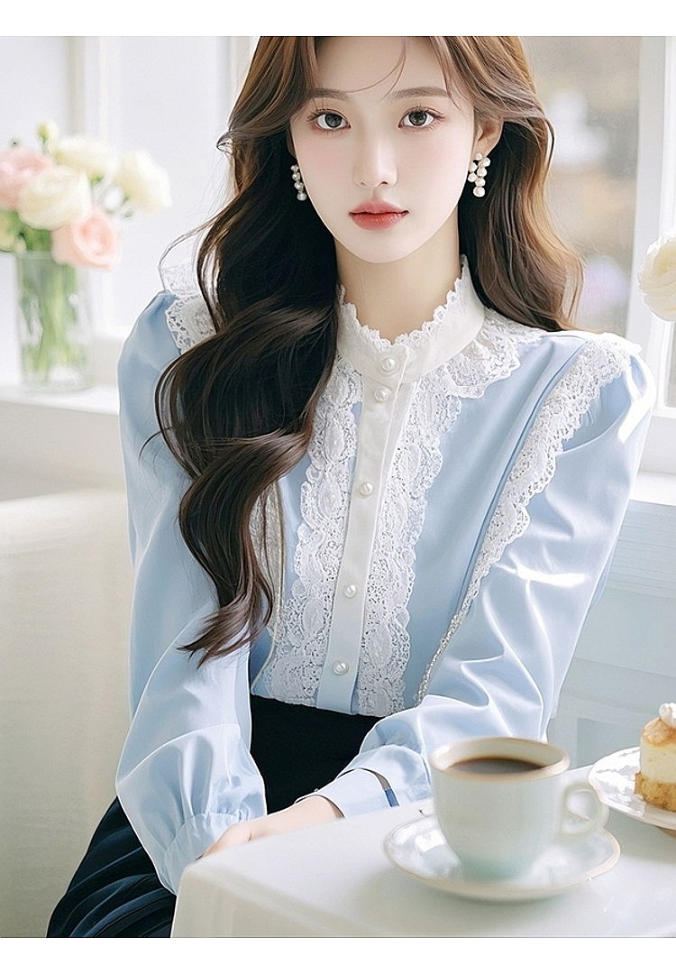 2025年高端气质蓝色宫廷蕾丝立领衬衫女春季小众独特别致上衣