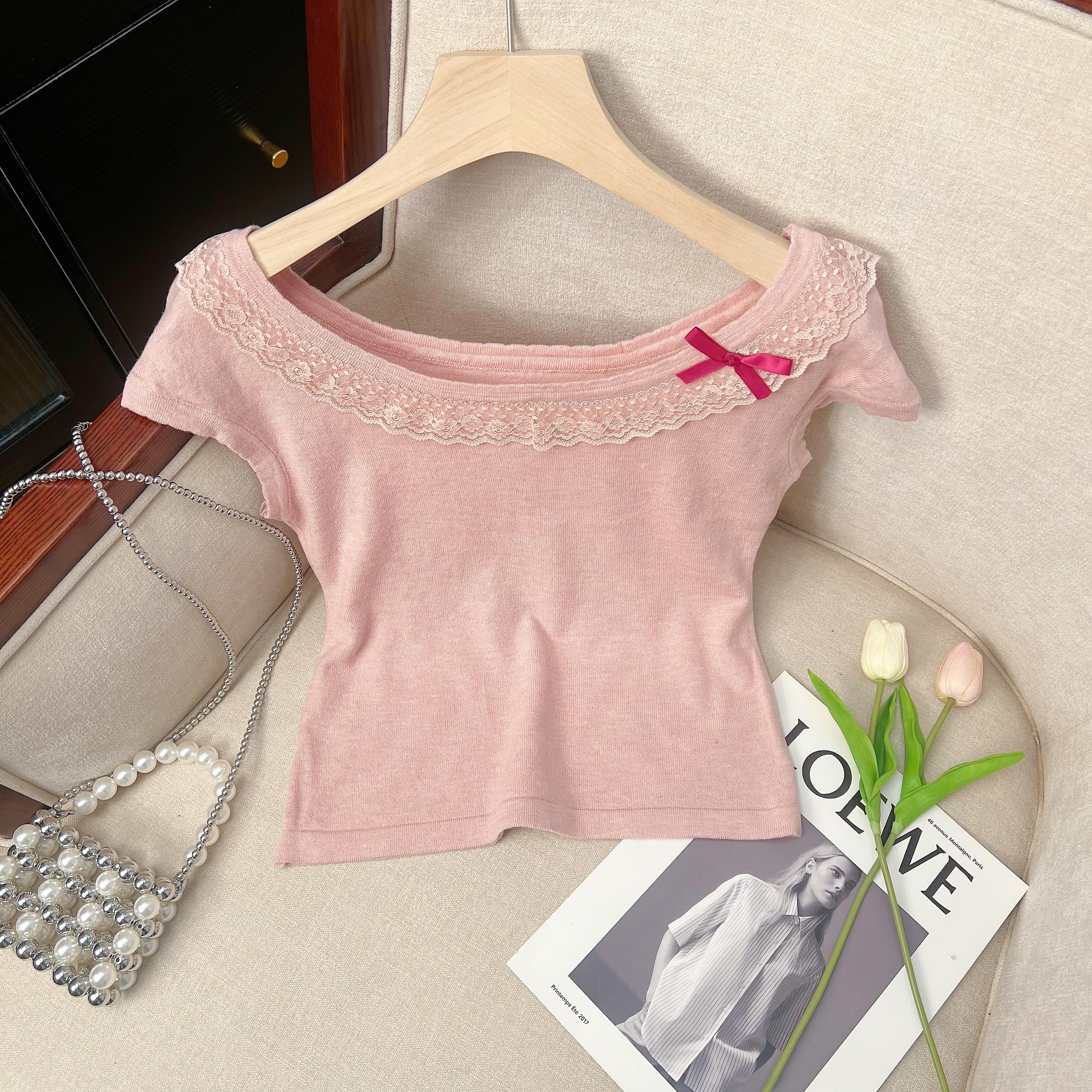 여성용 순수하고 매혹적인 리본 니트 반팔 티셔츠의 실제 사진입니다. 레이스 트림과 몸에 꼭 맞는 핏이 특징인 2025년 여름 신상품, 한국 패션입니다.